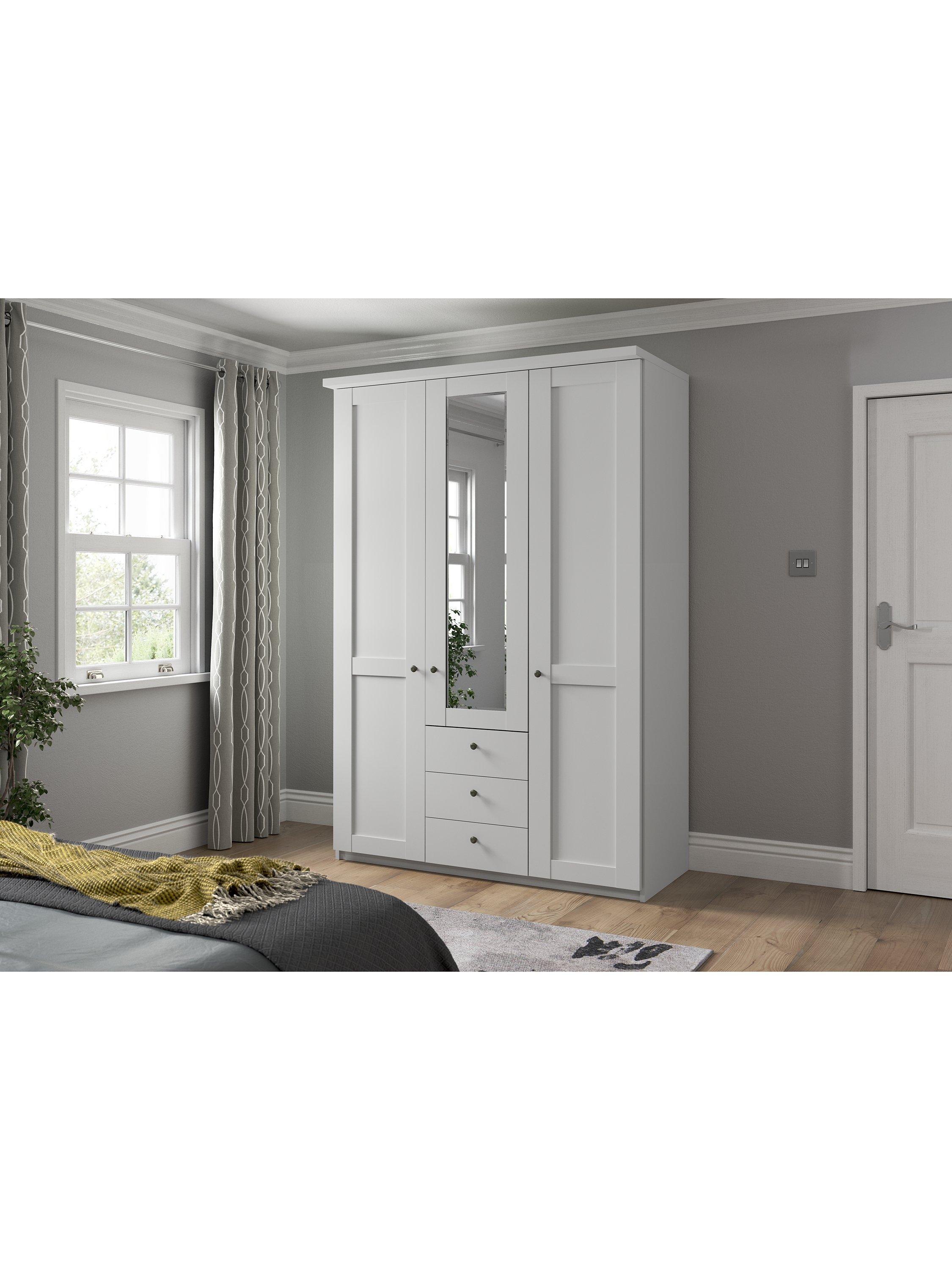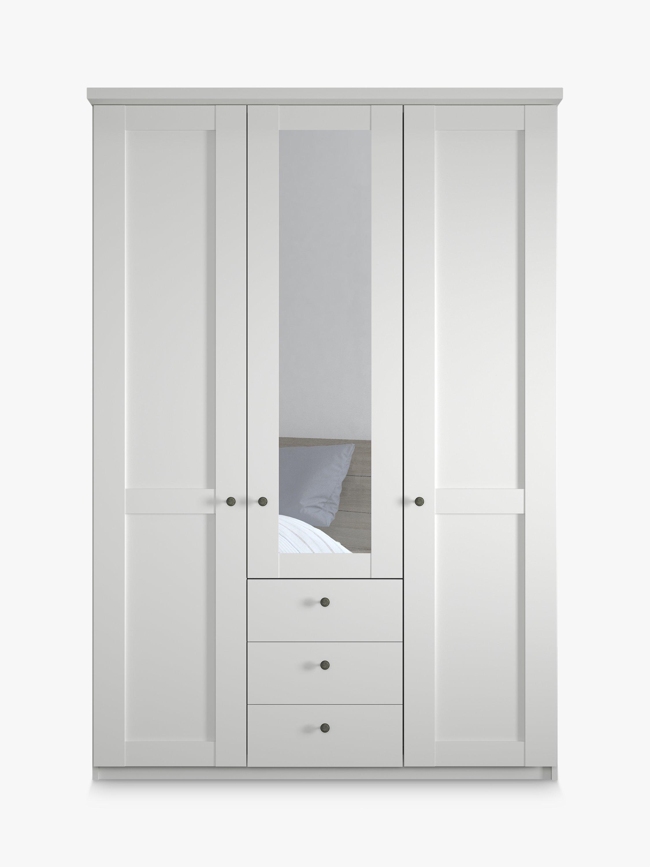 This three-door wardrobe has three drawers below the mirrored middle door. The interior has three single compartments. Each compartment is completed with two shelves and a hanging rail, all of which are fully adjustable to suit your requirements.