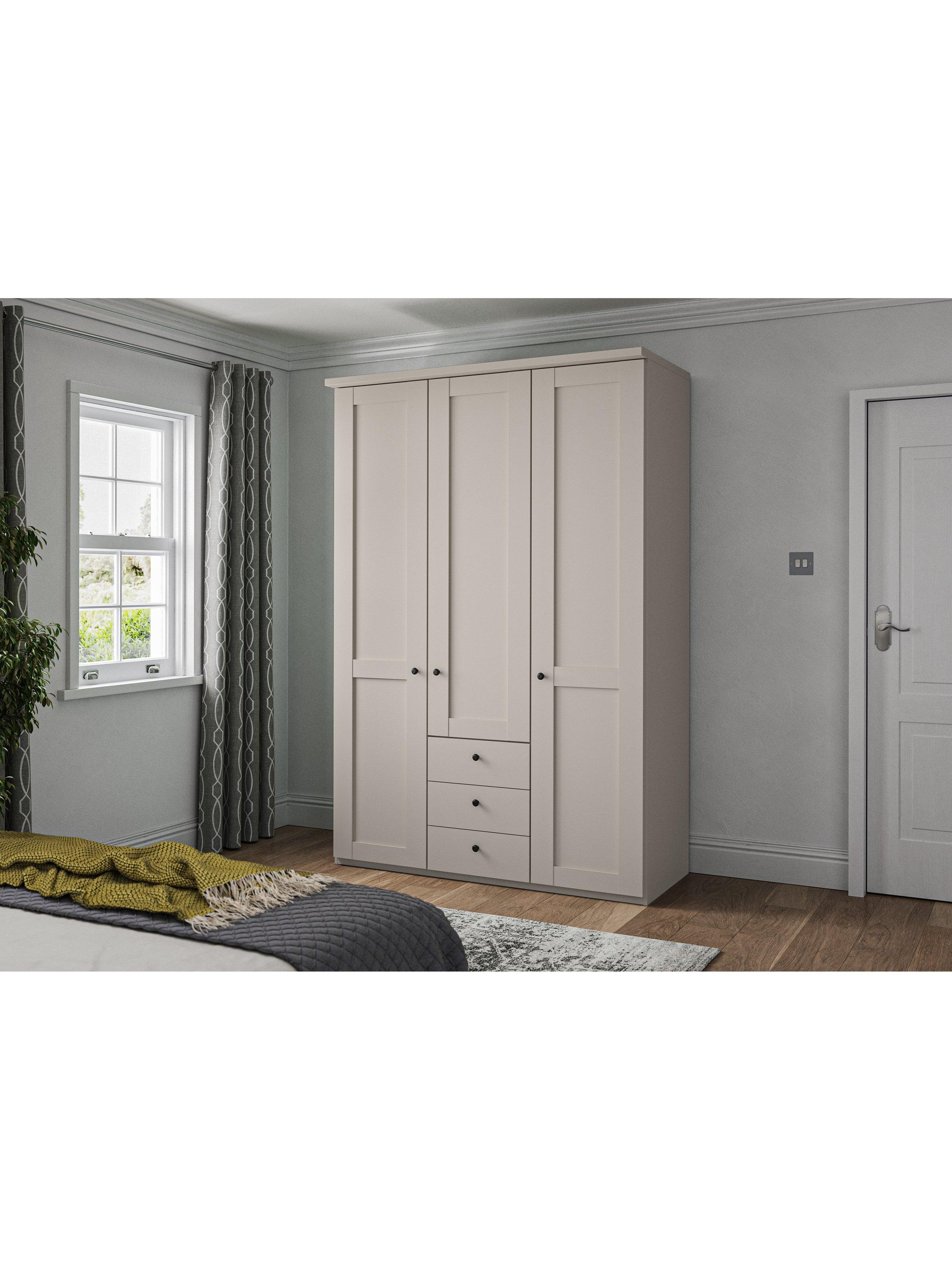 This wardrobe has three drawers at the bottom. The interior compartments have two shelves and a hanging rail in each, all of which are fully adjustable to suit your requirements. This product is delivered and assembled by the supplier for your convenience.