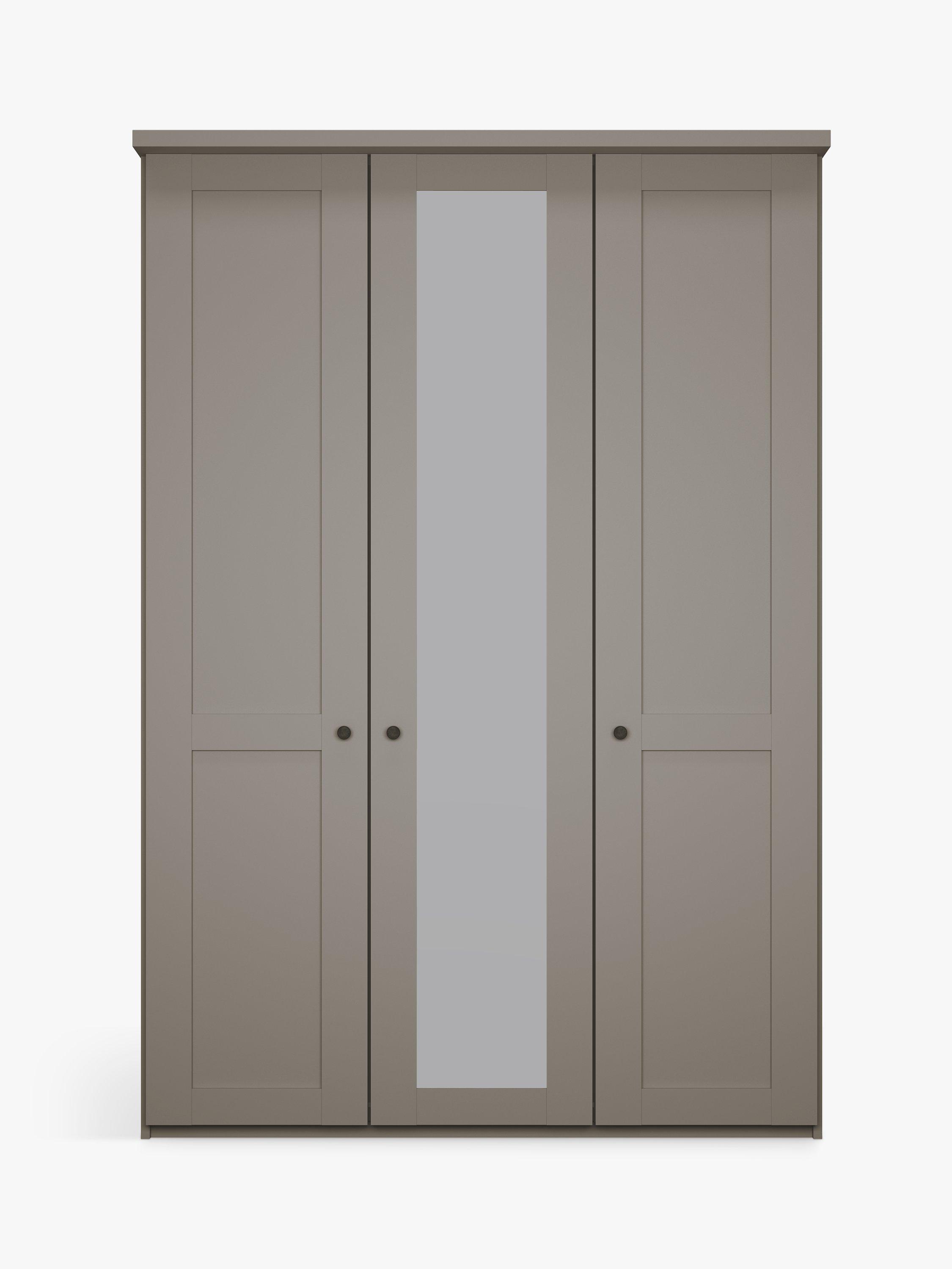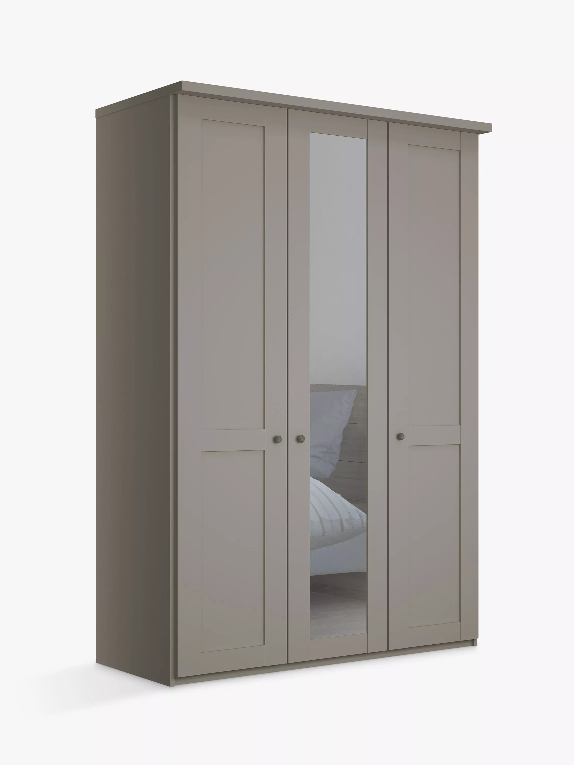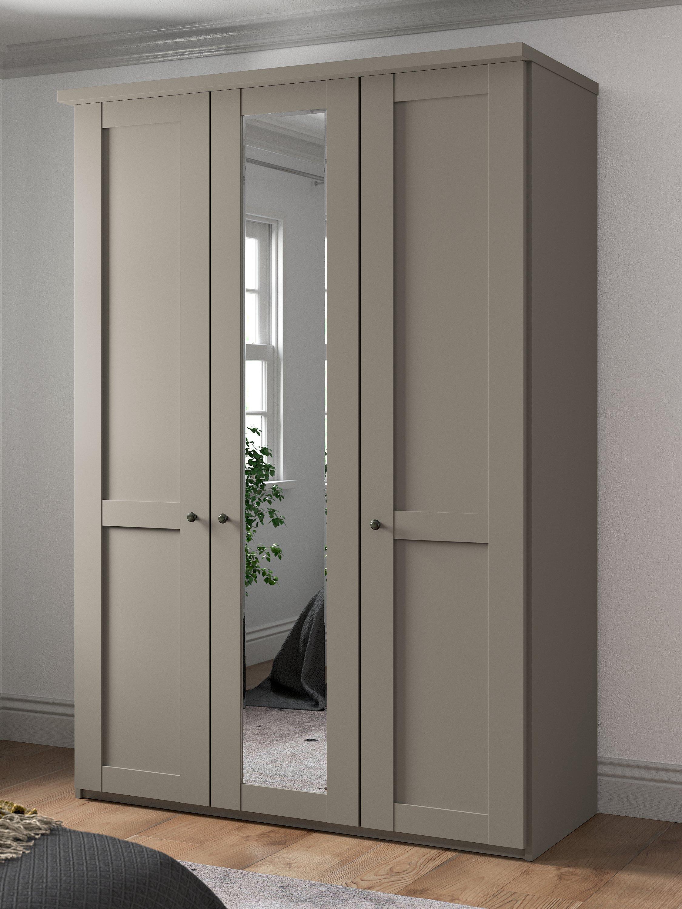 This wardrobe's middle door has an exterior mirror. The interior has a double and a single compartment with two shelves and a hanging rail in each, all of which are fully adjustable to suit your requirements. This product is delivered and assembled by the supplier for your convenience.