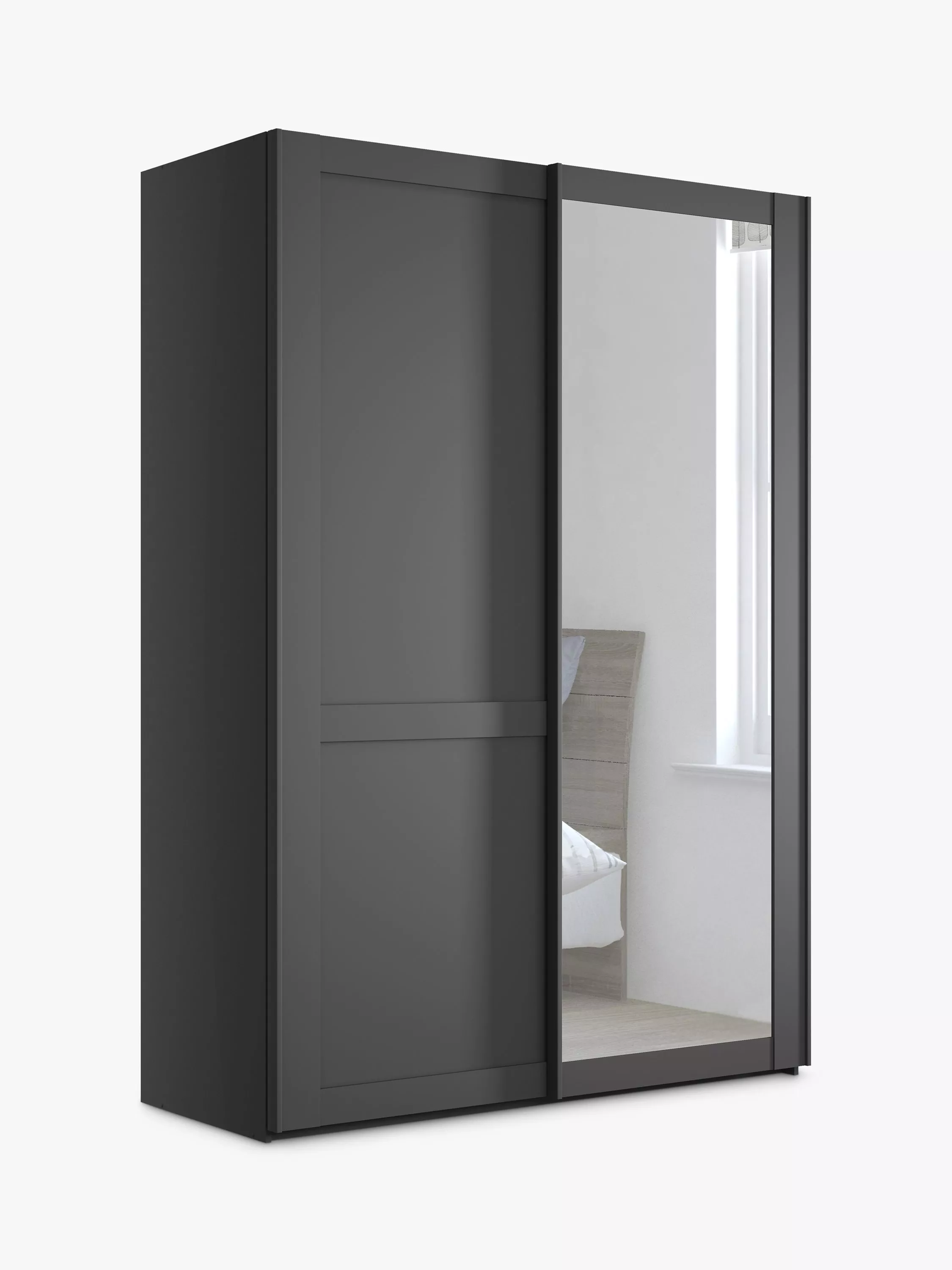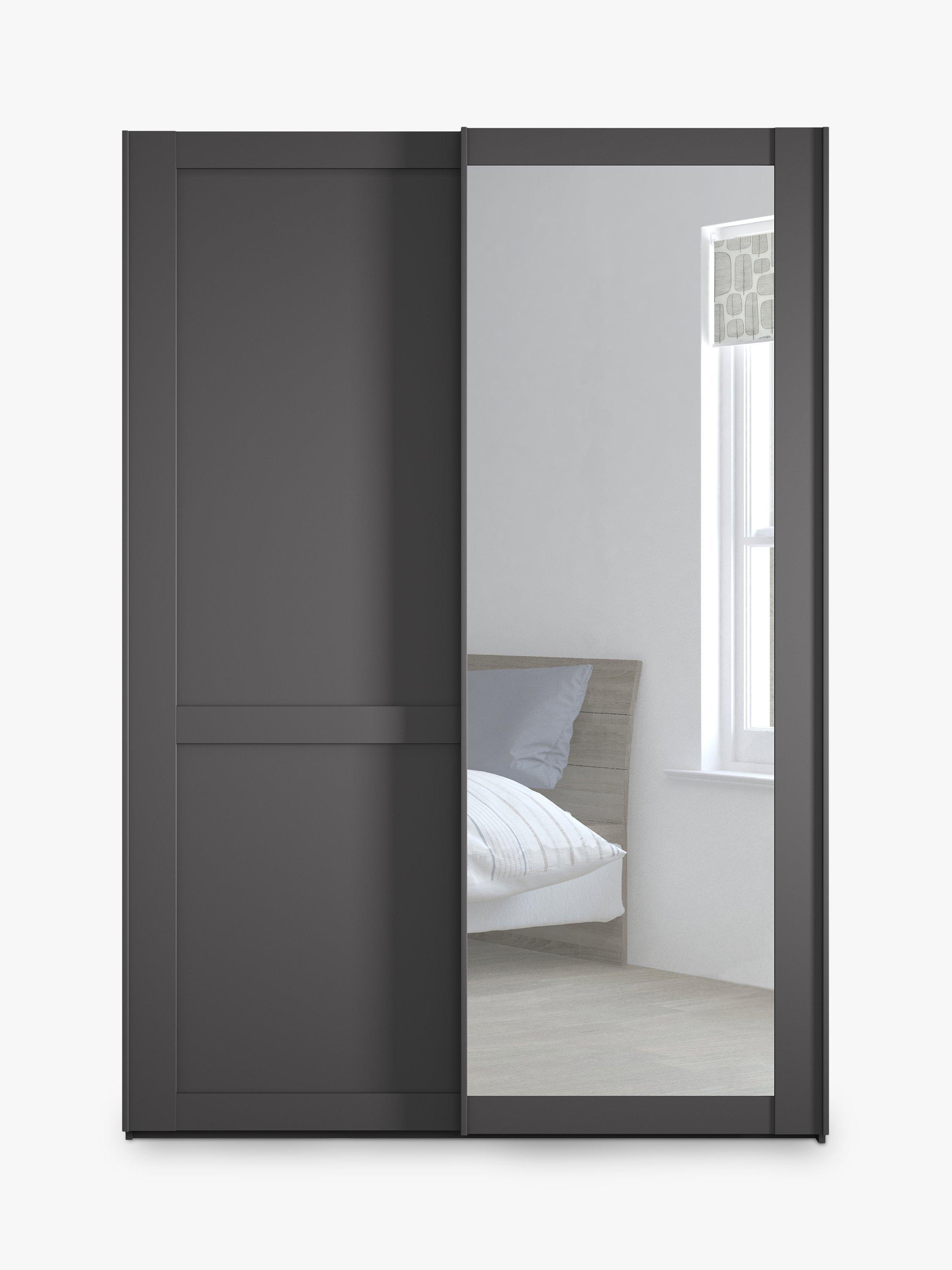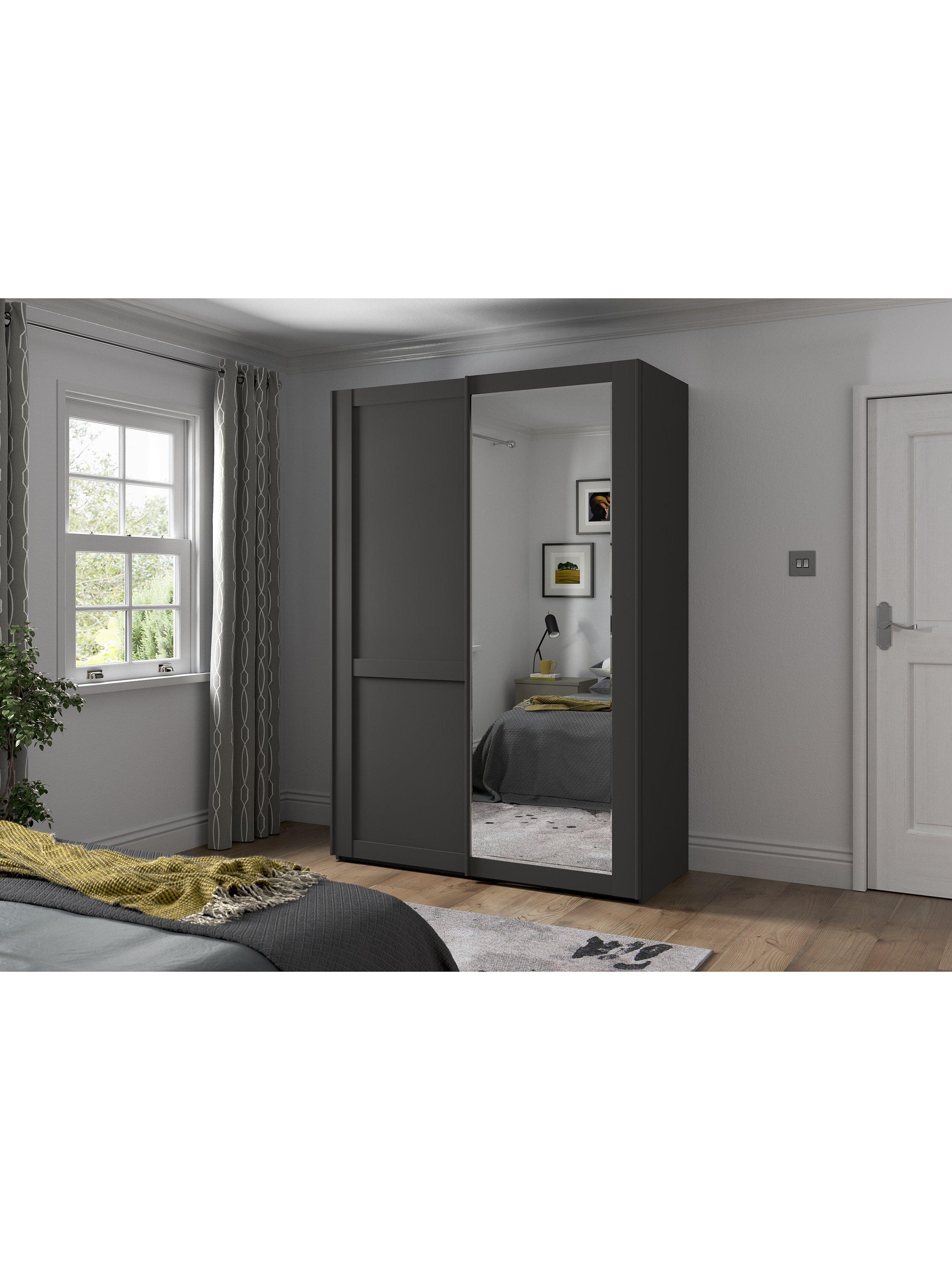 This wardrobe's right hand door has an exterior mirror. The interior has a double and a single compartment with two shelves and a hanging rail in each, all of which are fully adjustable to suit your requirements. This product is delivered and assembled by the supplier for your convenience.