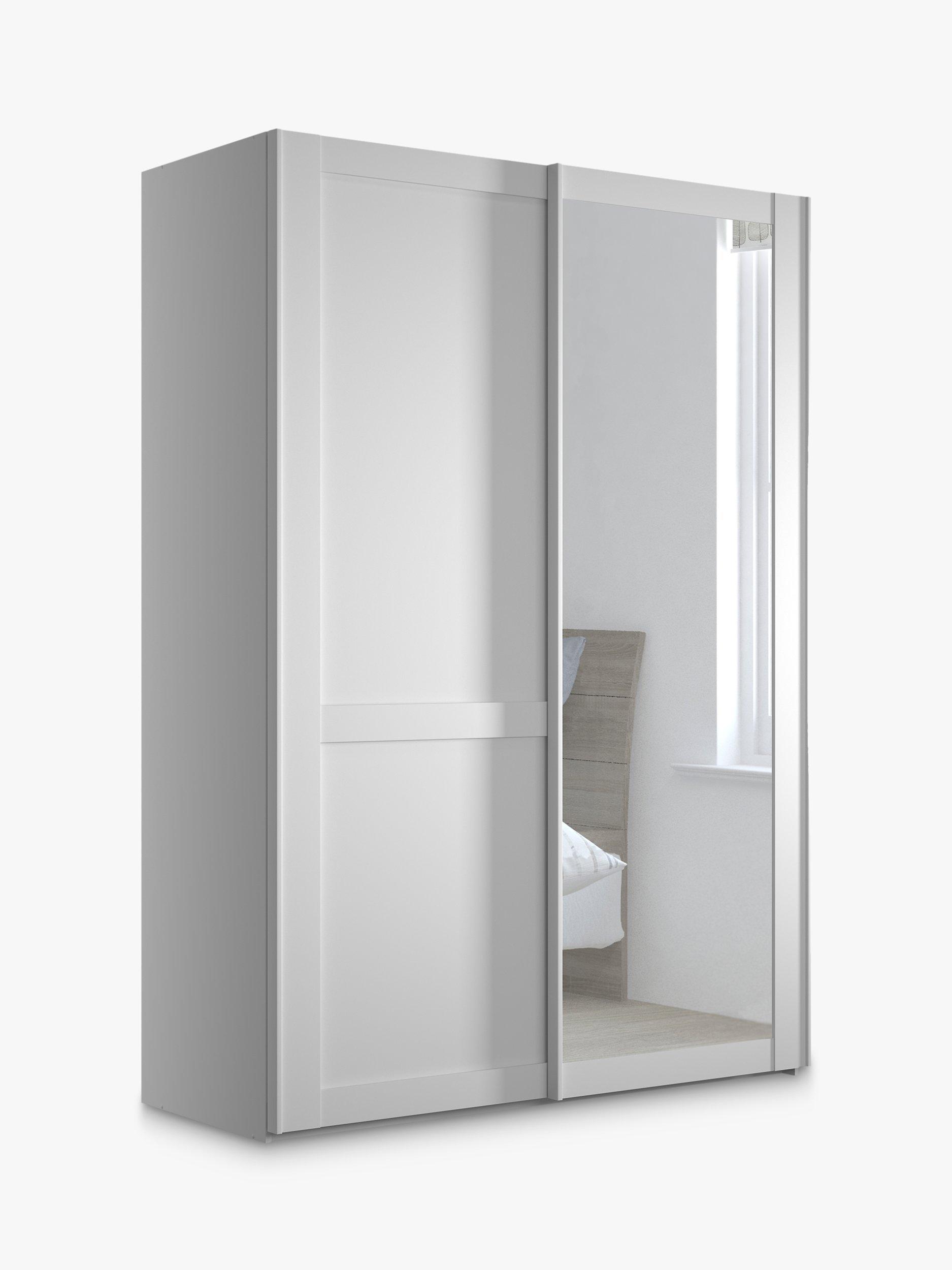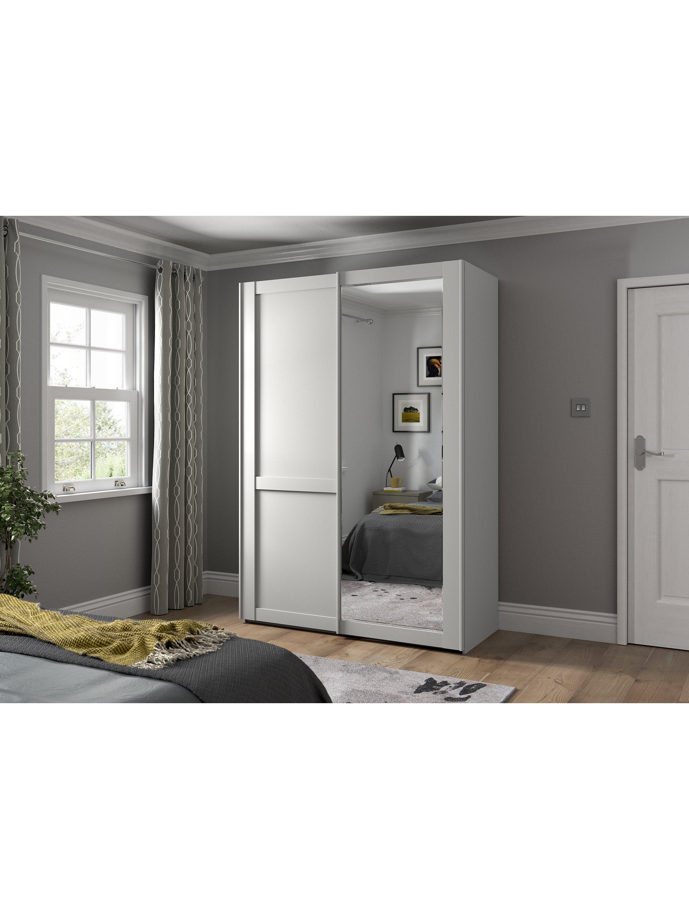 This wardrobe's right hand door has an exterior mirror. The interior has a double and a single compartment with two shelves and a hanging rail in each, all of which are fully adjustable to suit your requirements. This product is delivered and assembled by the supplier for your convenience.