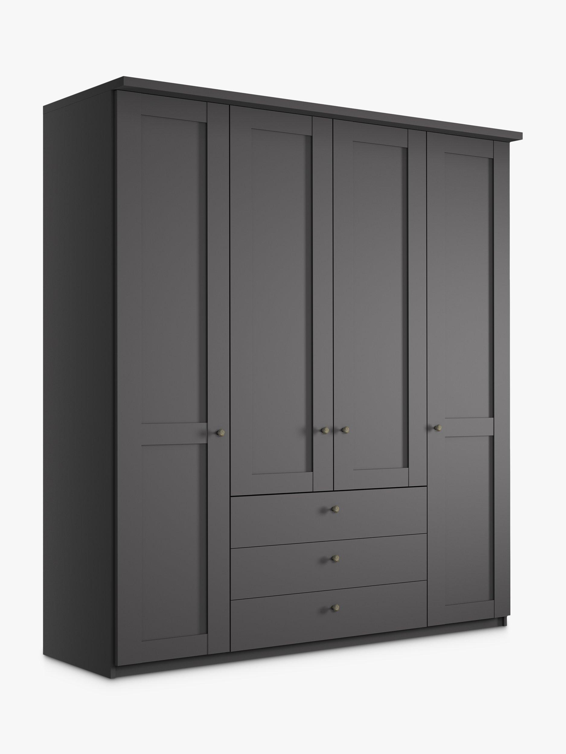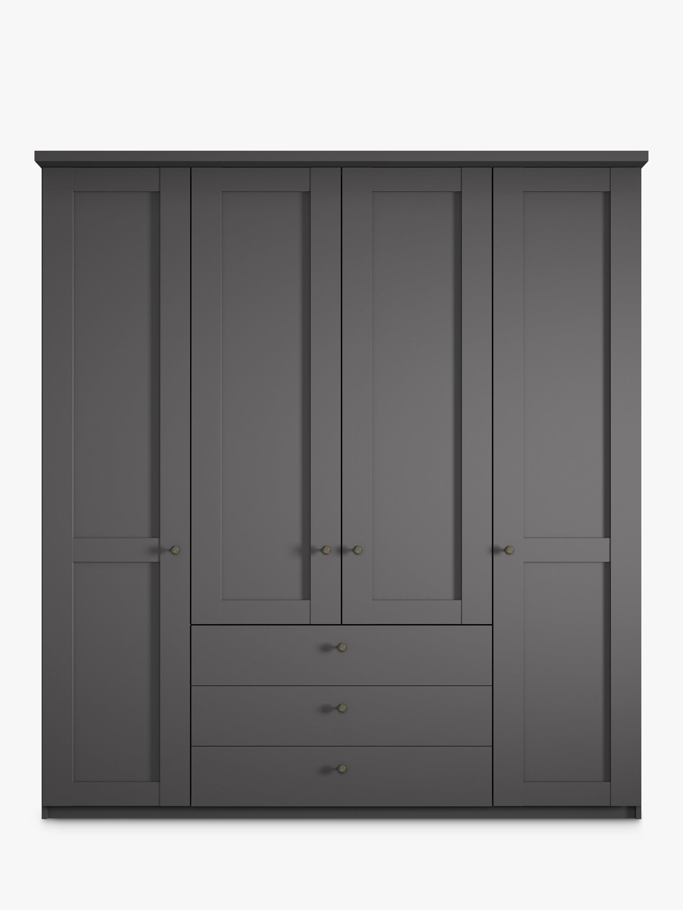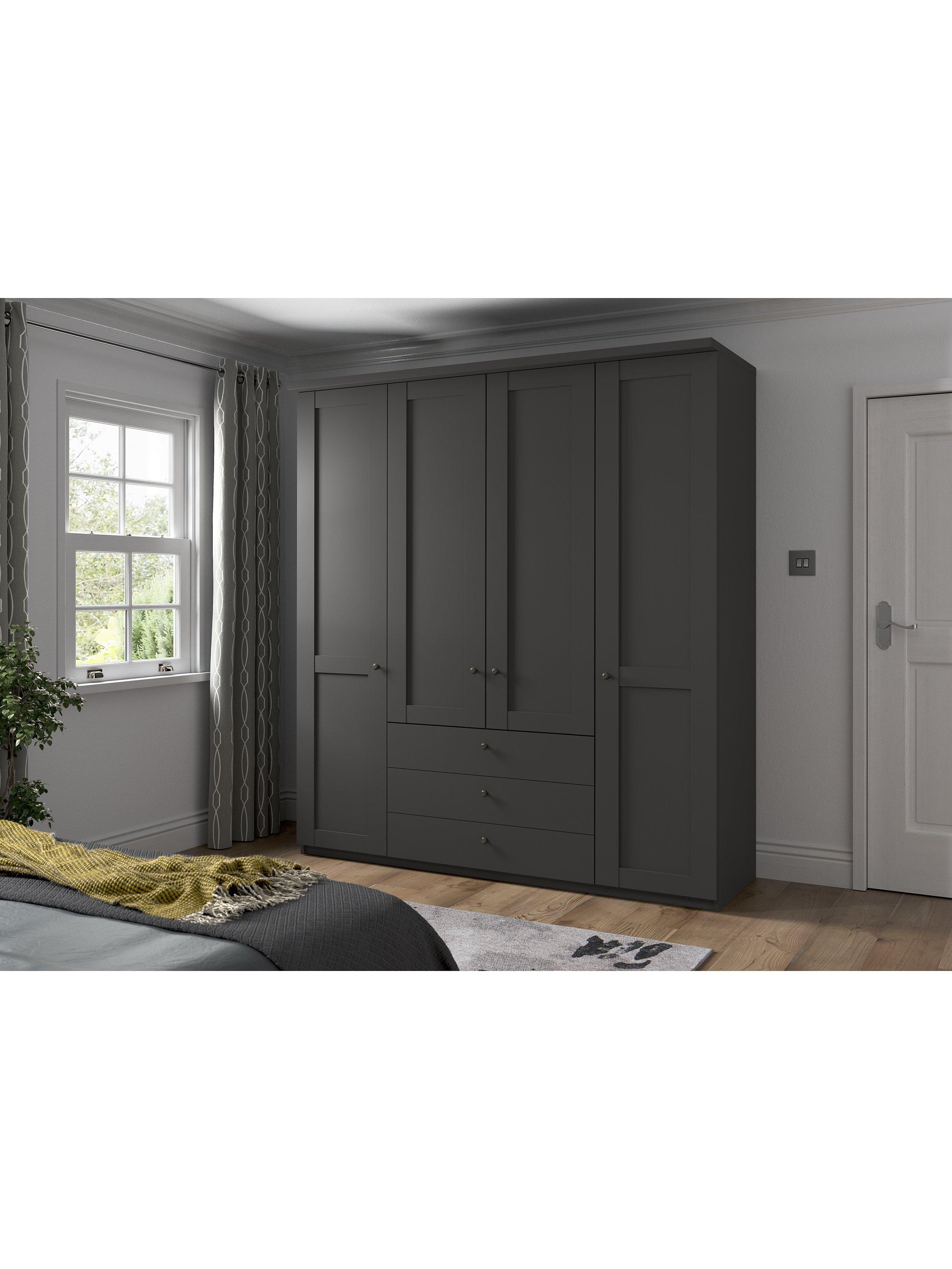 This four-door wardrobe has three drawers below the two middle doors. The interior has two single compartments either side of a double compartment. Each compartment is completed with two shelves and a hanging rail, all of which are fully adjustable to suit your requirements.