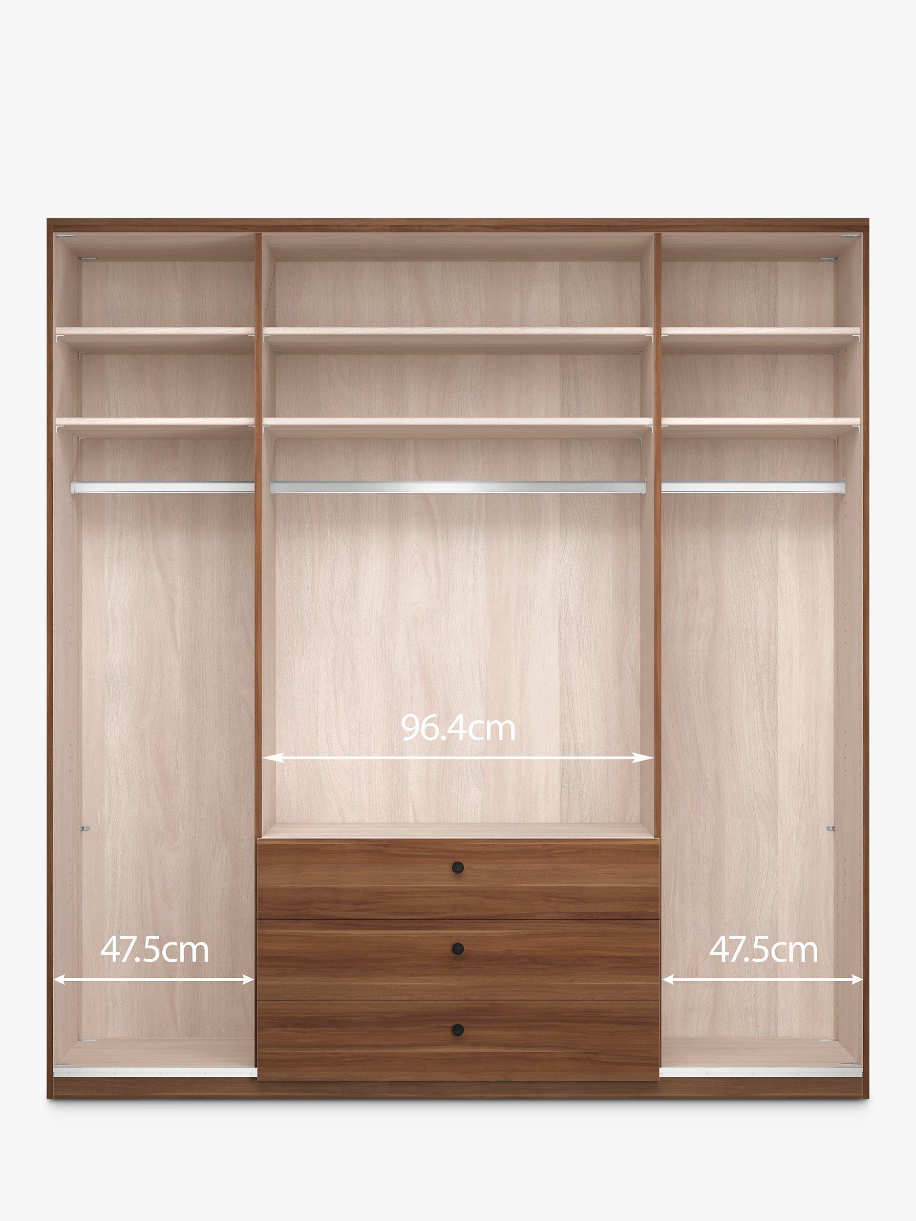 - Additional shelves - widths 47.5cm and 96.4cm Hanging rails - widths 47.5cm and 96.4cm Internal drawer units - widths 47.5cm and 96.4cm Internal LED lights External LED linear lights