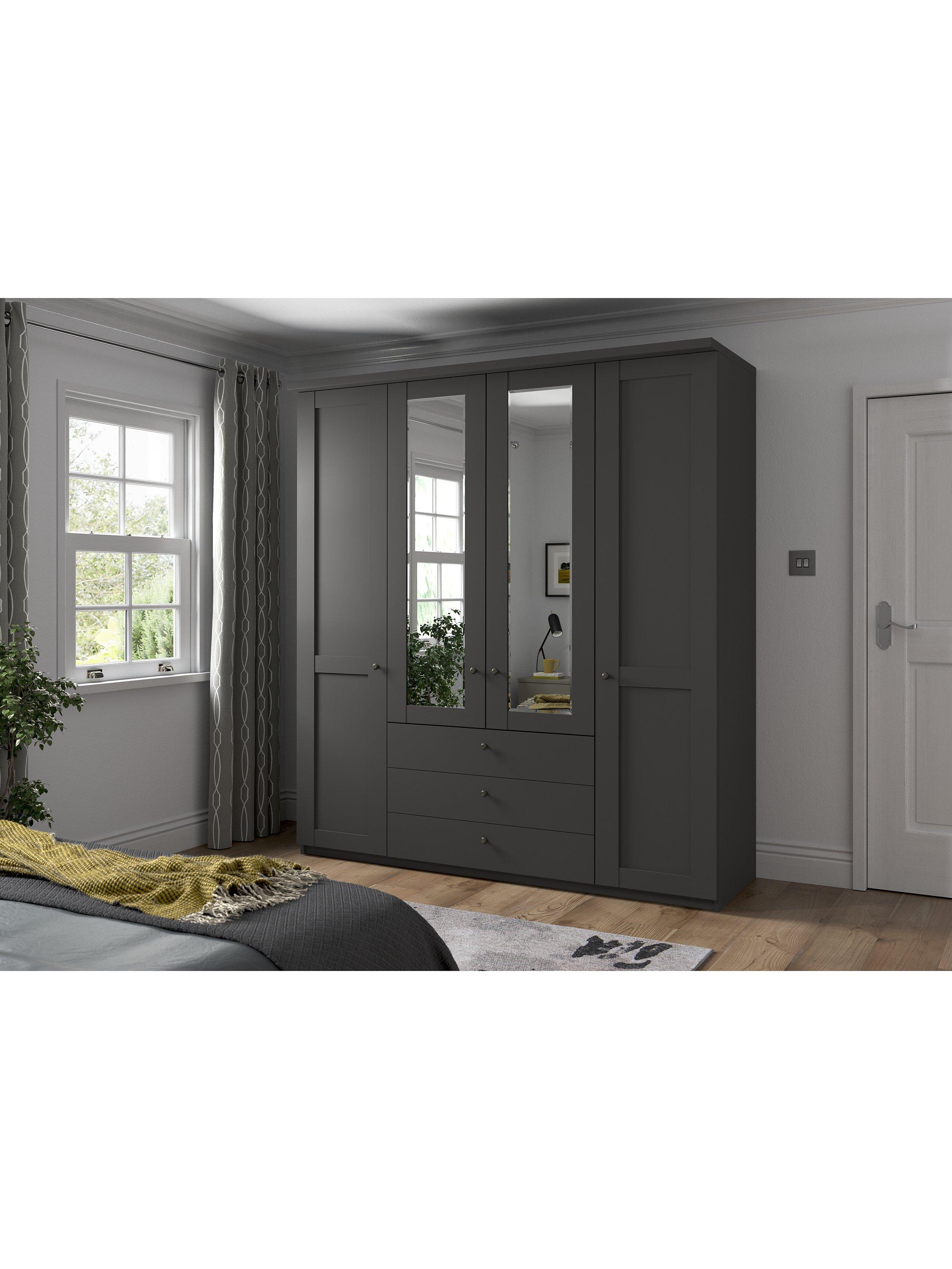This four-door wardrobe has three drawers below the two mirrored middle doors. The interior has two single compartments either side of a double compartment. Each compartment is completed with two shelves and a hanging rail, all of which are fully adjustable to suit your requirements.