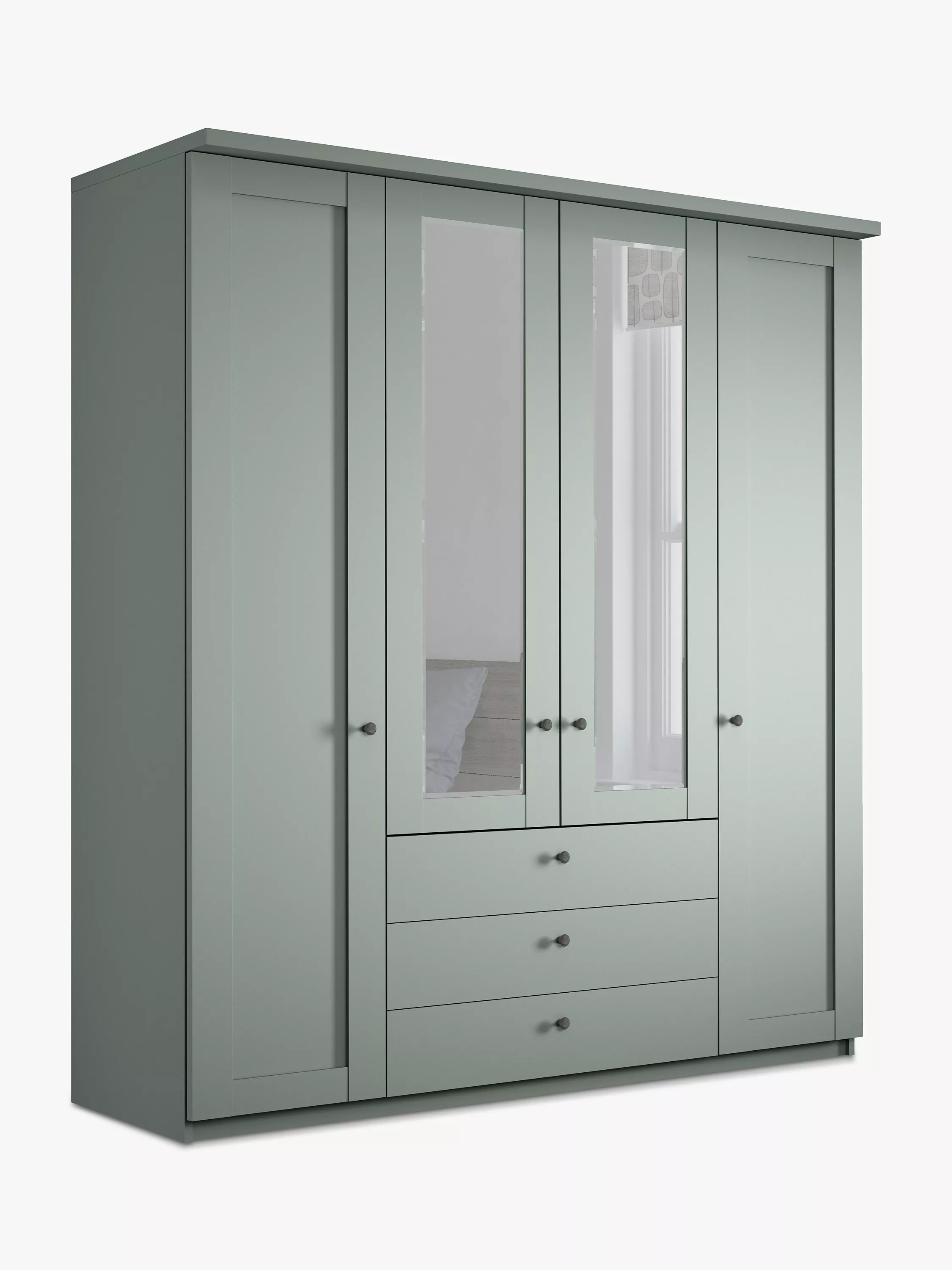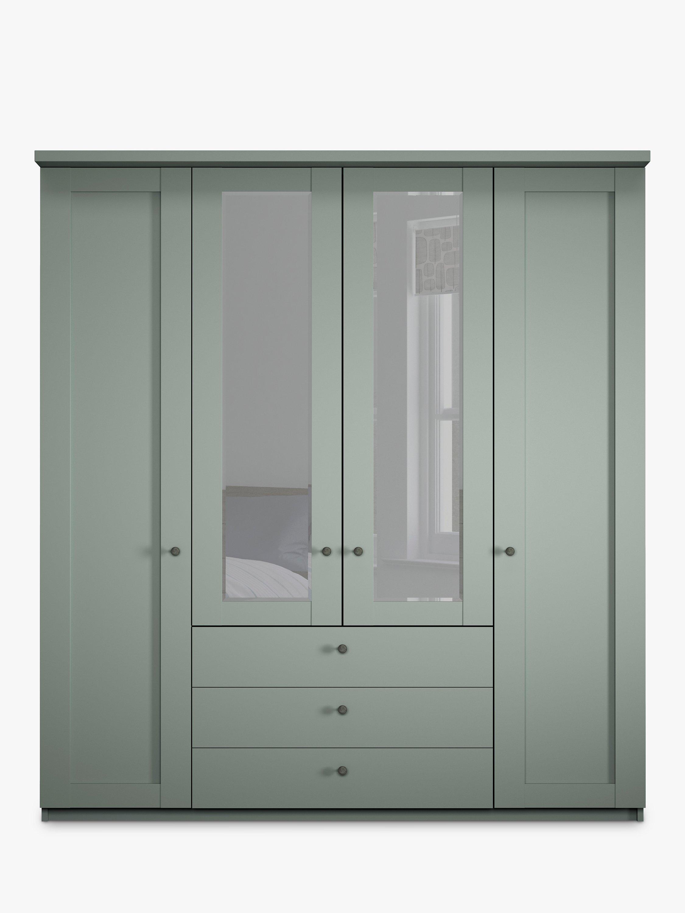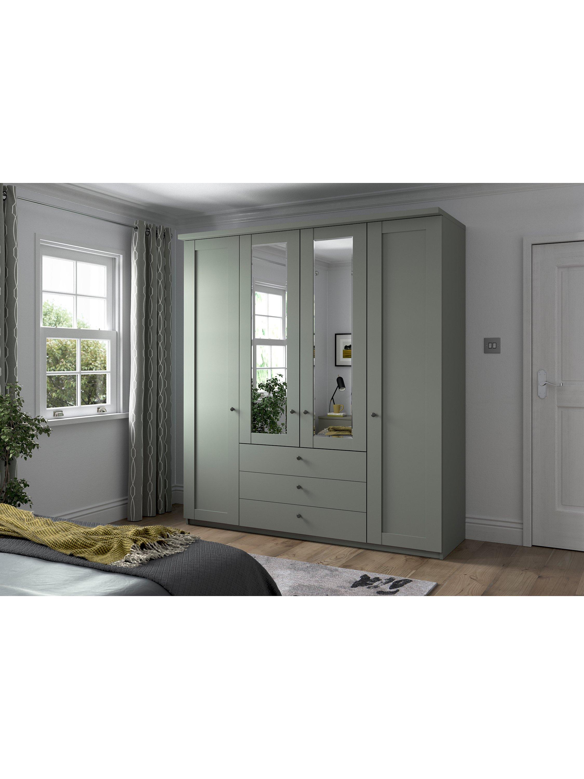This four-door wardrobe has three drawers below the two mirrored middle doors. The interior has two single compartments either side of a double compartment. Each compartment is completed with two shelves and a hanging rail, all of which are fully adjustable to suit your requirements.