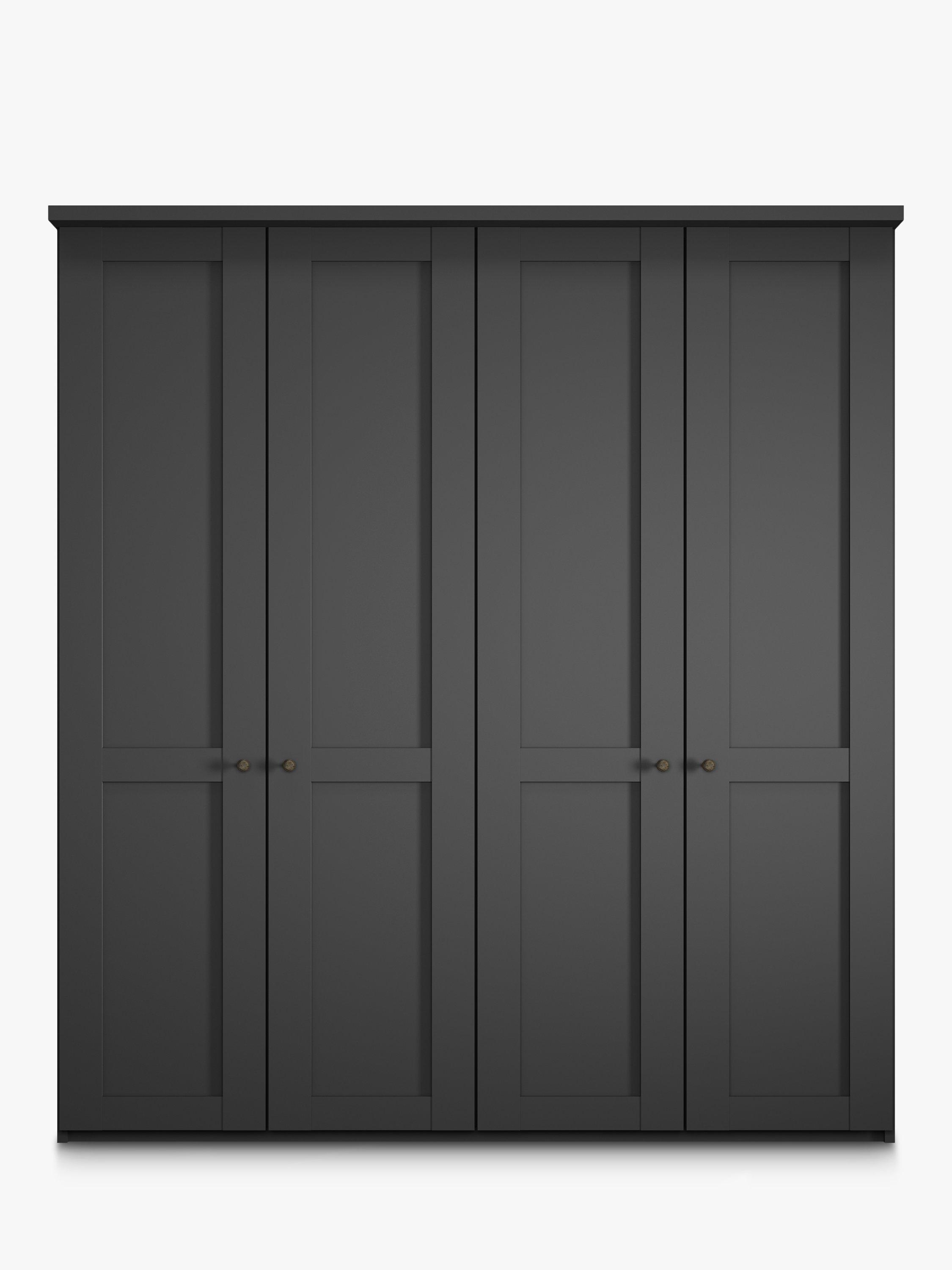 This wardrobe's interior has two double compartments with two shelves and a hanging rail in each, all of which are fully adjustable to suit your requirements. This product is delivered and assembled by the supplier for your convenience.