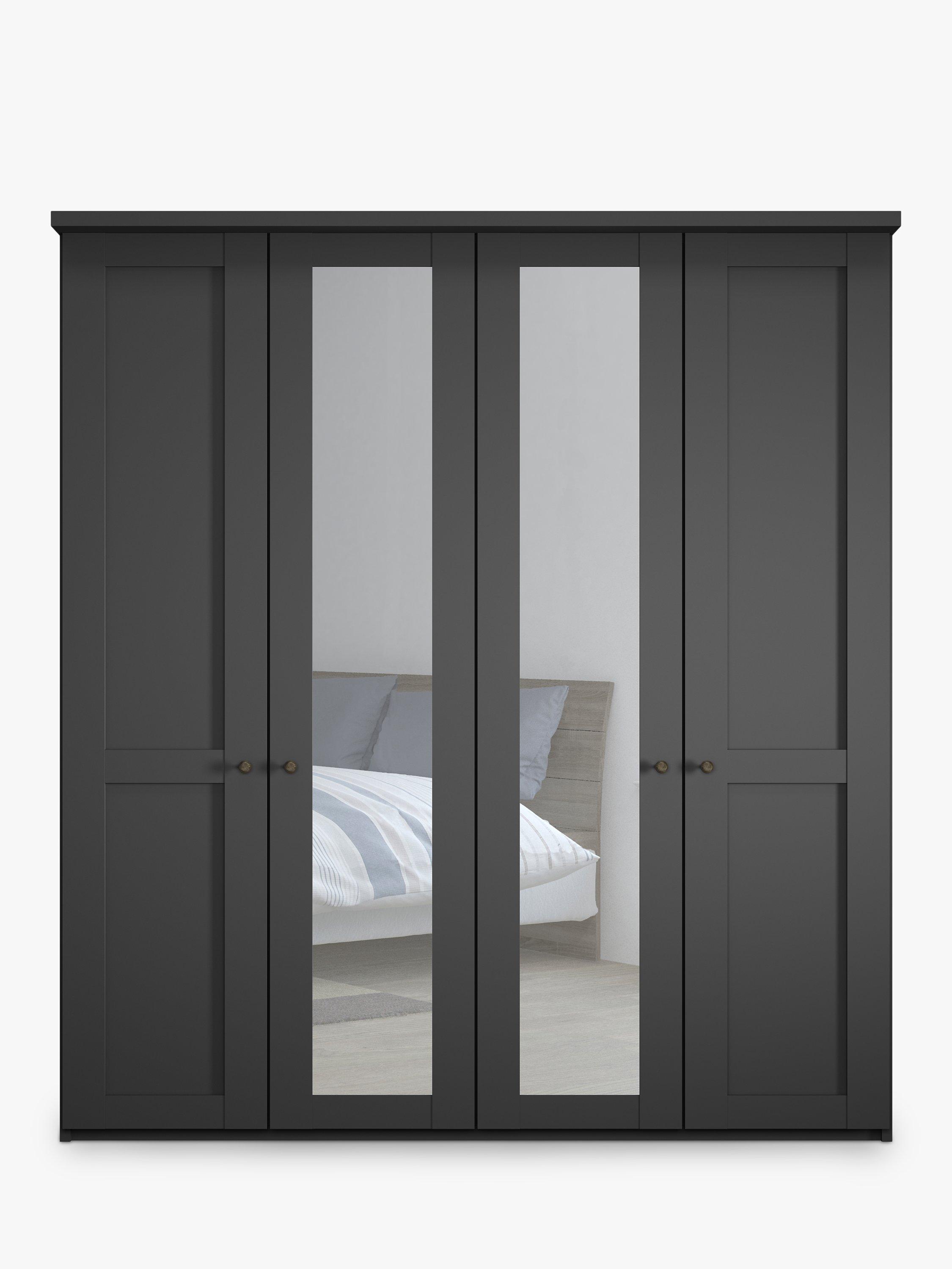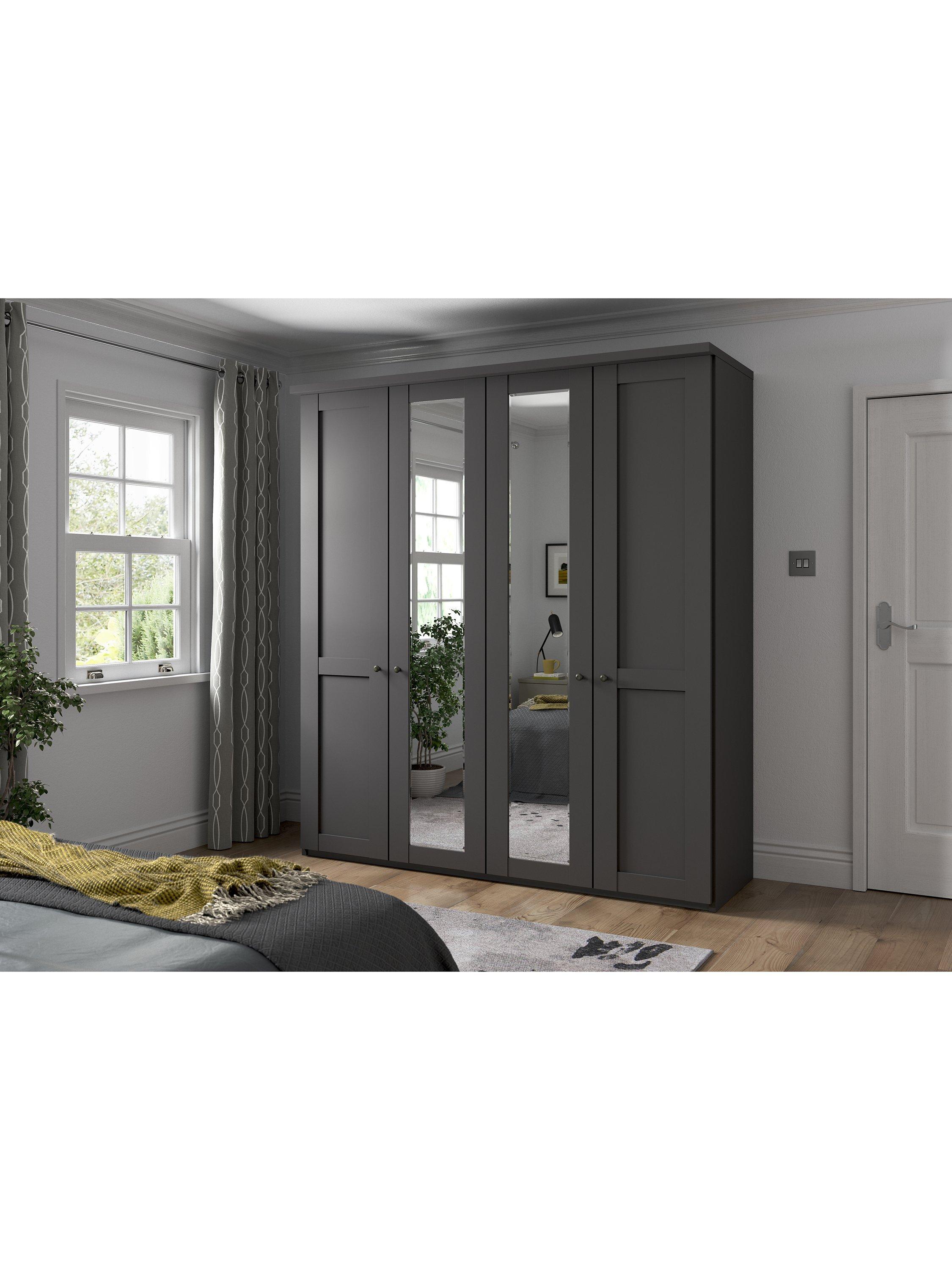 This wardrobe's two middle doors have external mirrors. The interior has two double compartments with two shelves and a hanging rail in each, all of which are fully adjustable to suit your requirements. This product is delivered and assembled by the supplier for your convenience.