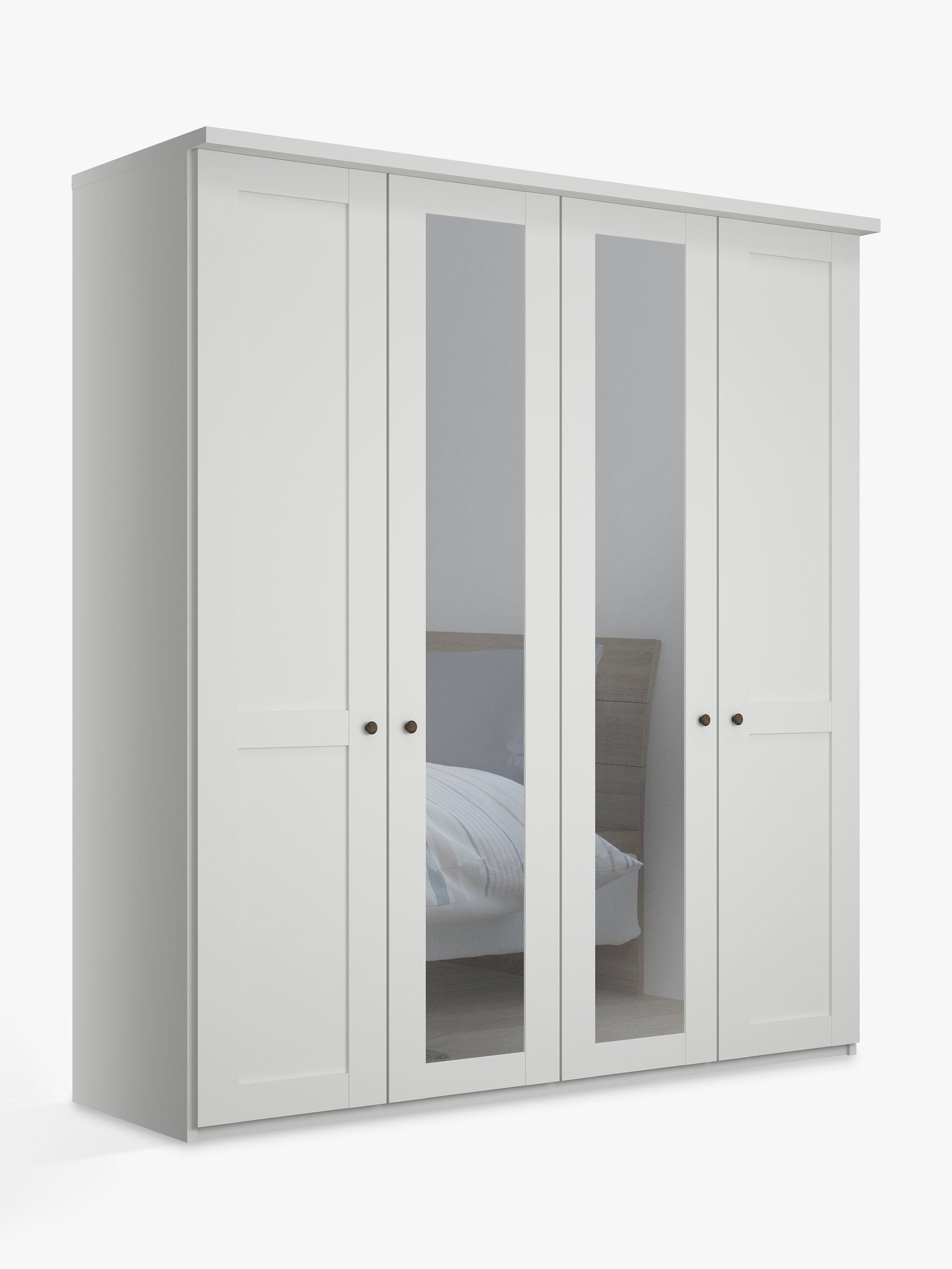This wardrobe's two middle doors have external mirrors. The interior has two double compartments with two shelves and a hanging rail in each, all of which are fully adjustable to suit your requirements. This product is delivered and assembled by the supplier for your convenience.
