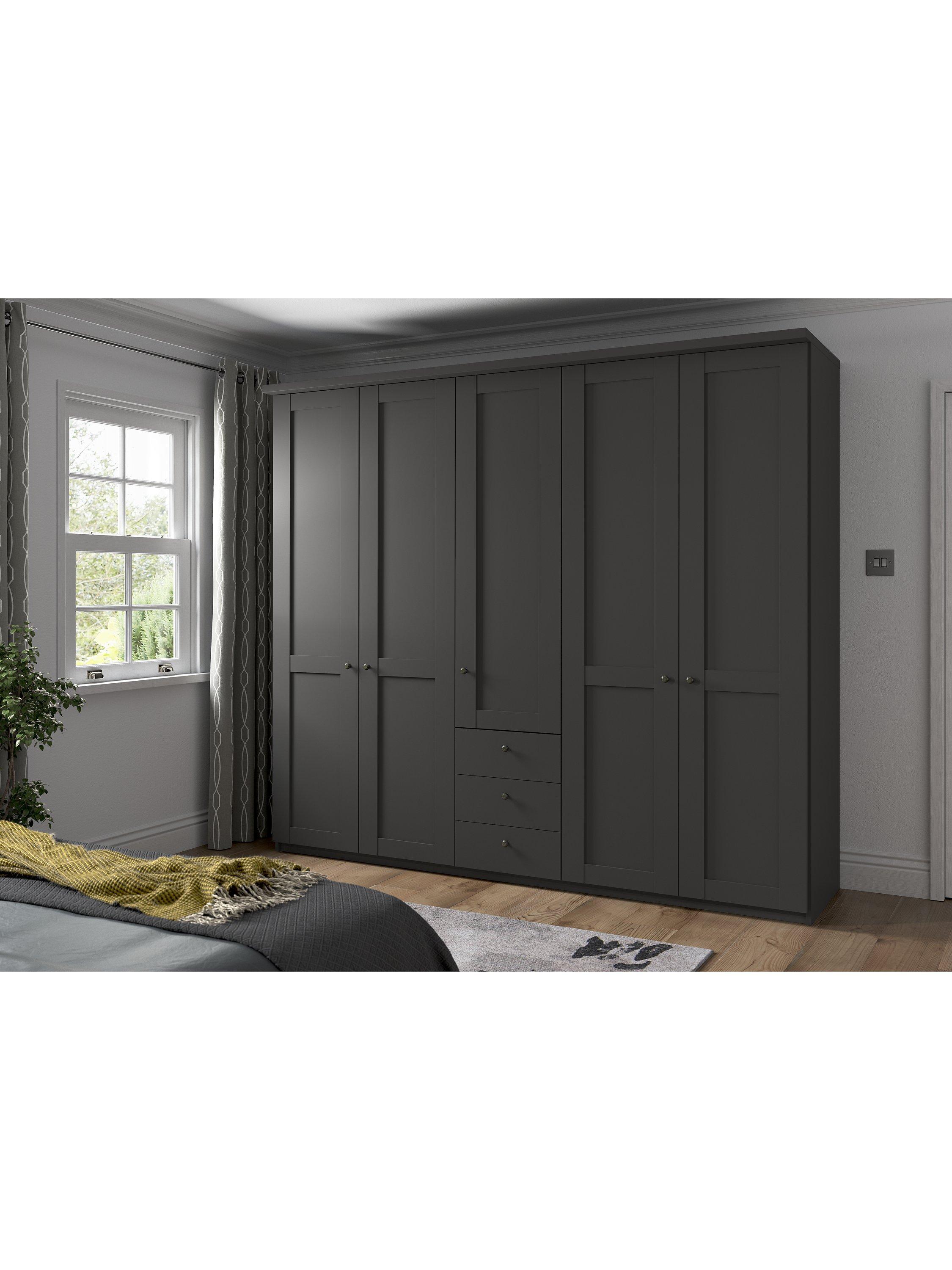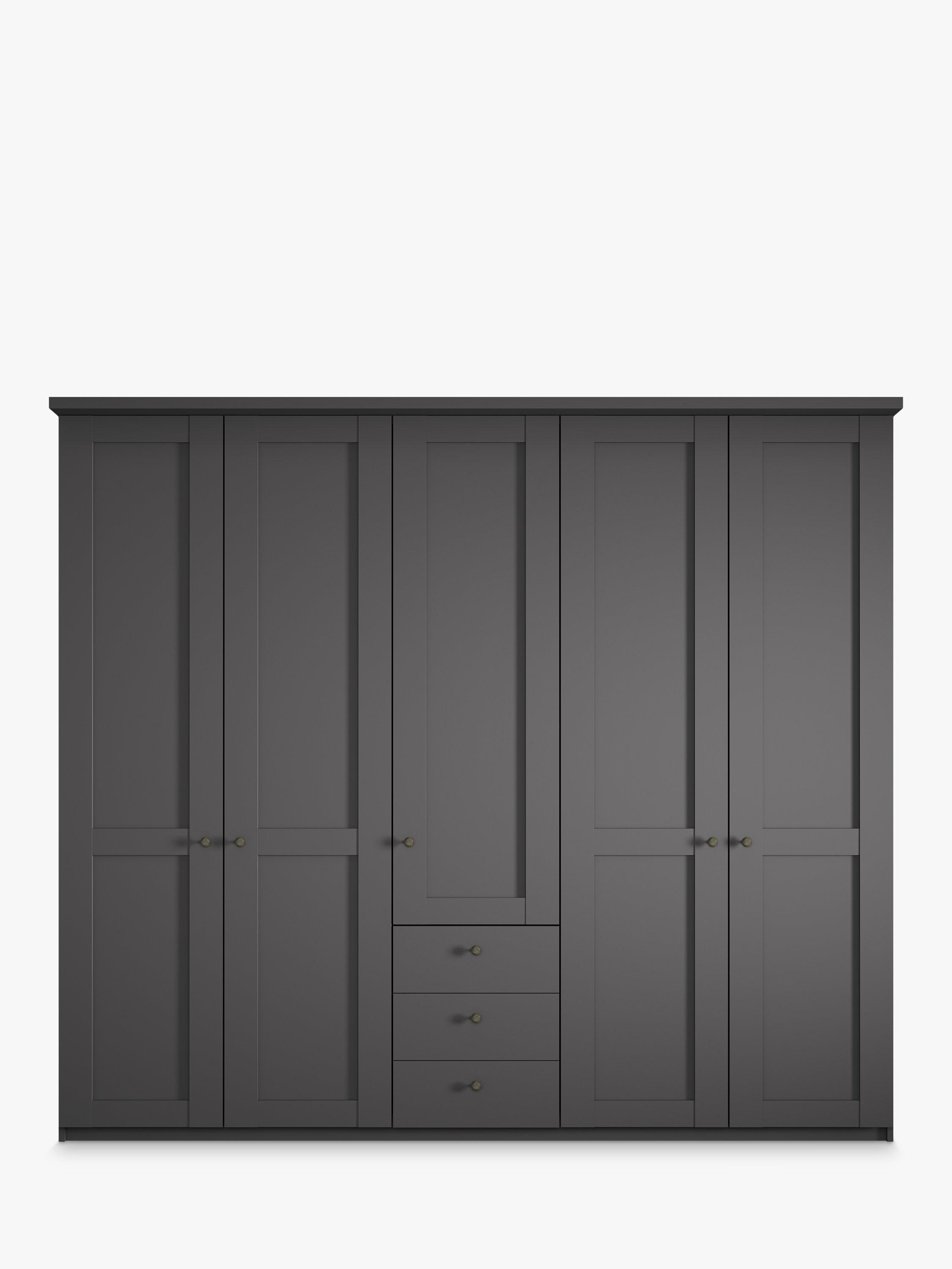 This five-door wardrobe has three drawers below the middle door. The interior has two double compartments either side of a single compartment. Each compartment is completed with two shelves and a hanging rail, all of which are fully adjustable to suit your requirements.