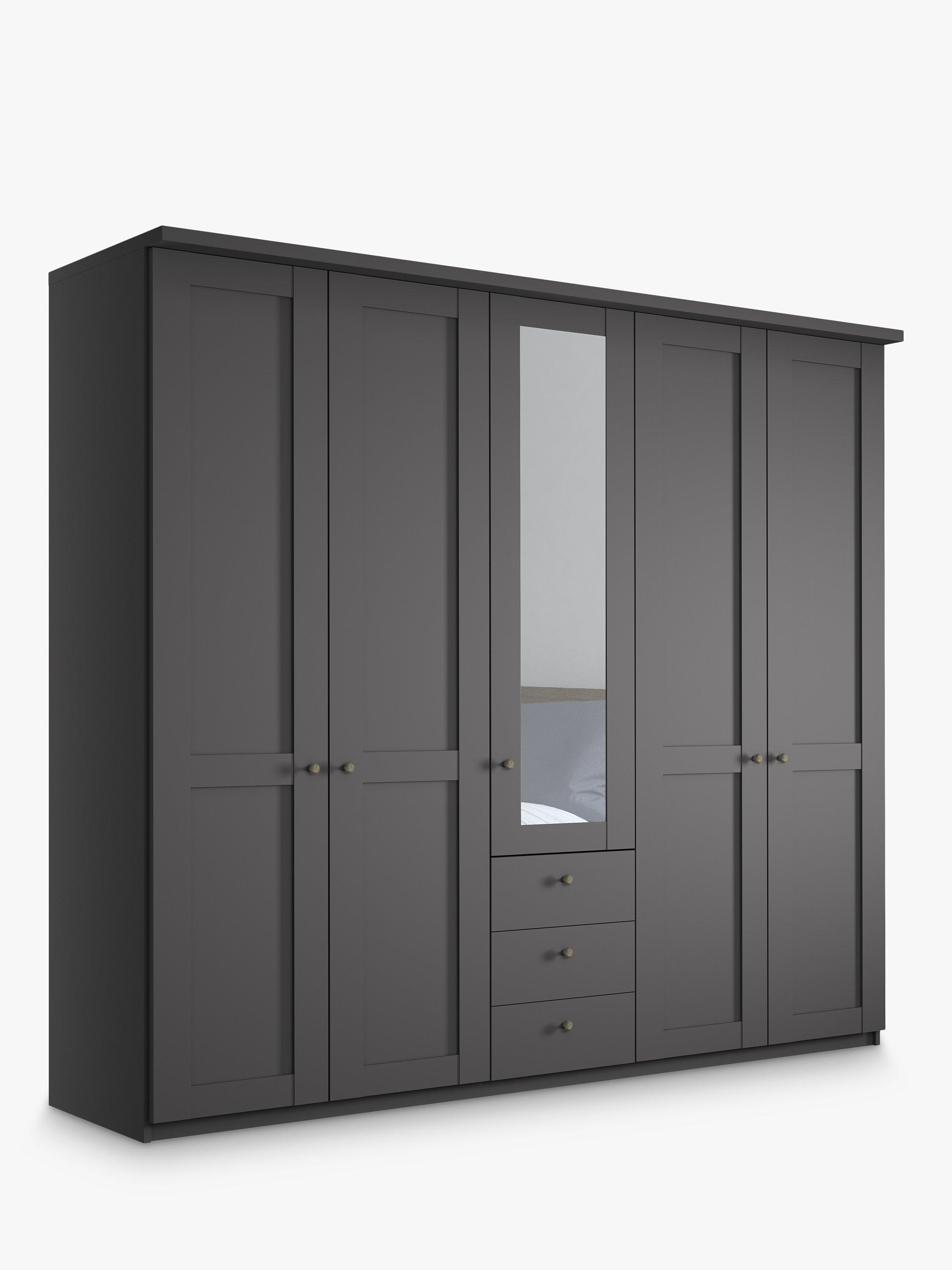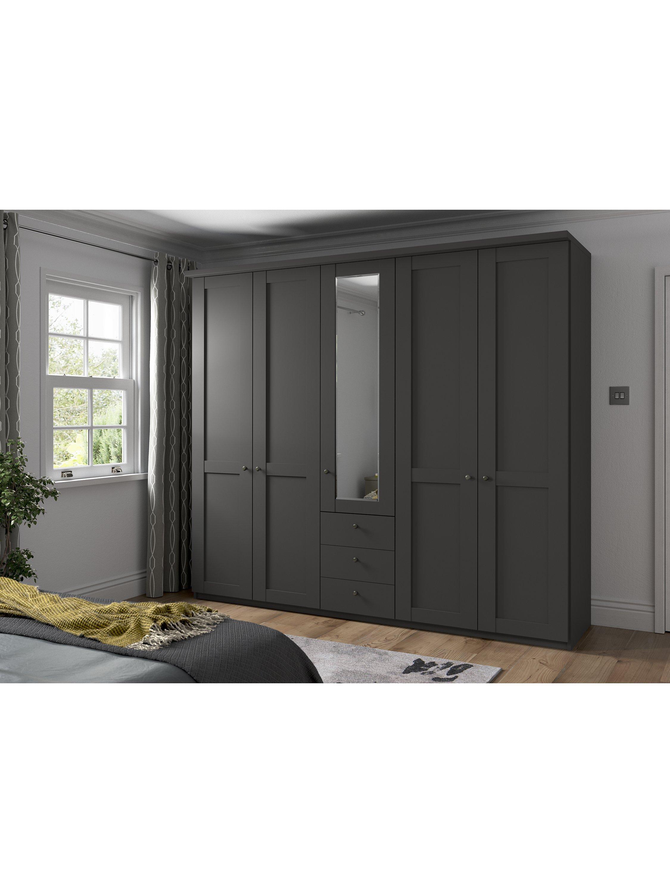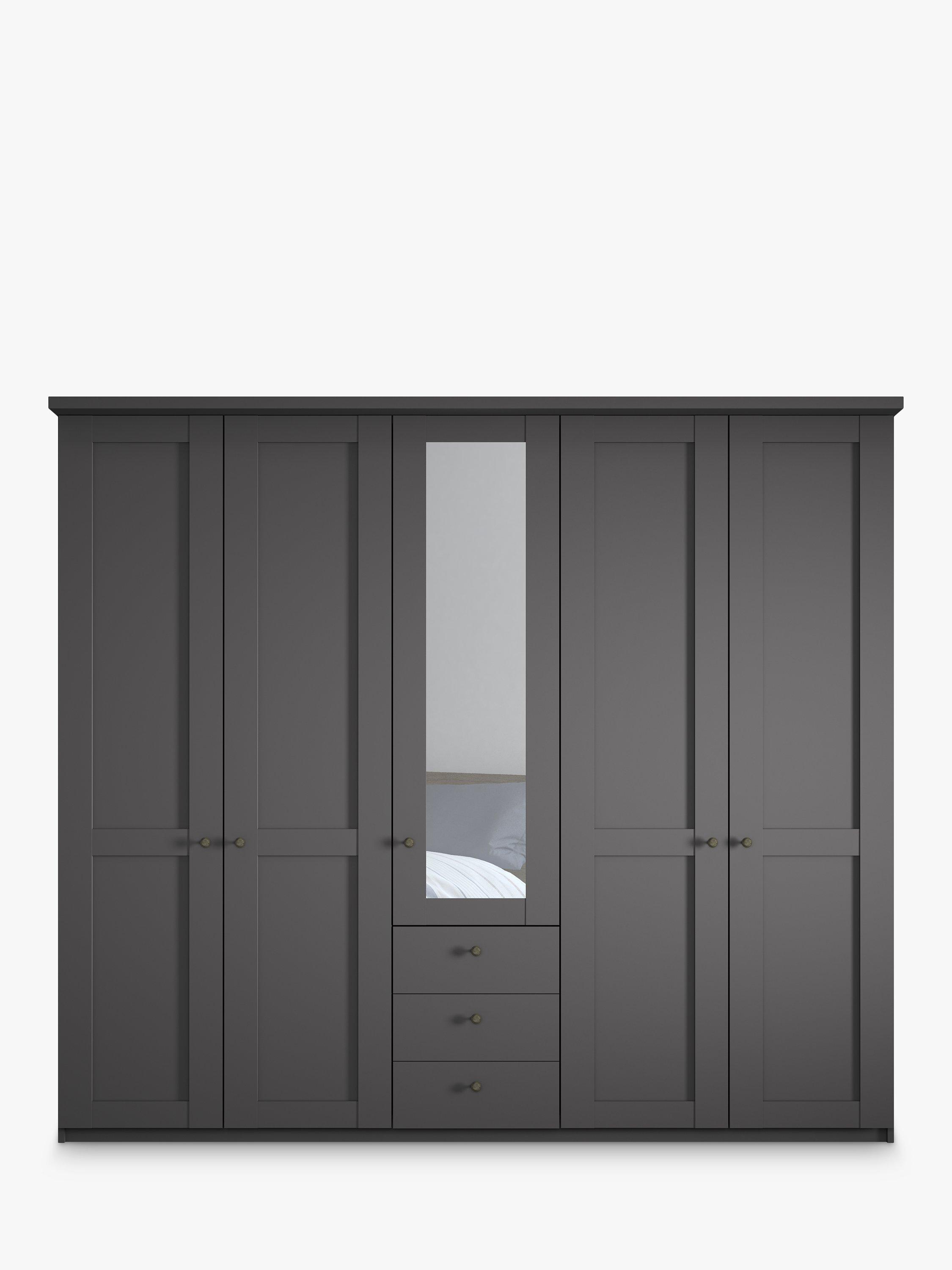 This five-door wardrobe has three drawers below the mirrored middle door. The interior has two double compartments either side of a single compartment. Each compartment is completed with two shelves and a hanging rail, all of which are fully adjustable to suit your requirements.