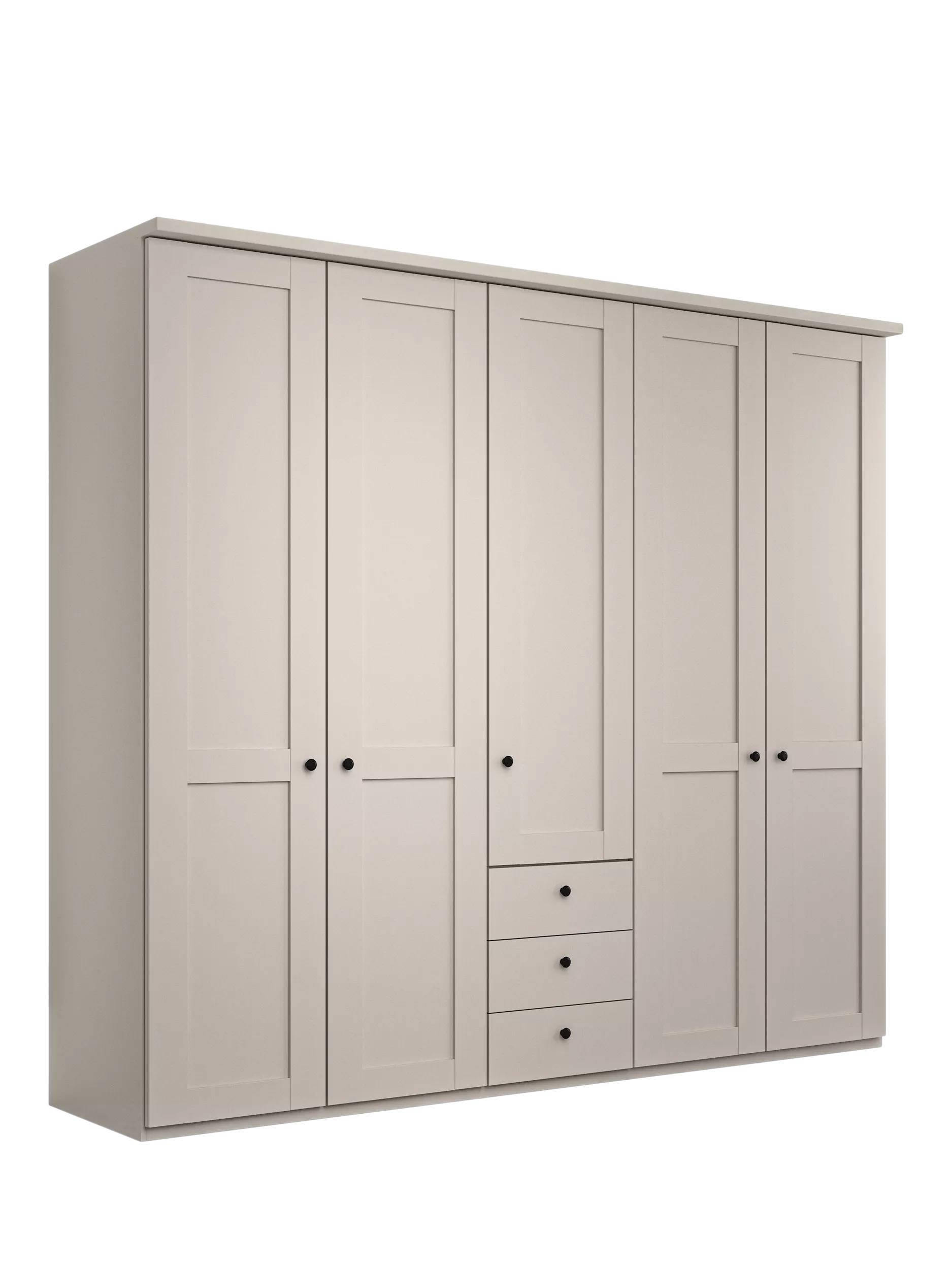This wardrobe has three drawers at the bottom. The interior compartments have two shelves and a hanging rail in each, all of which are fully adjustable to suit your requirements. This product is delivered and assembled by the supplier for your convenience.