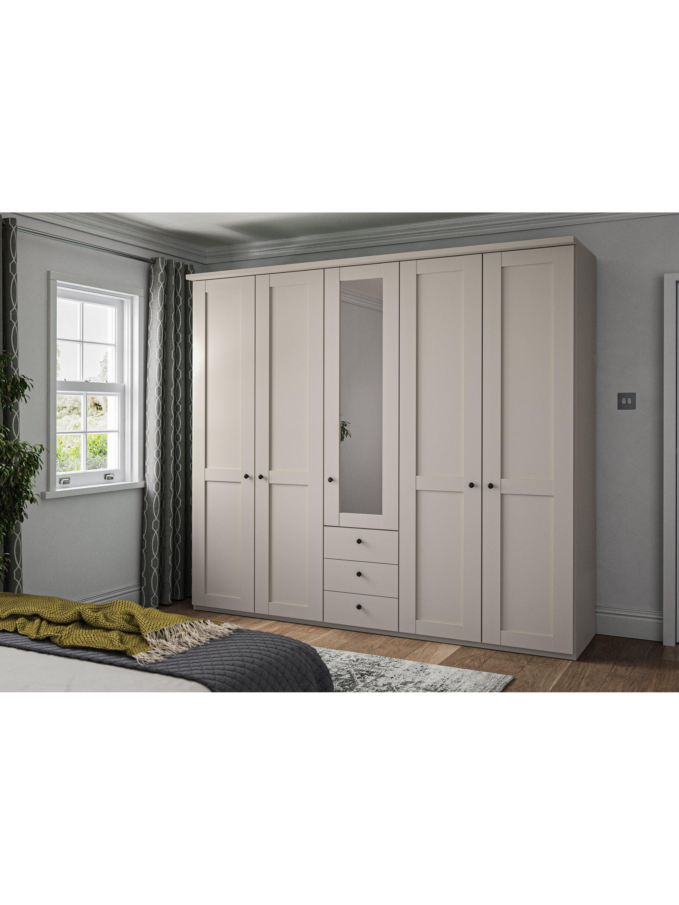 This wardrobe has three drawers at the bottom. The interior compartments have two shelves and a hanging rail in each, all of which are fully adjustable to suit your requirements. This product is delivered and assembled by the supplier for your convenience.