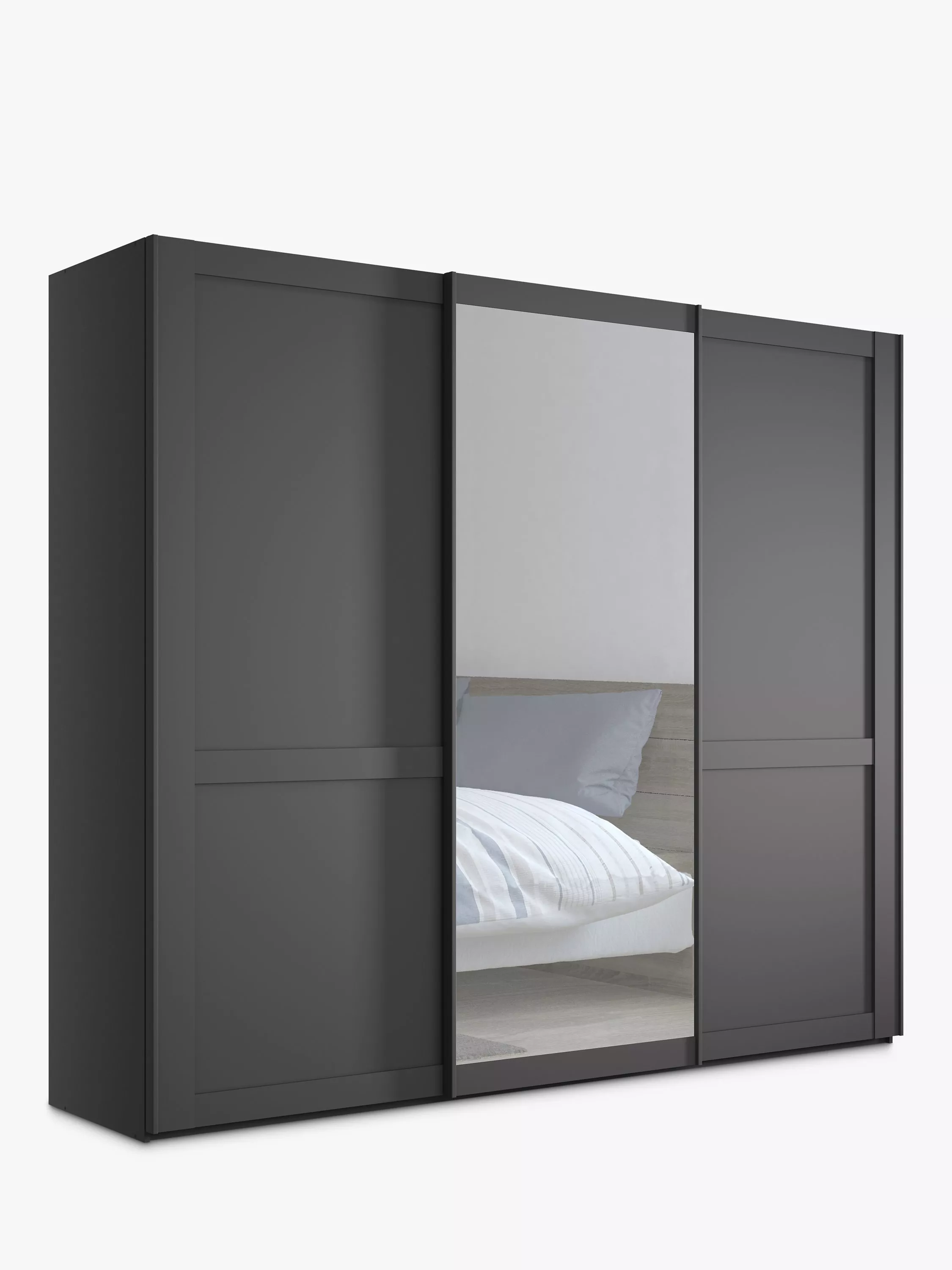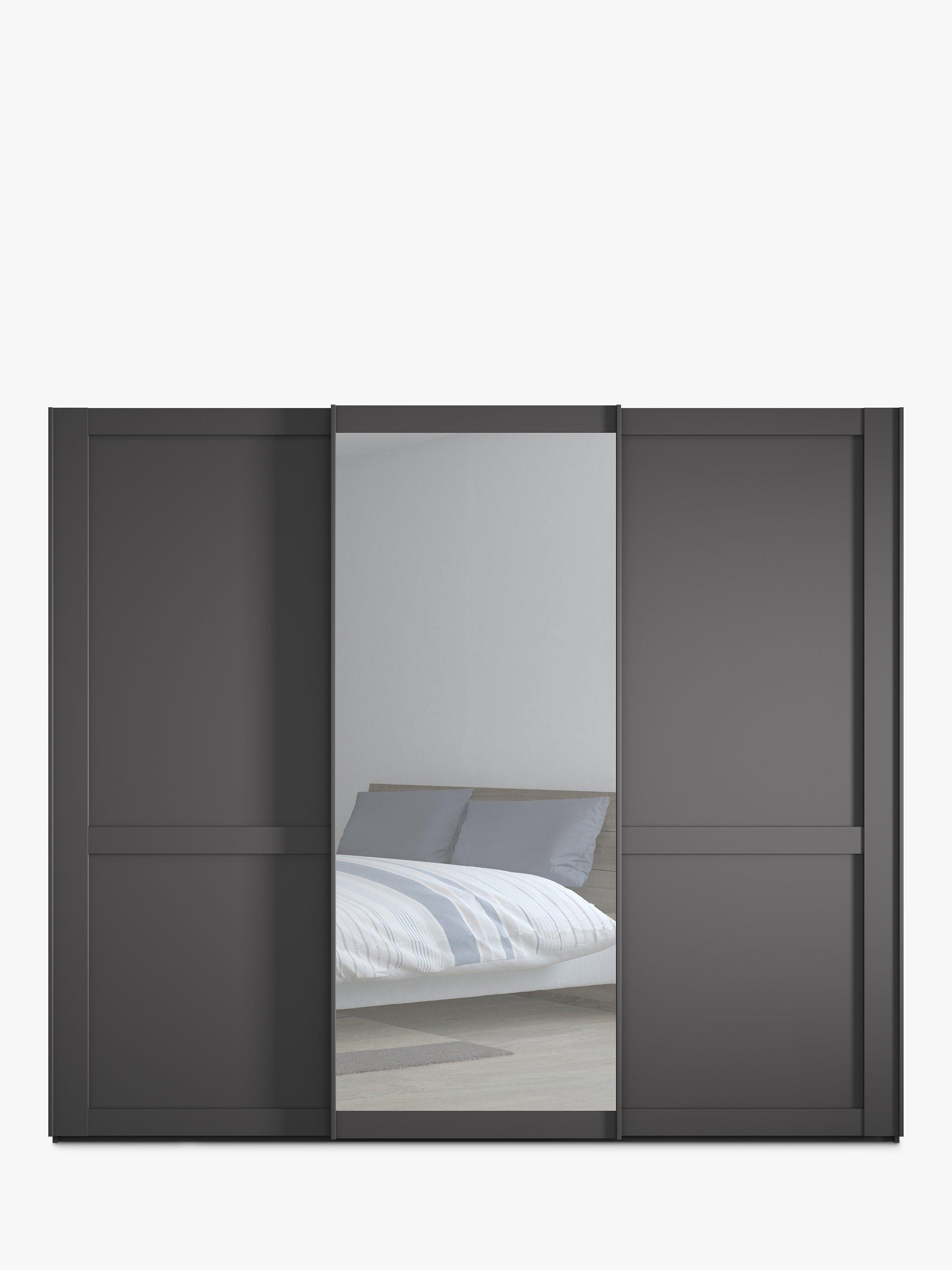 This wardrobe's middle sliding door has an exterior mirror. The interior has two double and a single compartment with two shelves and a hanging rail in each, all of which are fully adjustable to suit your requirements. This product is delivered and assembled by the supplier for your convenience.