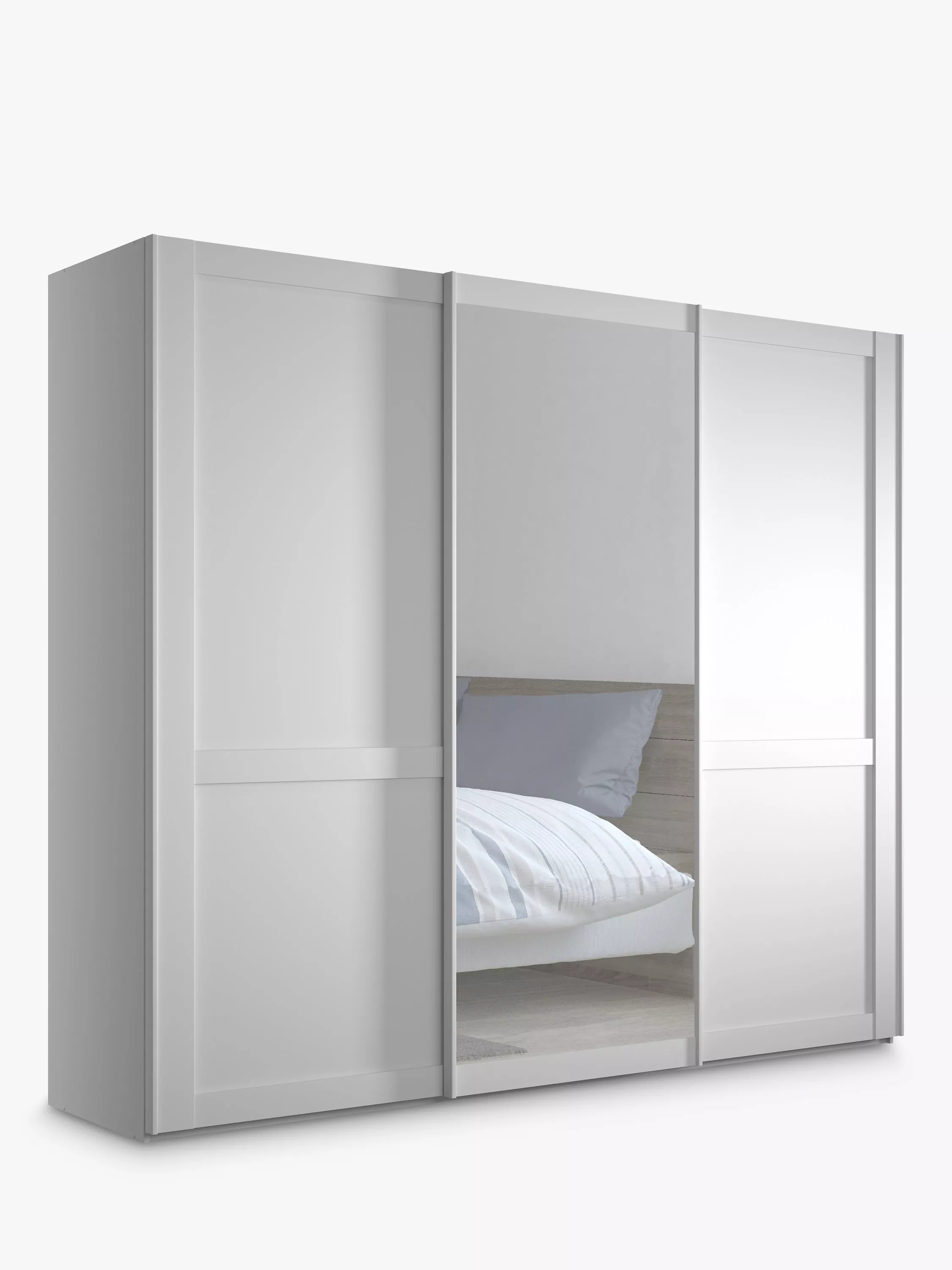 This wardrobe's middle sliding door has an exterior mirror. The interior has two double and a single compartment with two shelves and a hanging rail in each, all of which are fully adjustable to suit your requirements. This product is delivered and assembled by the supplier for your convenience.