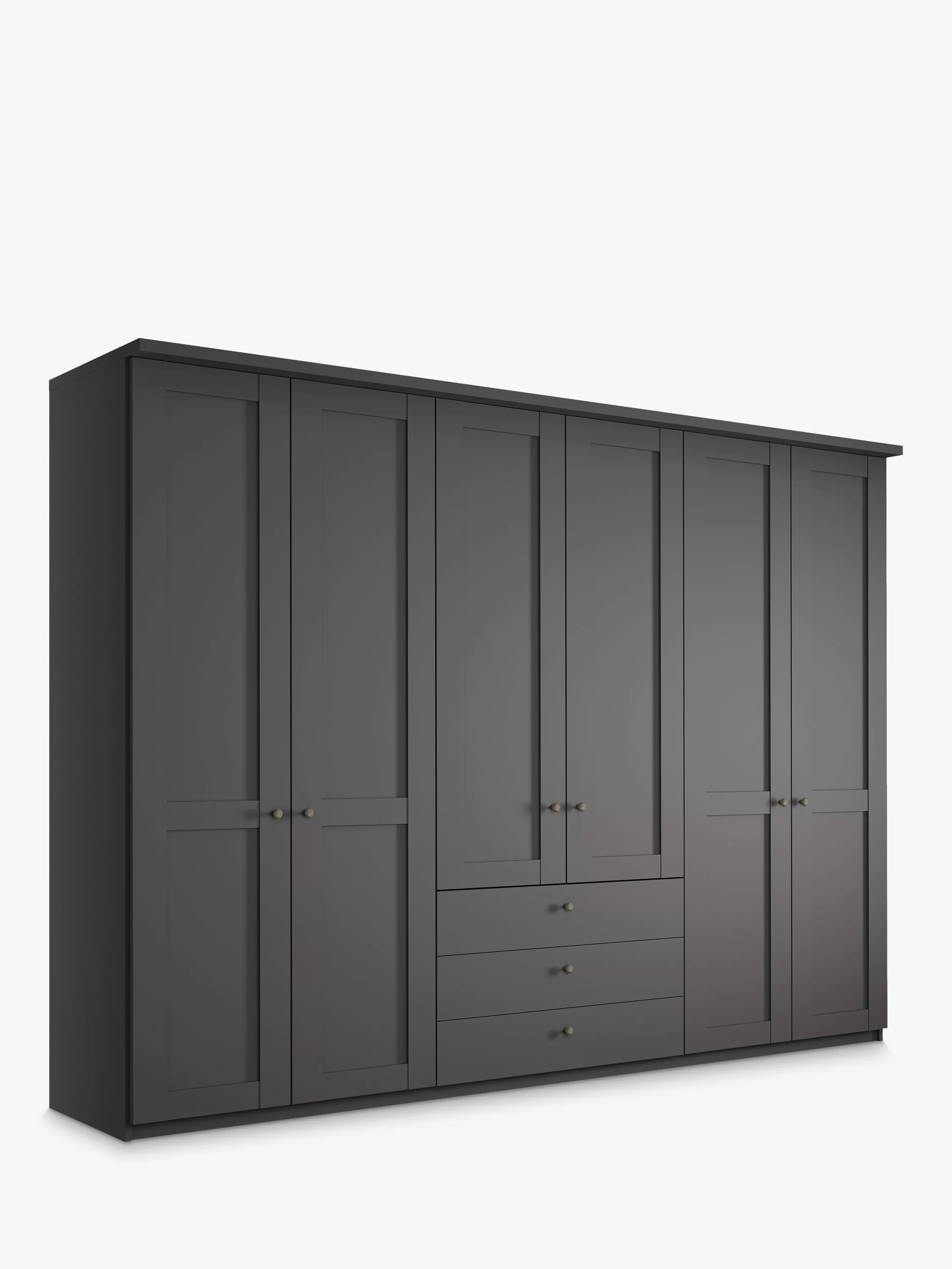 This six-door wardrobe has three drawers below the two middle doors. The interior has three double compartments. Each compartment is completed with two shelves and a hanging rail, all of which are fully adjustable to suit your requirements.