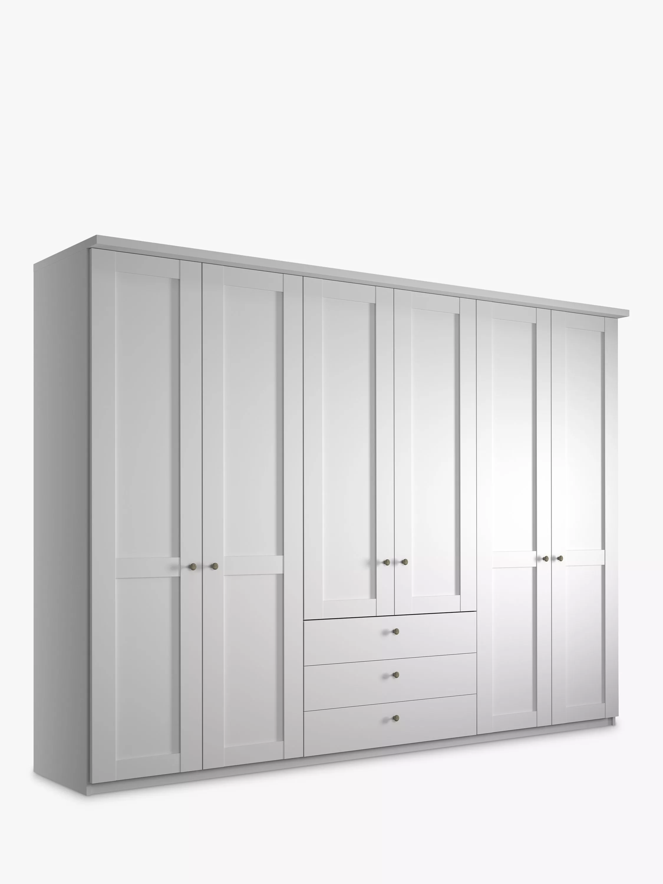 This six-door wardrobe has three drawers below the two middle doors. The interior has three double compartments. Each compartment is completed with two shelves and a hanging rail, all of which are fully adjustable to suit your requirements.