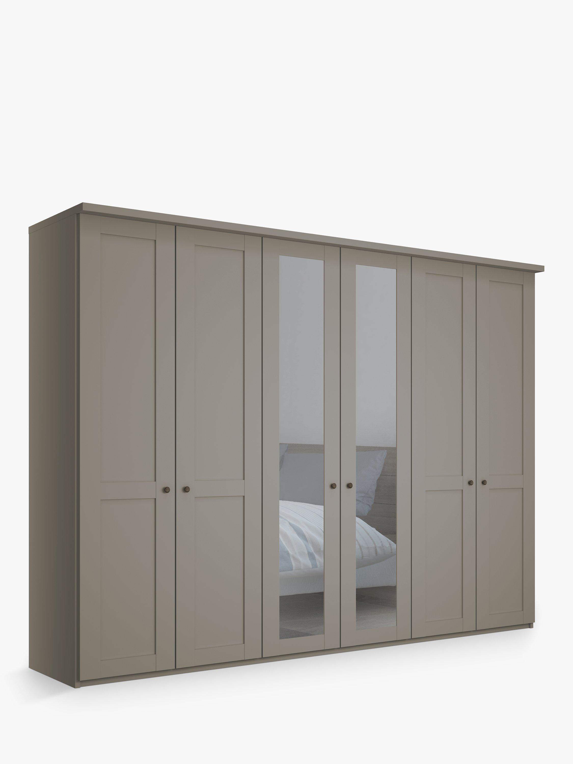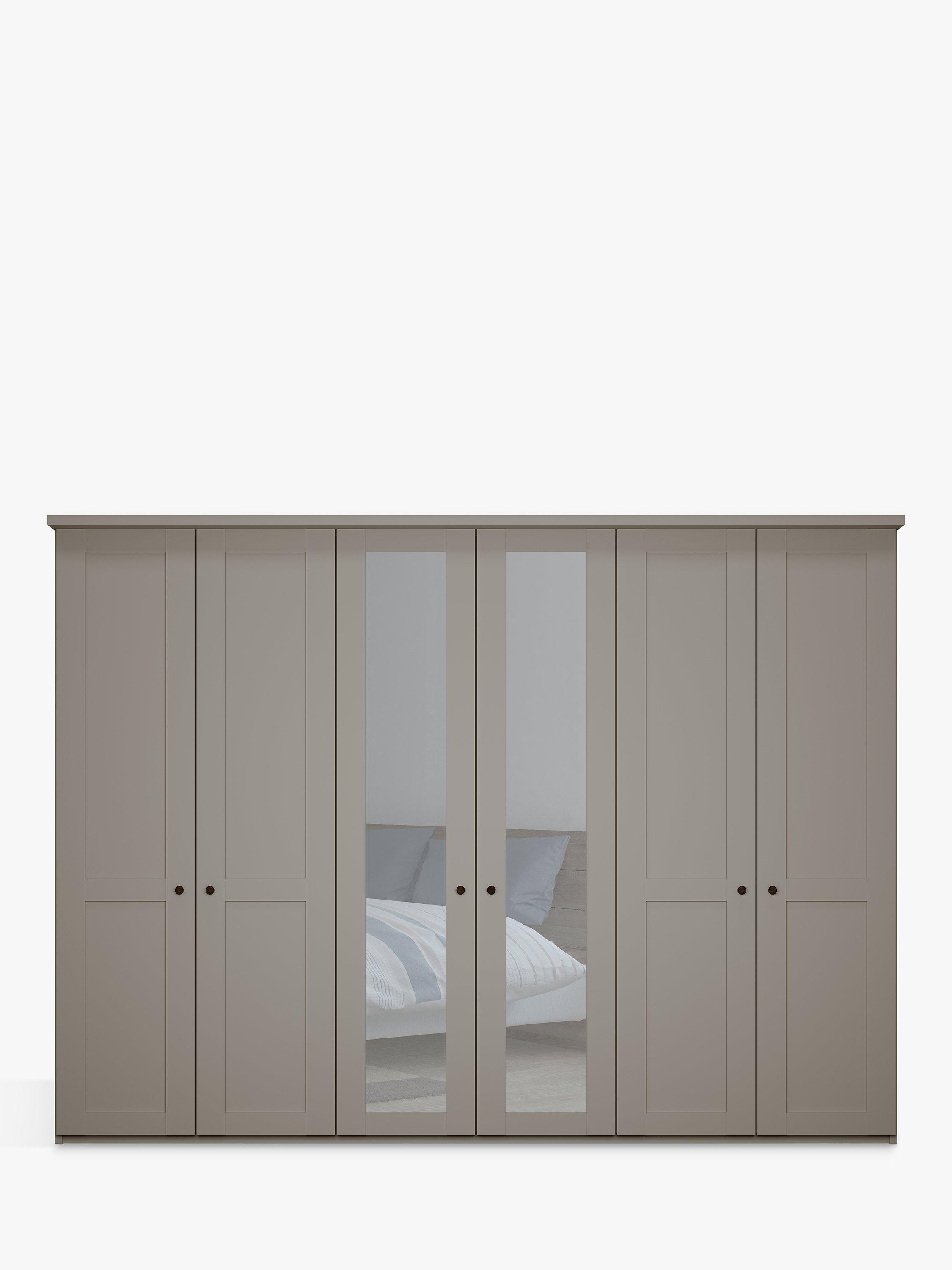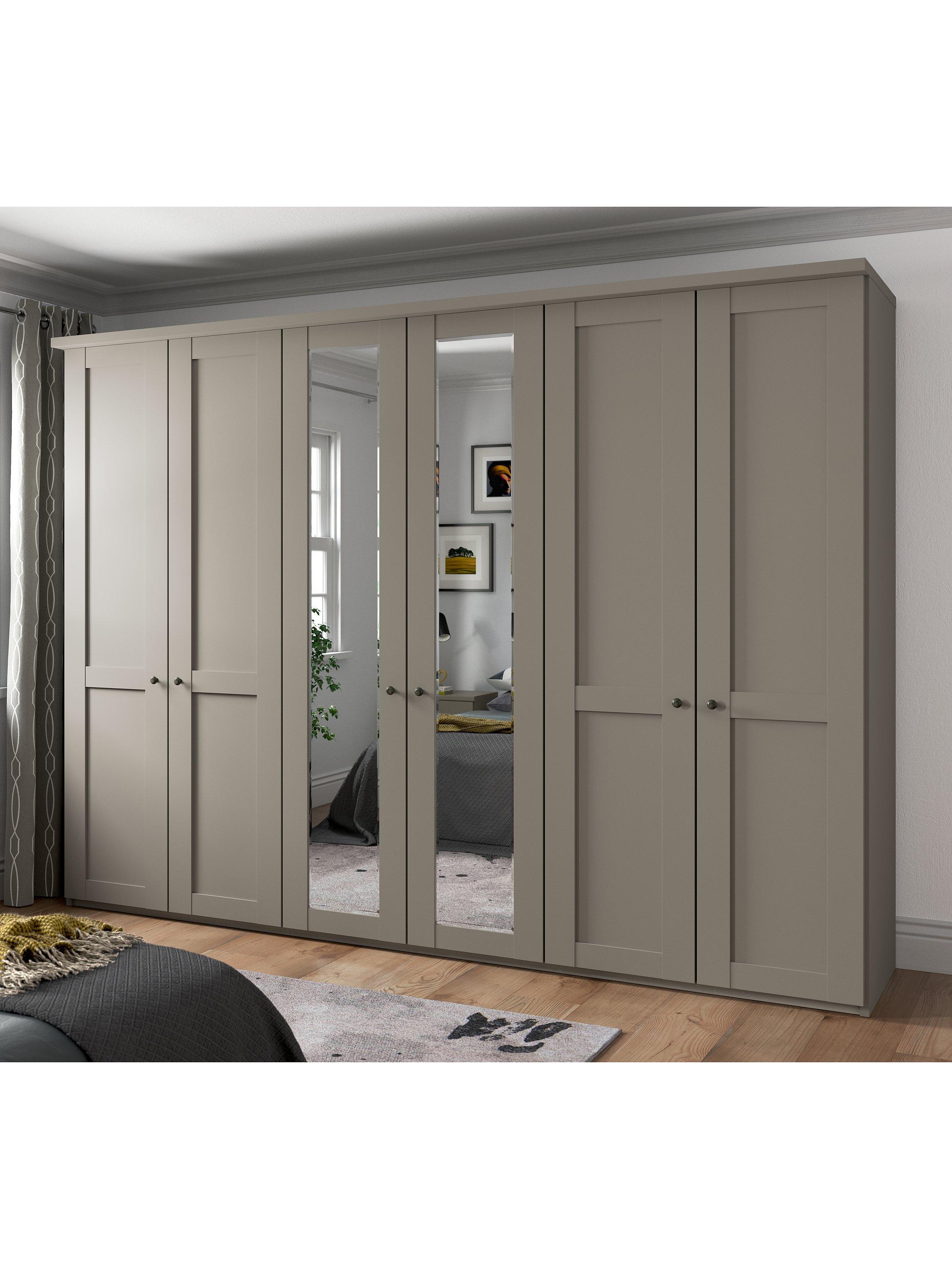 This wardrobe's two middle doors have exterior mirrors. The interior has three double compartments with two shelves and a hanging rail in each, all of which are fully adjustable to suit your requirements. This product is delivered and assembled by the supplier for your convenience.
