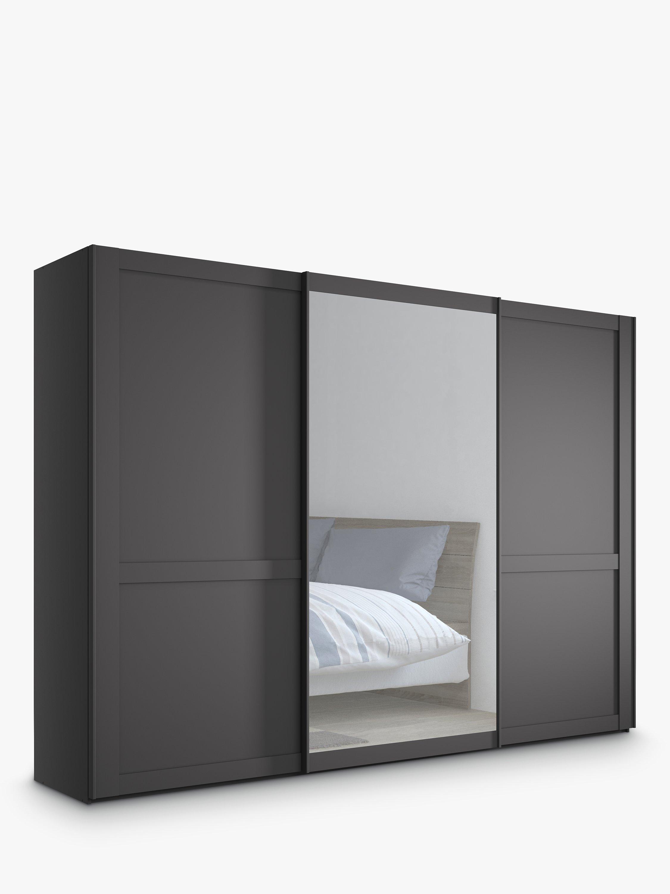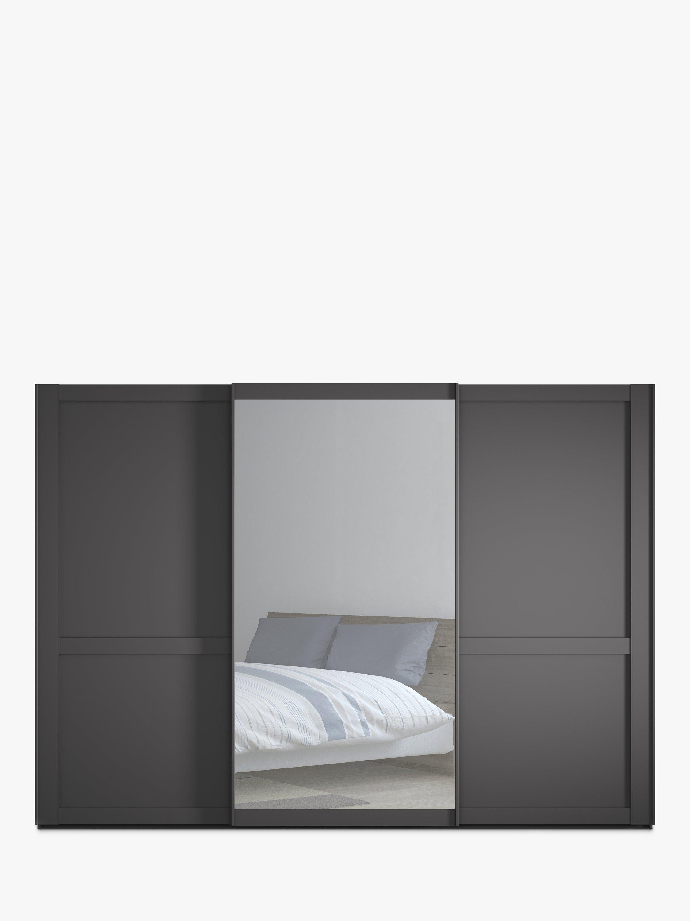 This wardrobe's middle door has an exterior mirror. The interior has two double and a single compartment with two shelves and a hanging rail in each, all of which are fully adjustable to suit your requirements. This product is delivered and assembled by the supplier for your convenience.