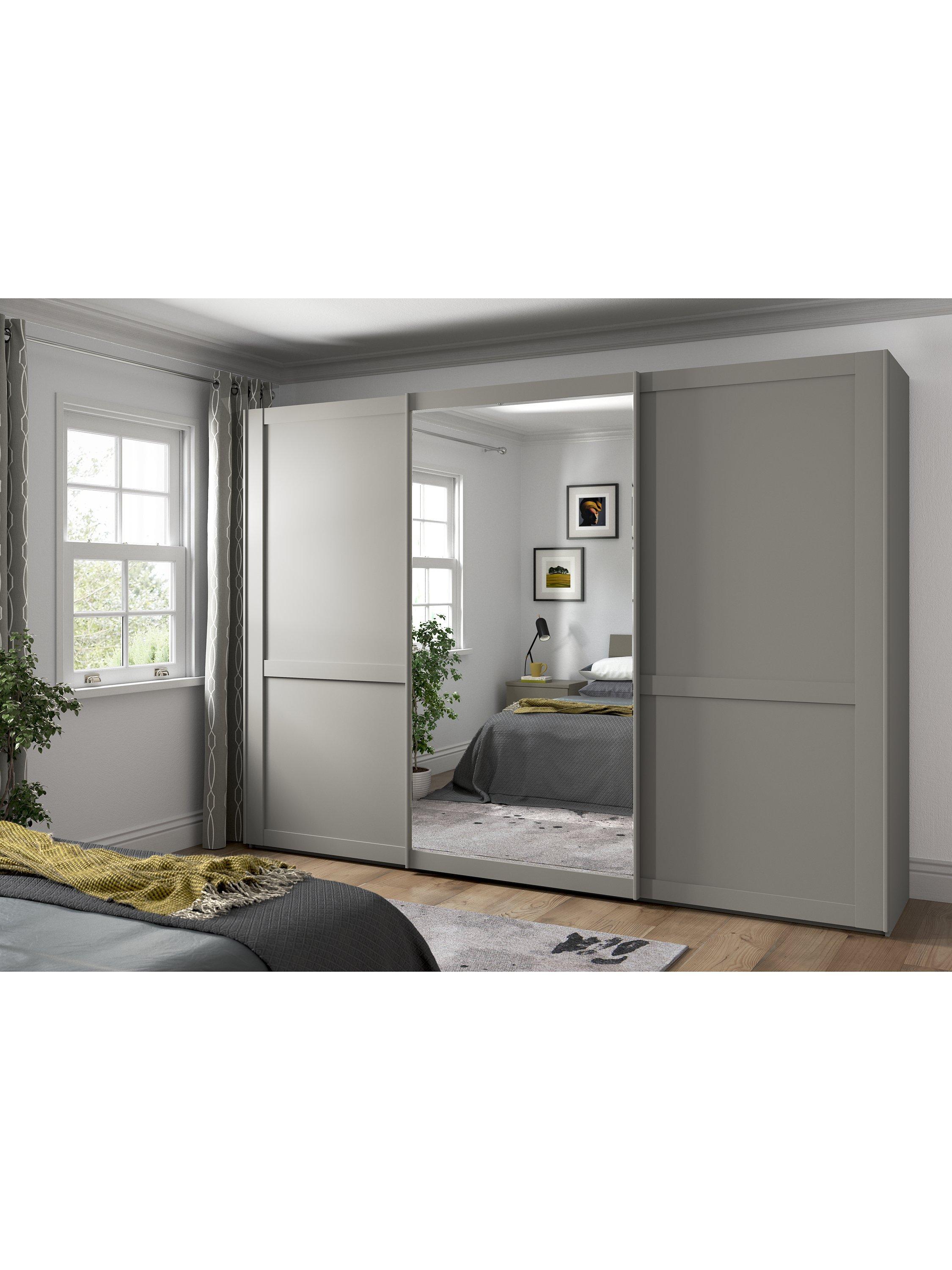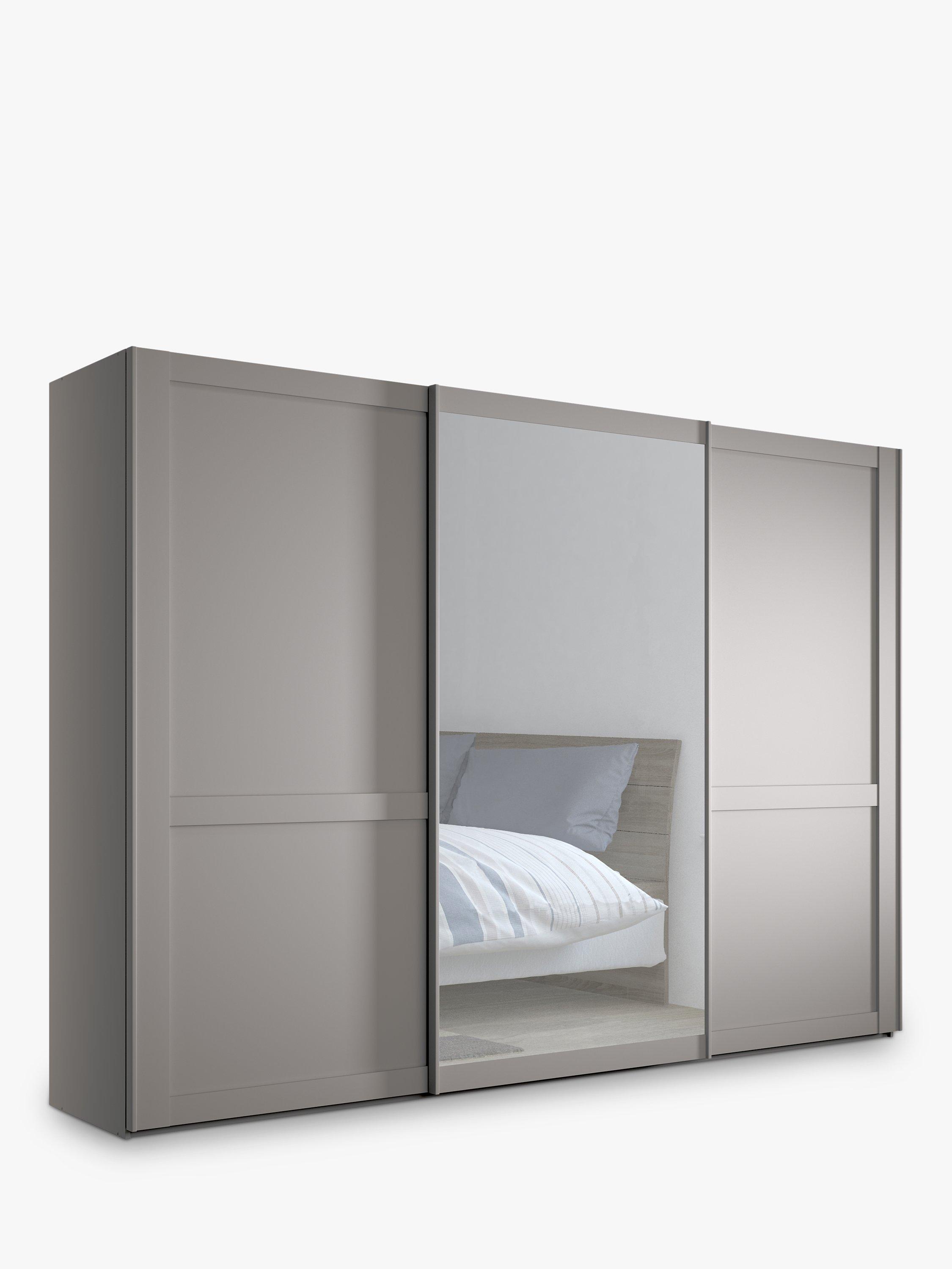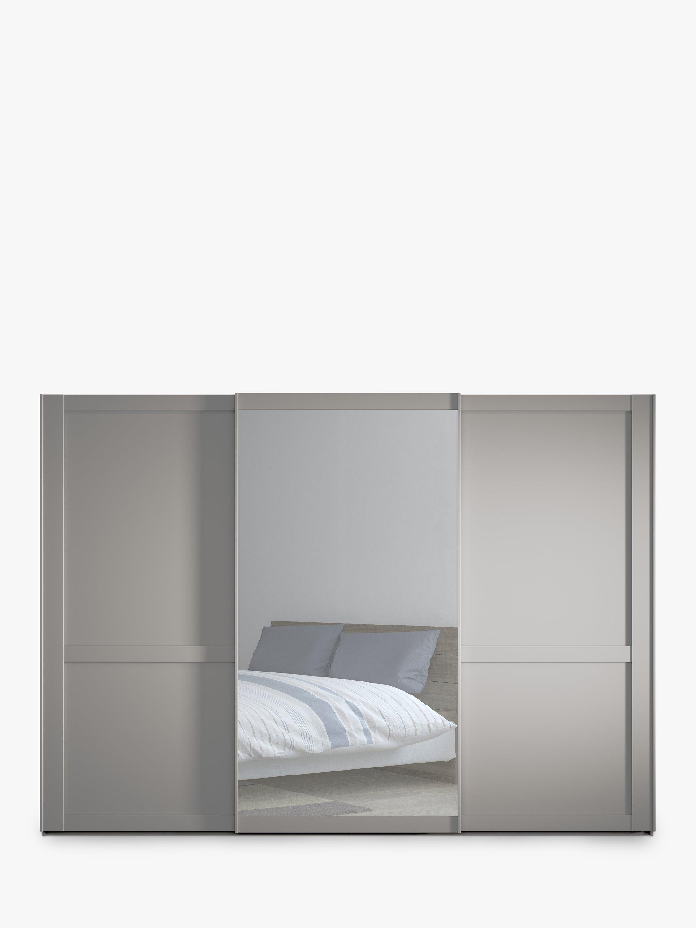 This wardrobe's middle door has an exterior mirror. The interior has two double and a single compartment with two shelves and a hanging rail in each, all of which are fully adjustable to suit your requirements. This product is delivered and assembled by the supplier for your convenience.
