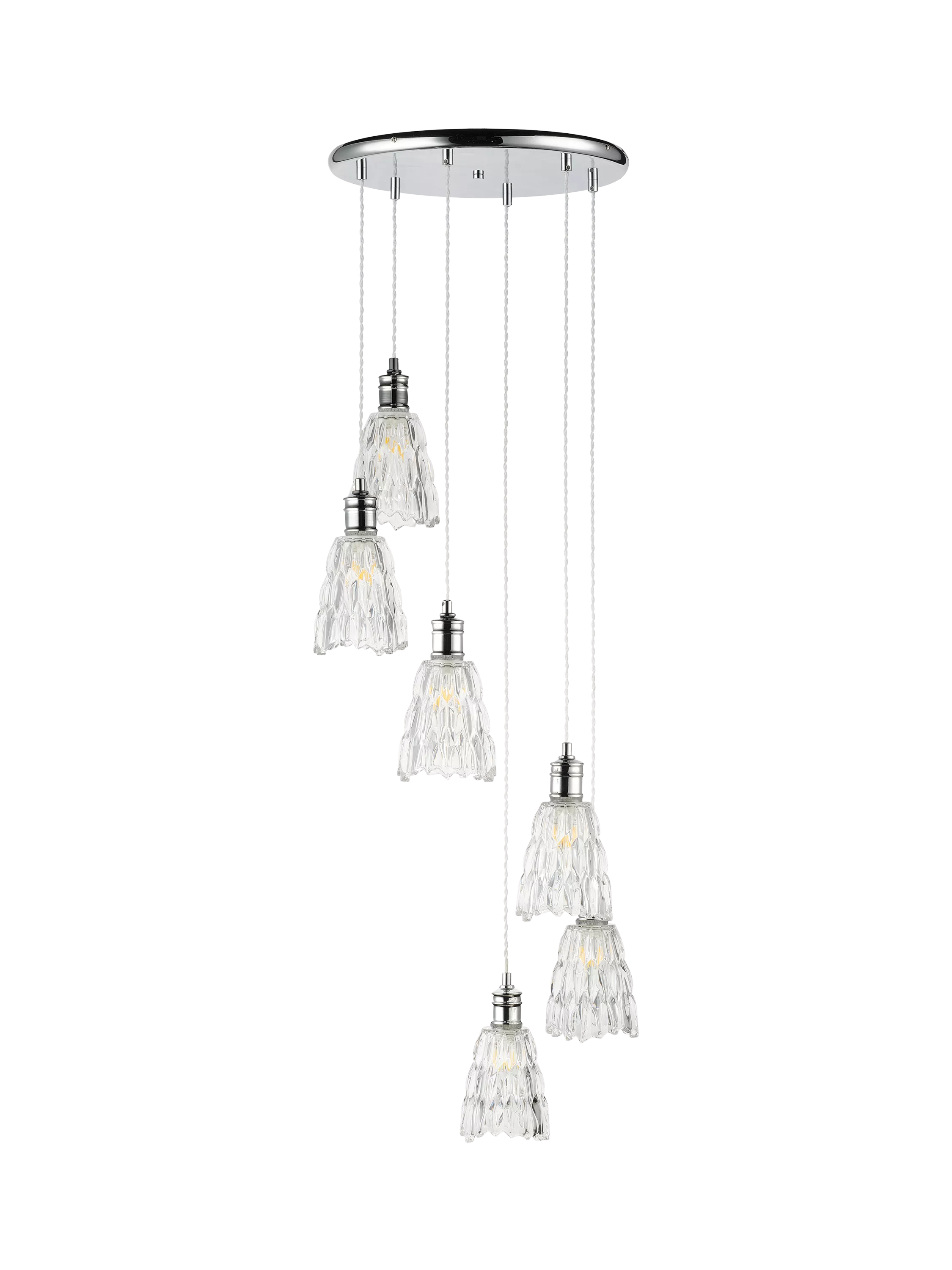 Bring timeless elegance to your home with this stunning six-light cascading pendant chandelier. Featuring a chrome finish and six beautifully sculpted crystal glass shades, this fixture creates a mesmerising lighting display.