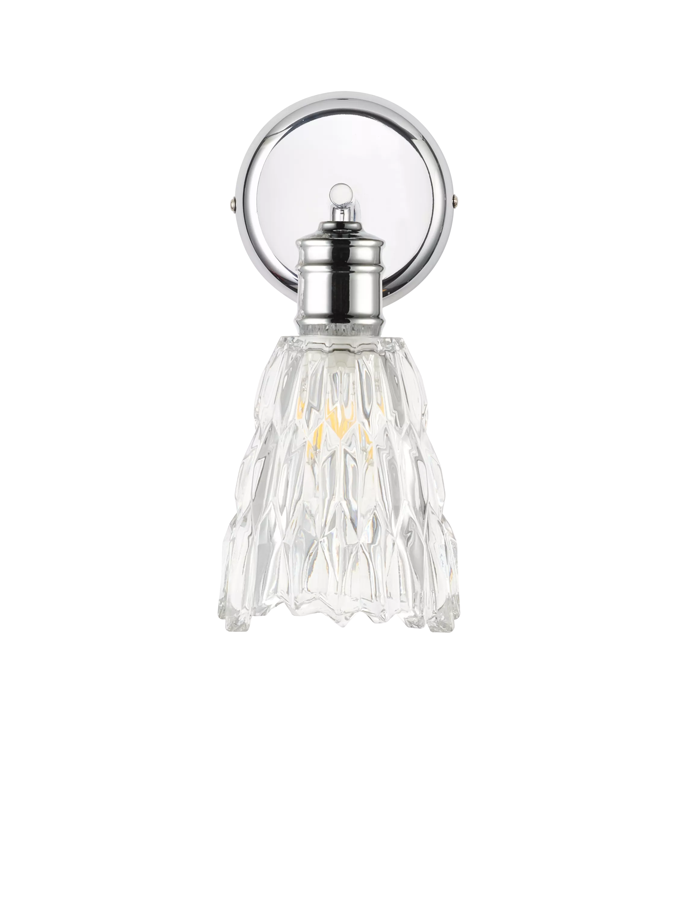 Add a touch of sophistication to your space with this chrome and crystal glass wall light. Featuring a beautifully sculpted crystal glass shade and a chrome wall mount, this fixture creates a dazzling lighting effect that enhances any room.