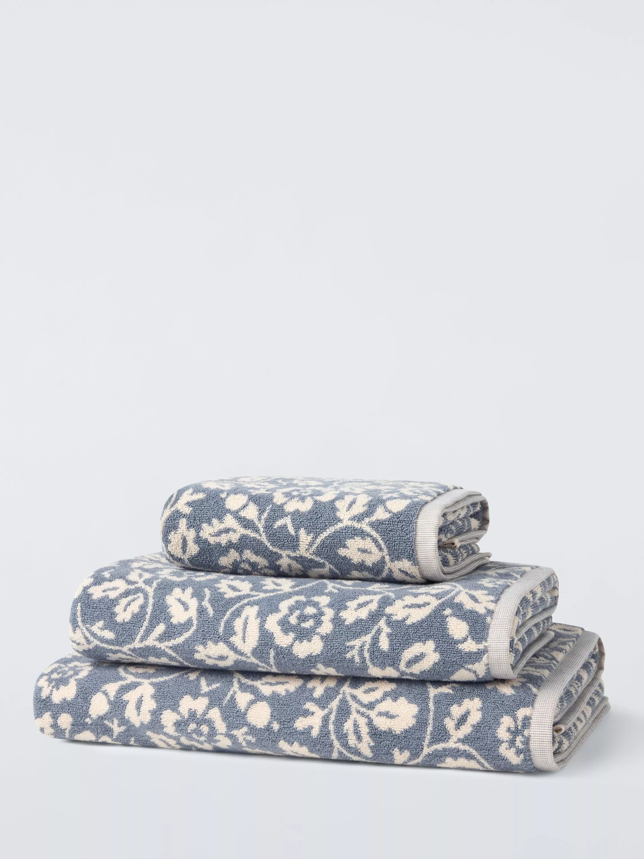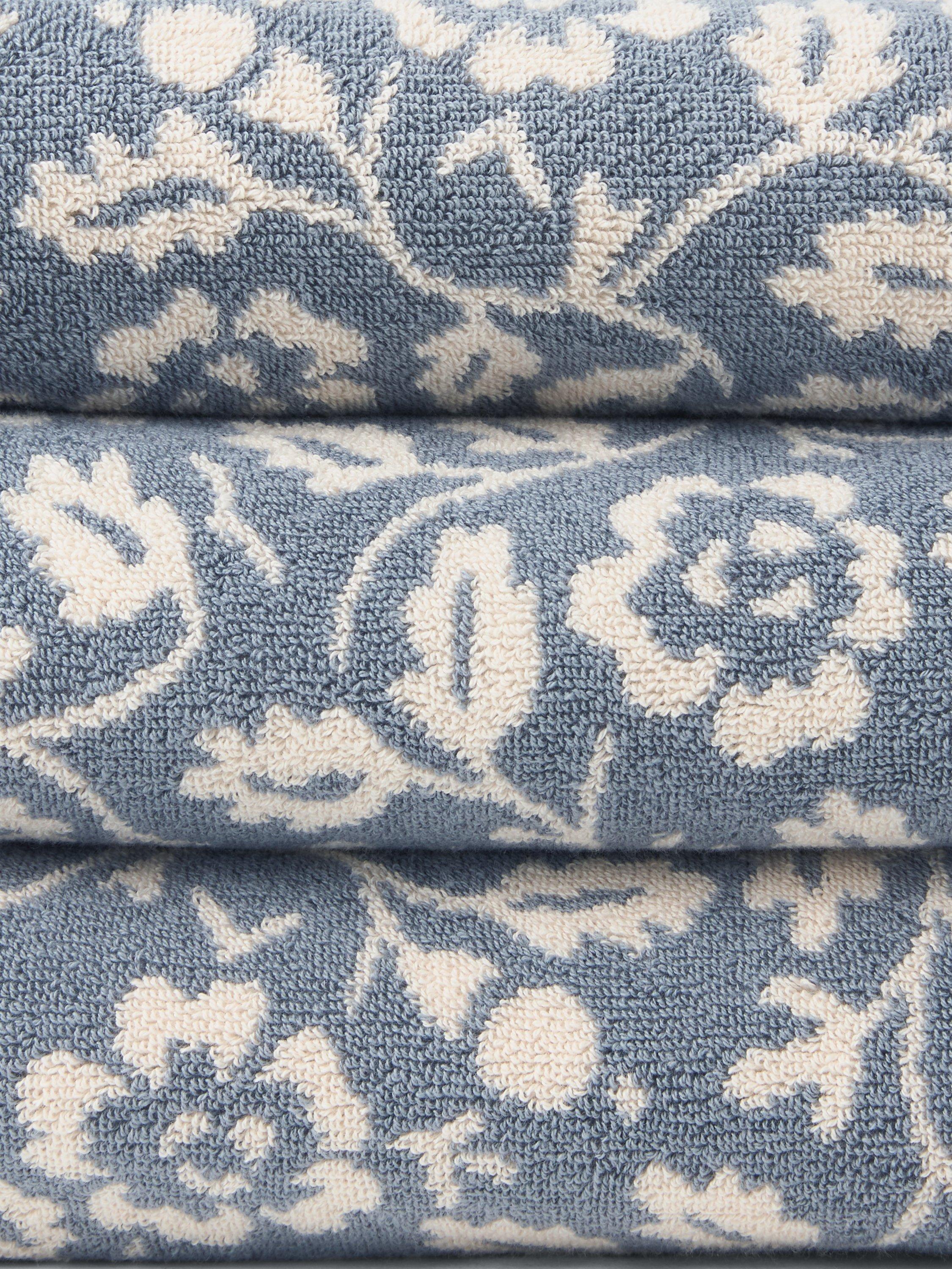 Soft, looped pile towels in a classic floral that echoes the textiles designs of William Morris.