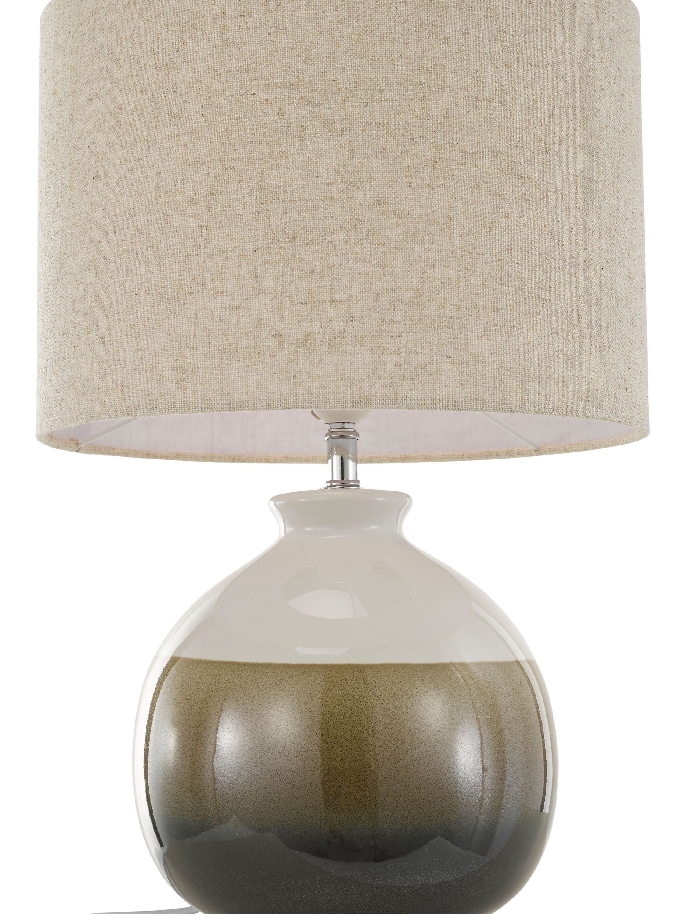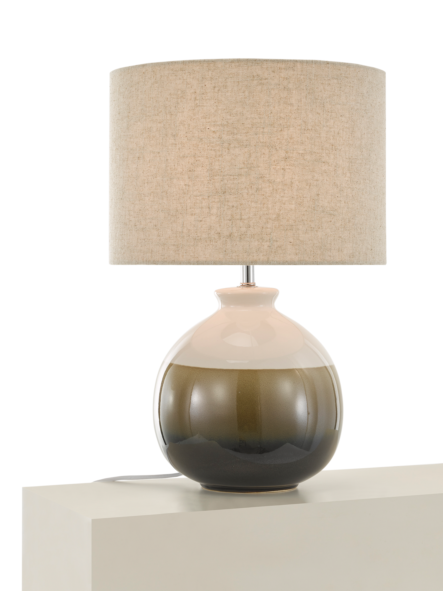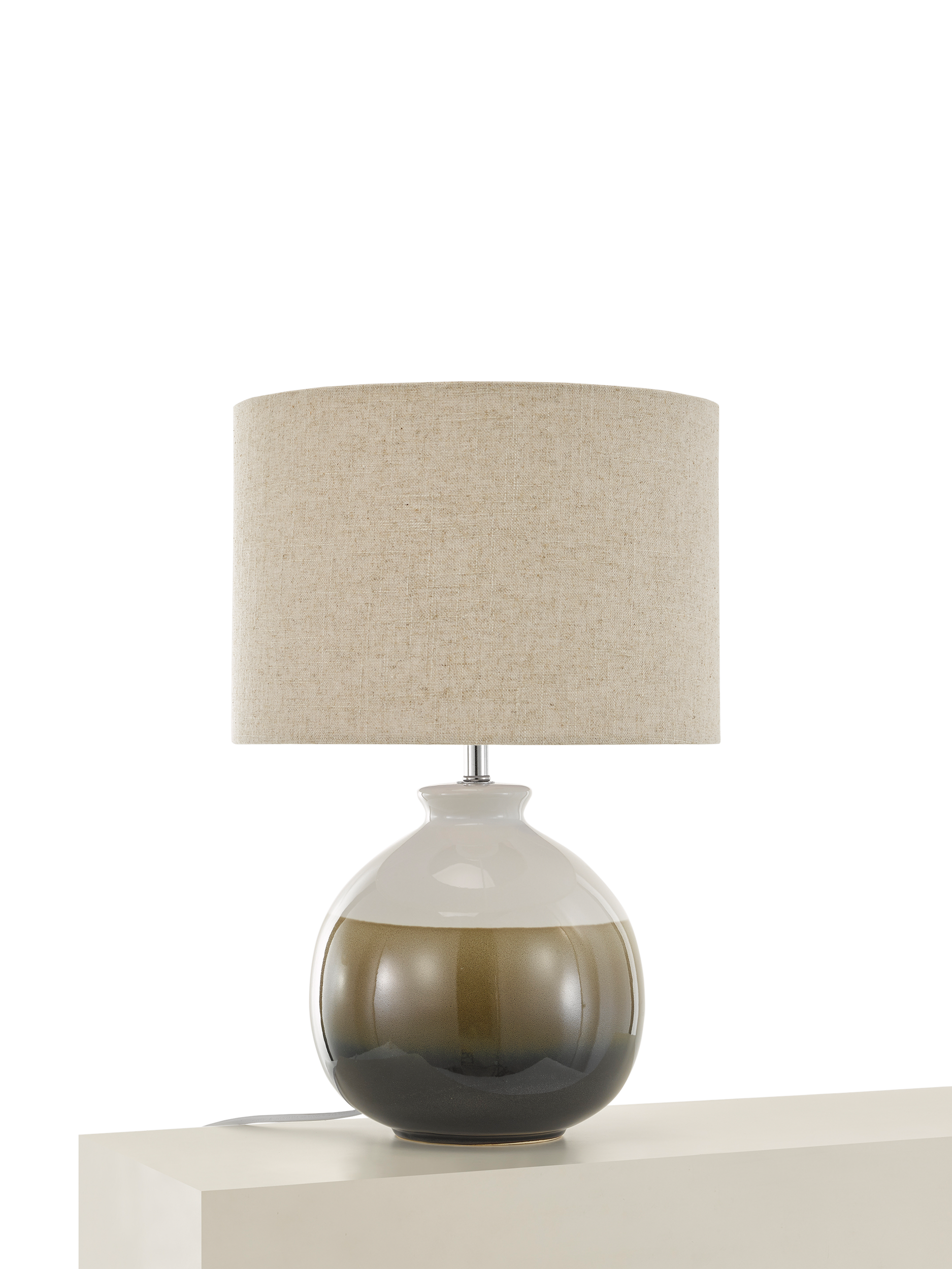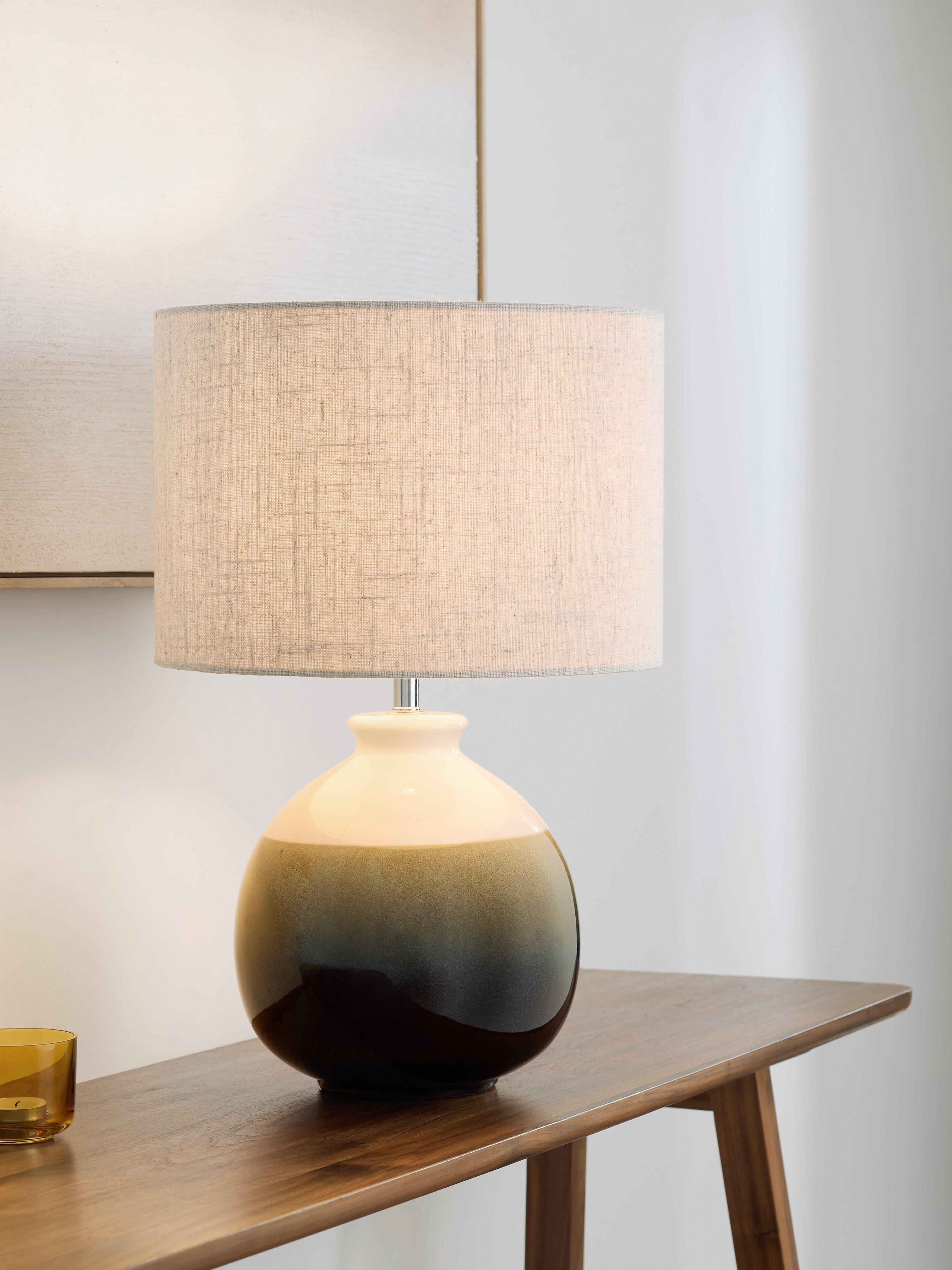 This table lamp is made with a ceramic base paired with a natural linen lampshade that diffuses the light. The glaze finish has a fluid reactive ombre style therefore variations in the colour and pattern are to be expected and each lamp base will be unique.