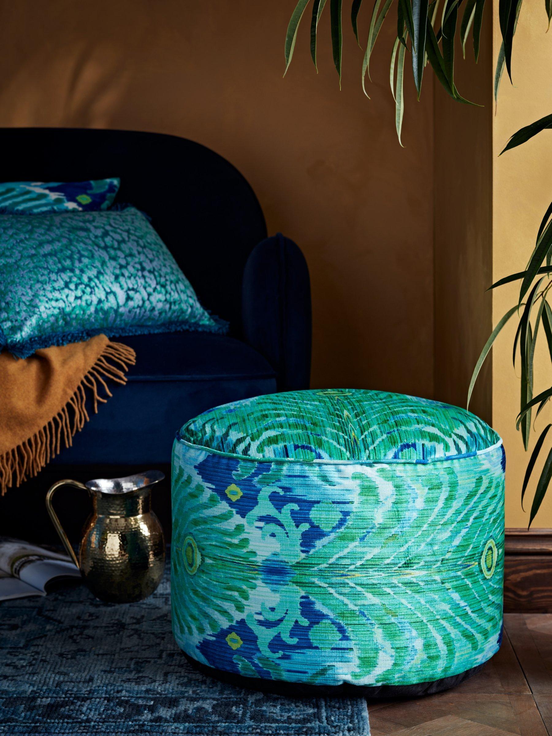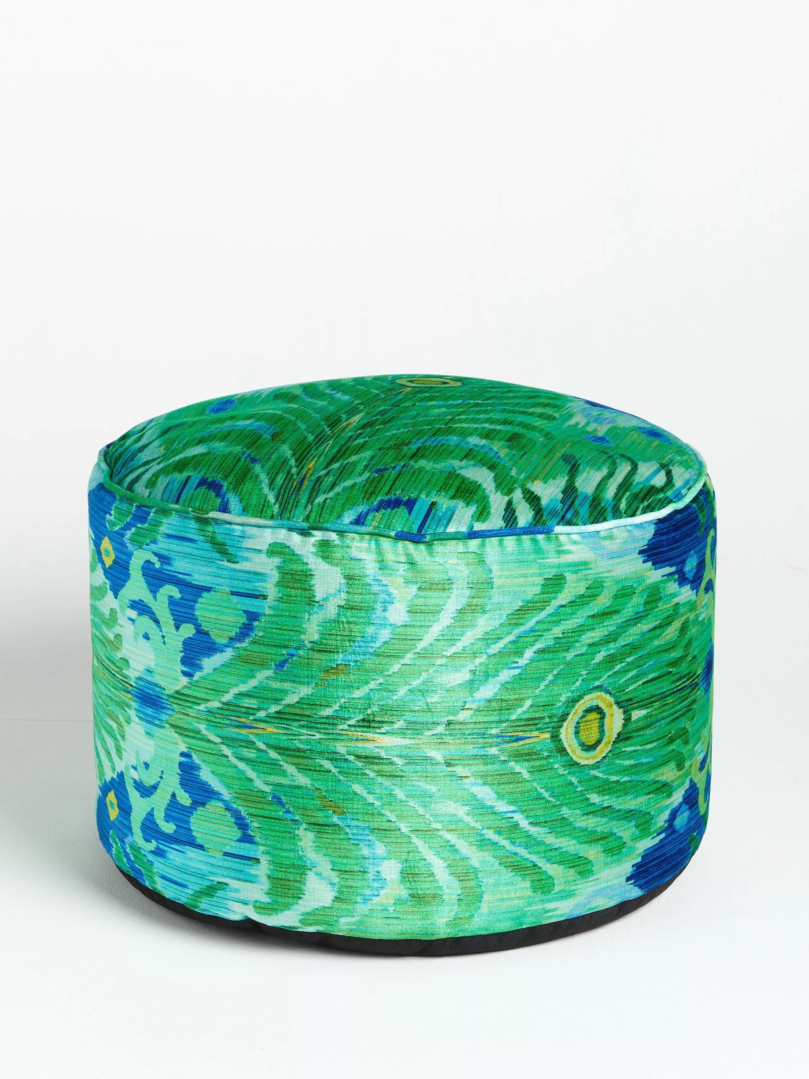 Printed on a luxurious velvet base, the majestic fronds of a peacock feather have been picked out in vibrant tones. Comfy to sit on, or use as a foot rest, this stylish pouffe has a neat, piped edge.