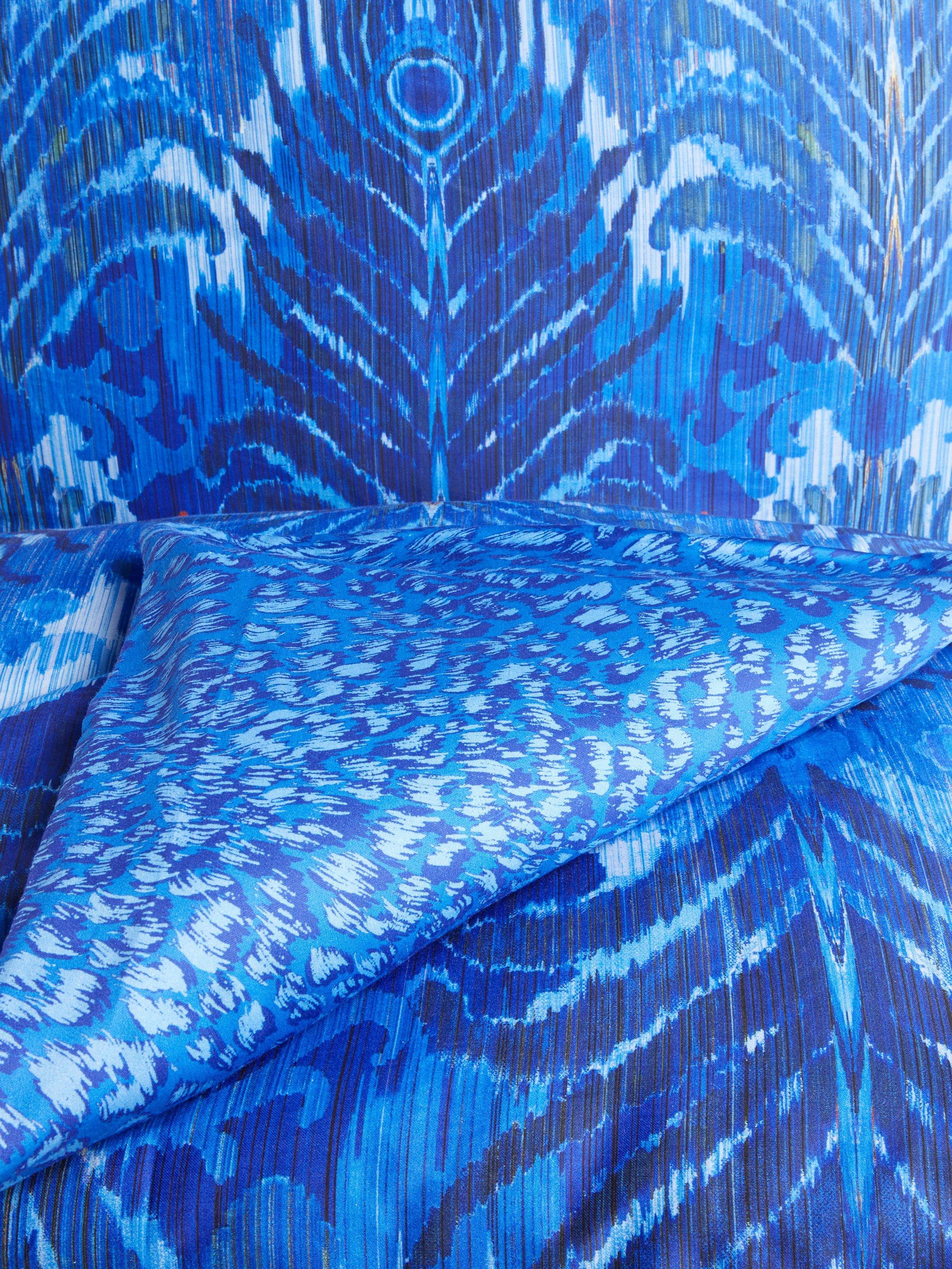 "I take endless inspiration from this majestic creature. The symmetric and graphic nature of peacock fronds have been rendered into a painterly repeated print to give a unique tapestry-like quality."
