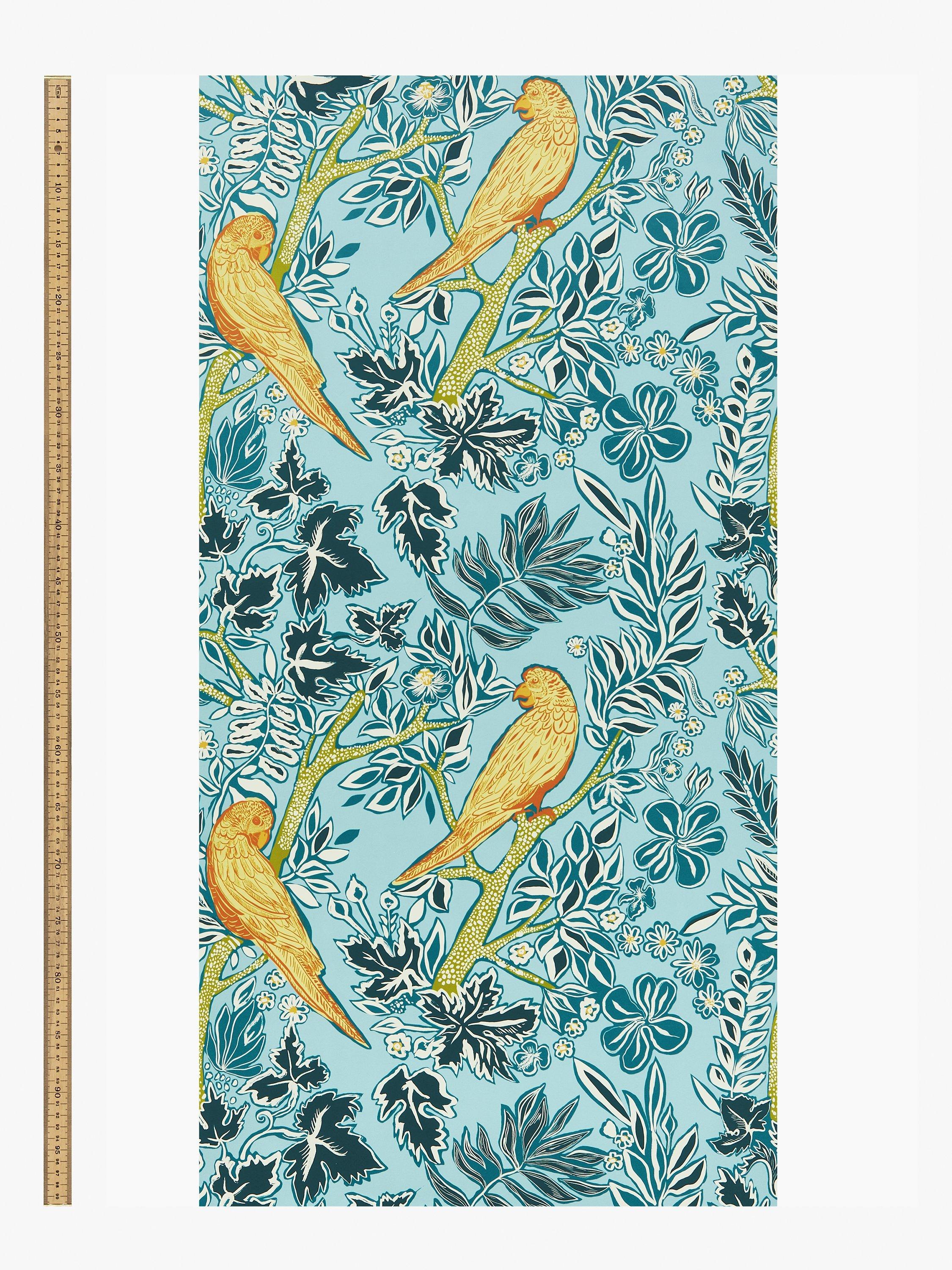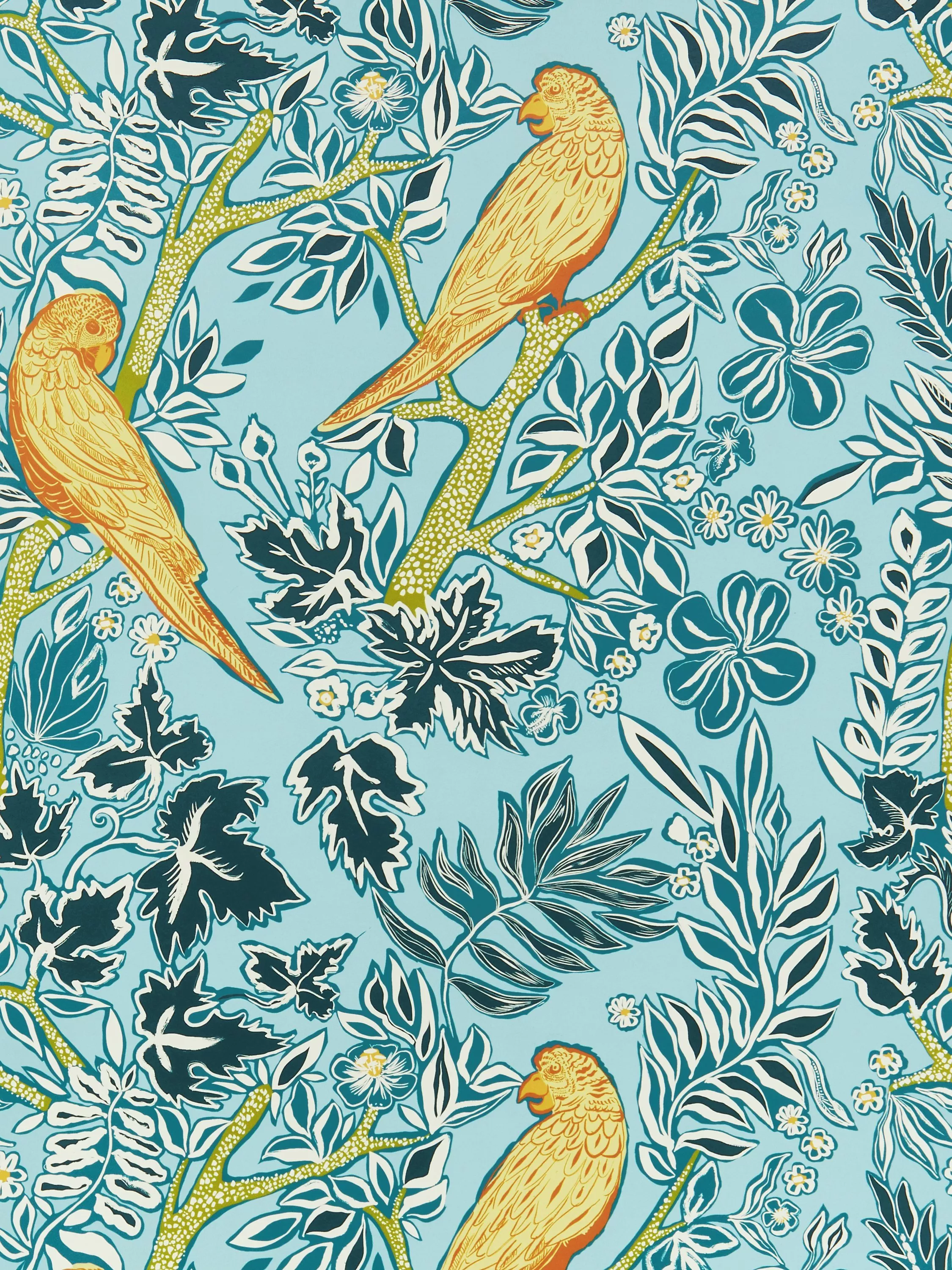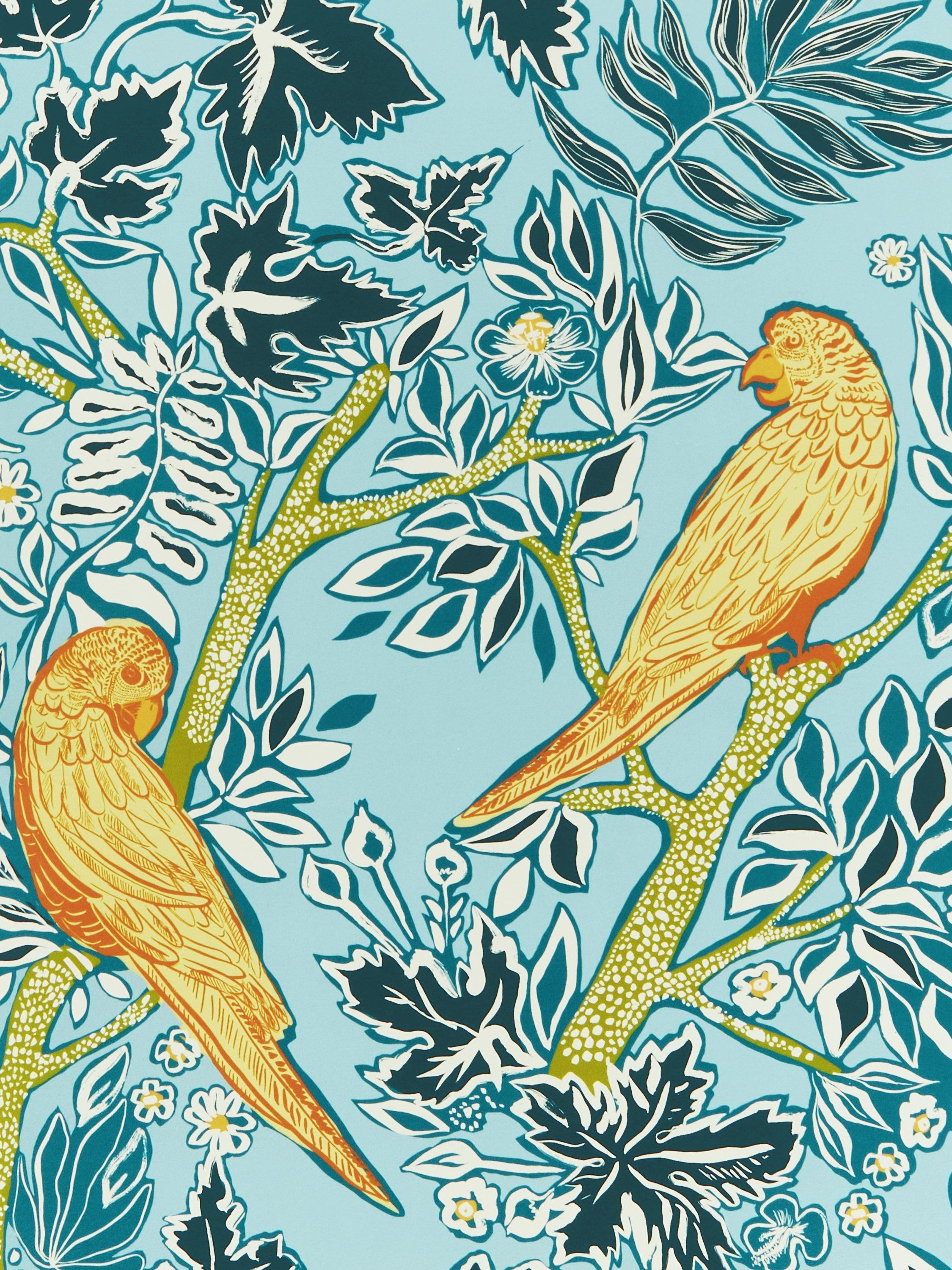 A vibrant, outlined design of colourful parrots perched in trees.