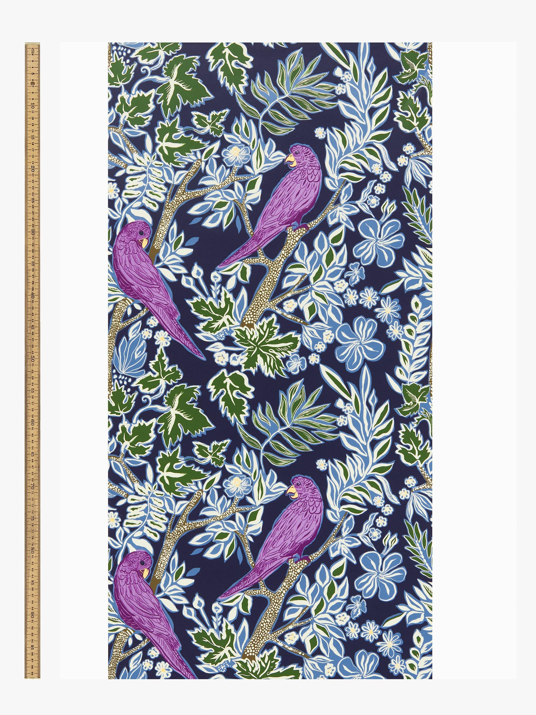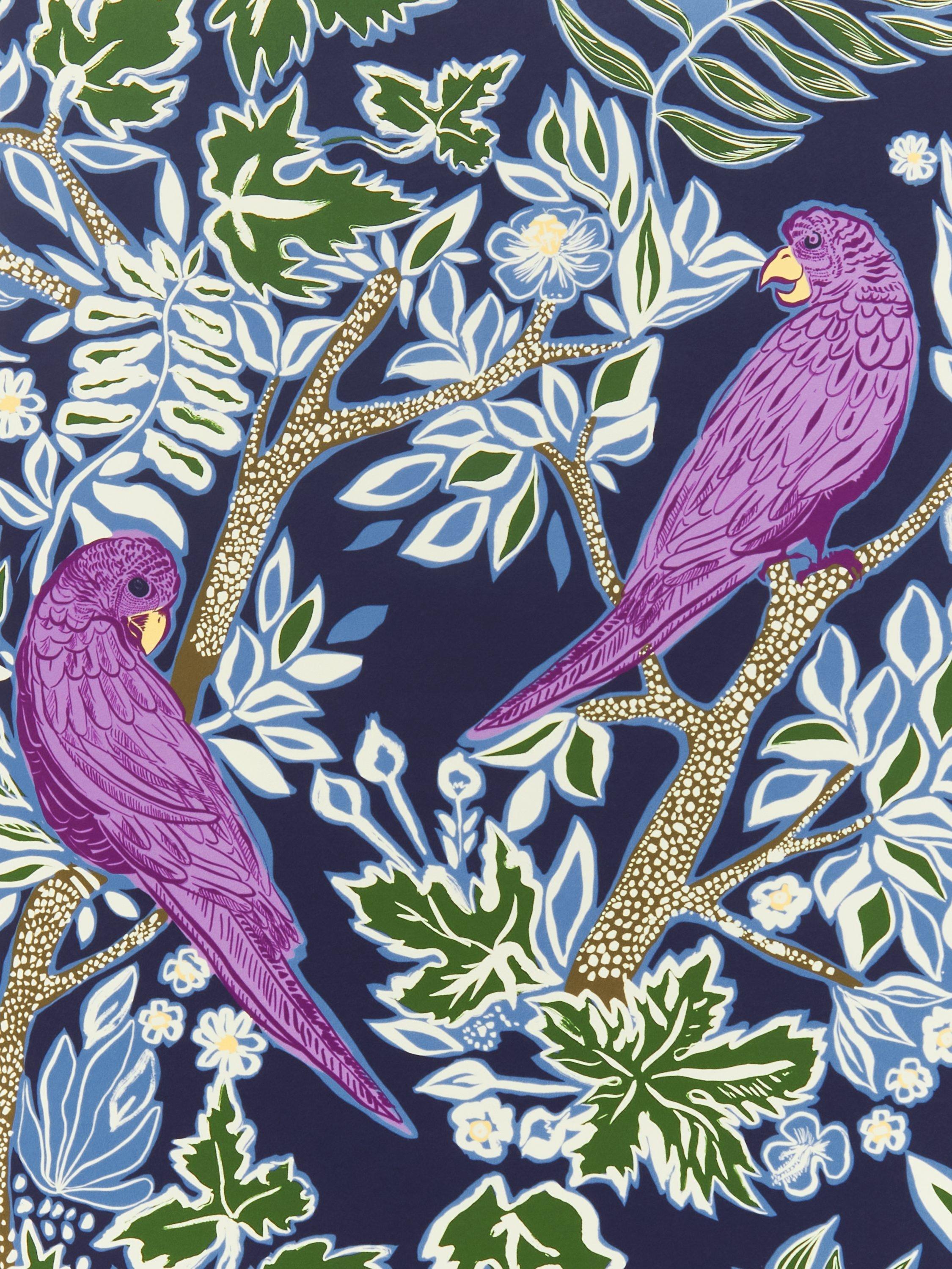 A vibrant, outlined design of colourful parrots perched in trees.