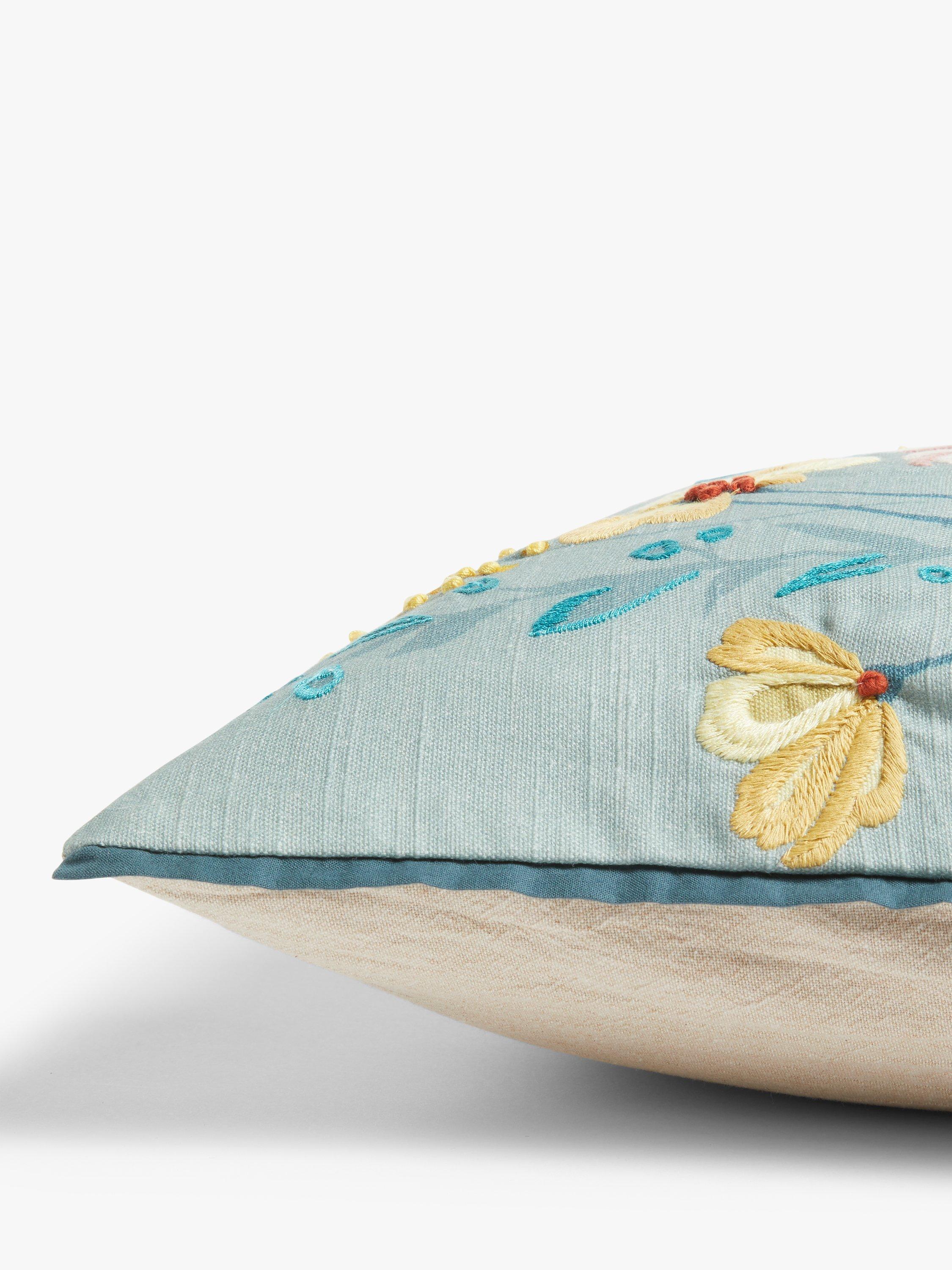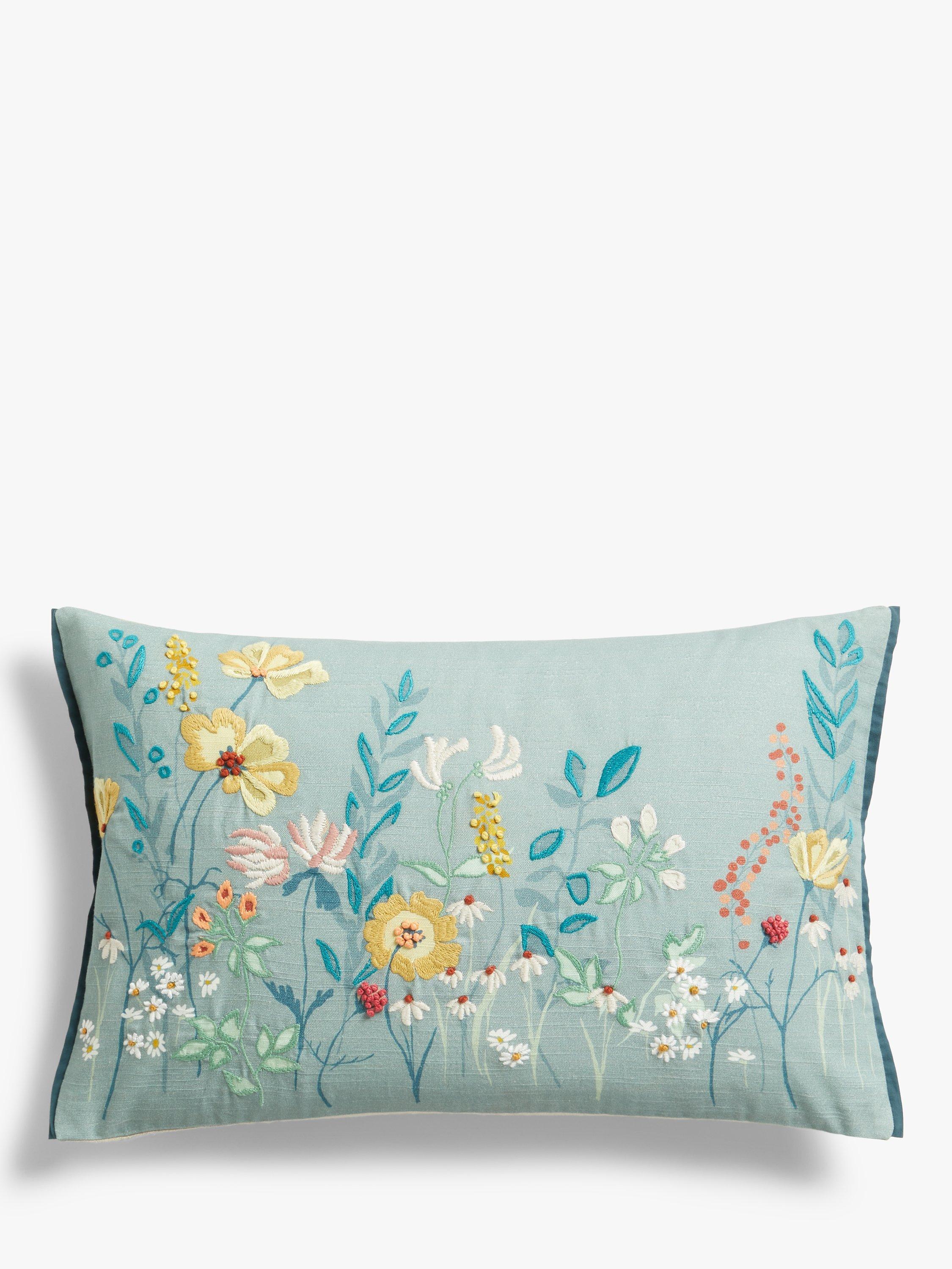 Colourful meadow flowers are embroidered onto the woven cotton background of this pretty, border trim cushion that will add country cottage style to your home.