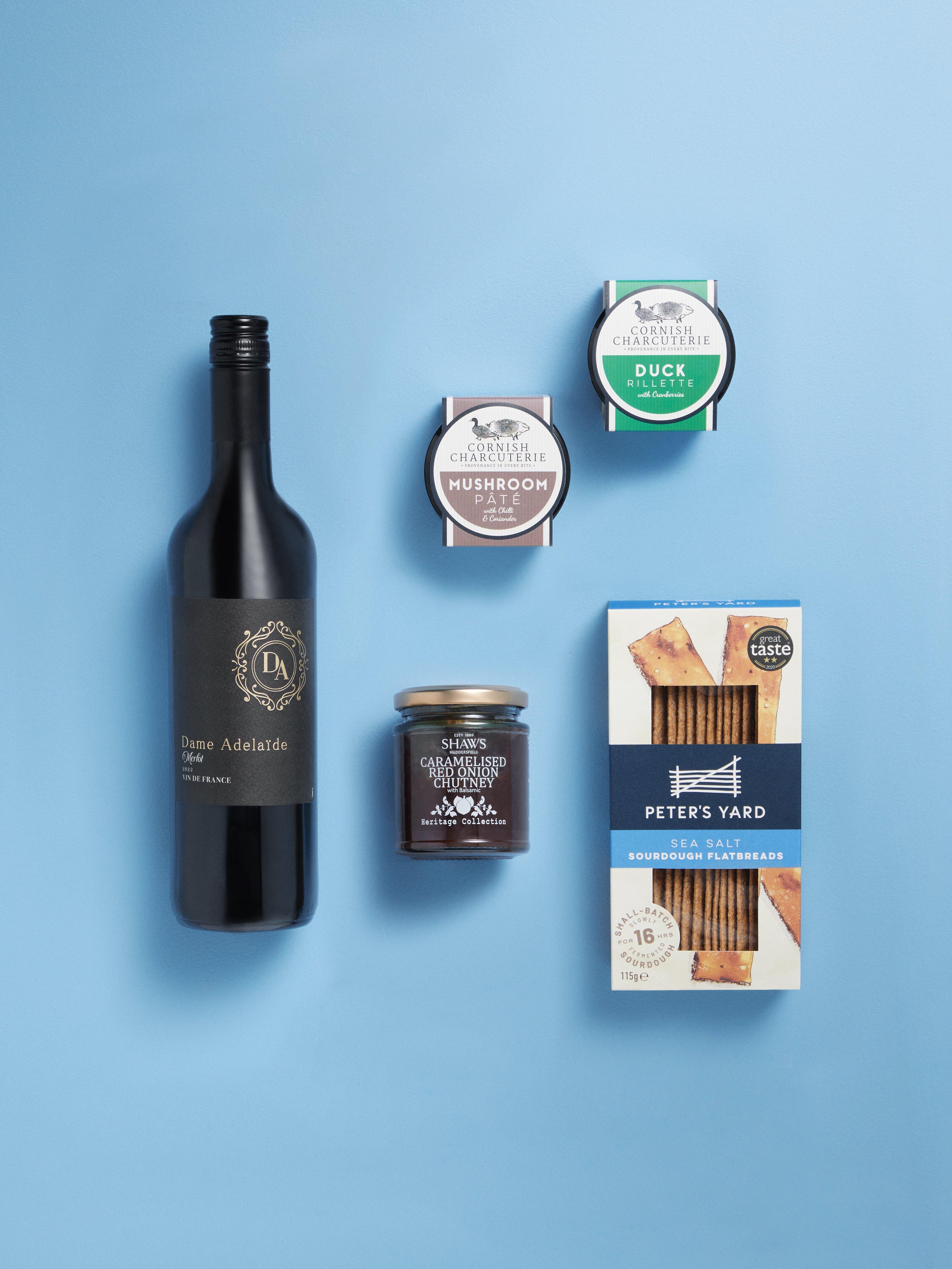- Cornish Charcuterie Mushroom Pate with Chilli & Coriander 82g: Mushrooms (57.75%), Butter (MILK), Onions, Garlic, Sea Salt, Coriander Leaves (0.20%), Chilli Powder (0.06%). Shaws Caramelised Red Onion Chutney with Balsamic 195g: Red onion (65%), Muscovado Sugar, Sugar, Red Wine Vinegar (SULPHITES), Balsamic Vinegar (Wine Vinegar, Grape Must) (7%)(SULPHITES), Cornflour, Salt, Black Pepper. Peter's Yard Sea Salt Flatbreads 115g: WHEAT flour (WHEAT flour, Calcium, Iron, Thiamin, Niacin), wholemeal WHEAT flour, sourdough 25% (RYE flour, water), rapeseed oil, muscovado sugar, sea salt 3%. Topping: Sea salt (Halen Môn PD) Dame Adelaide Merlot Vin De France 75cl: Grapes, acidity regulators (calcium sulfate), preservatives (SULPHITES), stabilizing agents (metatartaric acid) Cornish Charcuterie Duck Rillette with Cranberries 82g: Duck (63.3%), Duck Fat, Dried Cranberries (3.19%), Salt, Chinese Five Spice.May contain. CELERY, MUSTARD, TREE NUTS, MILK, SESAME, PEANUTS. For allergens, see ingredients in capitals.