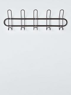 A simple and practical hanging storage solution with 5 shaped metal hooks on an elliptical open-shaped rack.