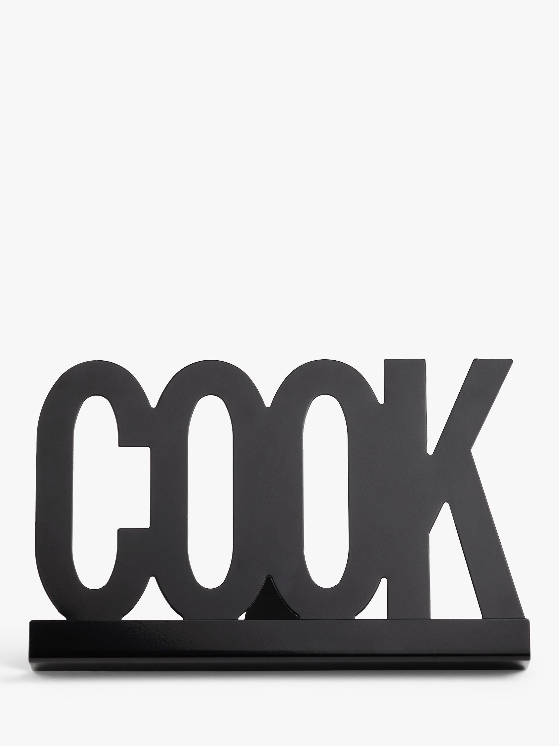A contemporary cookbook stand for your kitchen countertop. Freestanding, it fits standard-sized cookbooks and tablet devices for following recipes.
