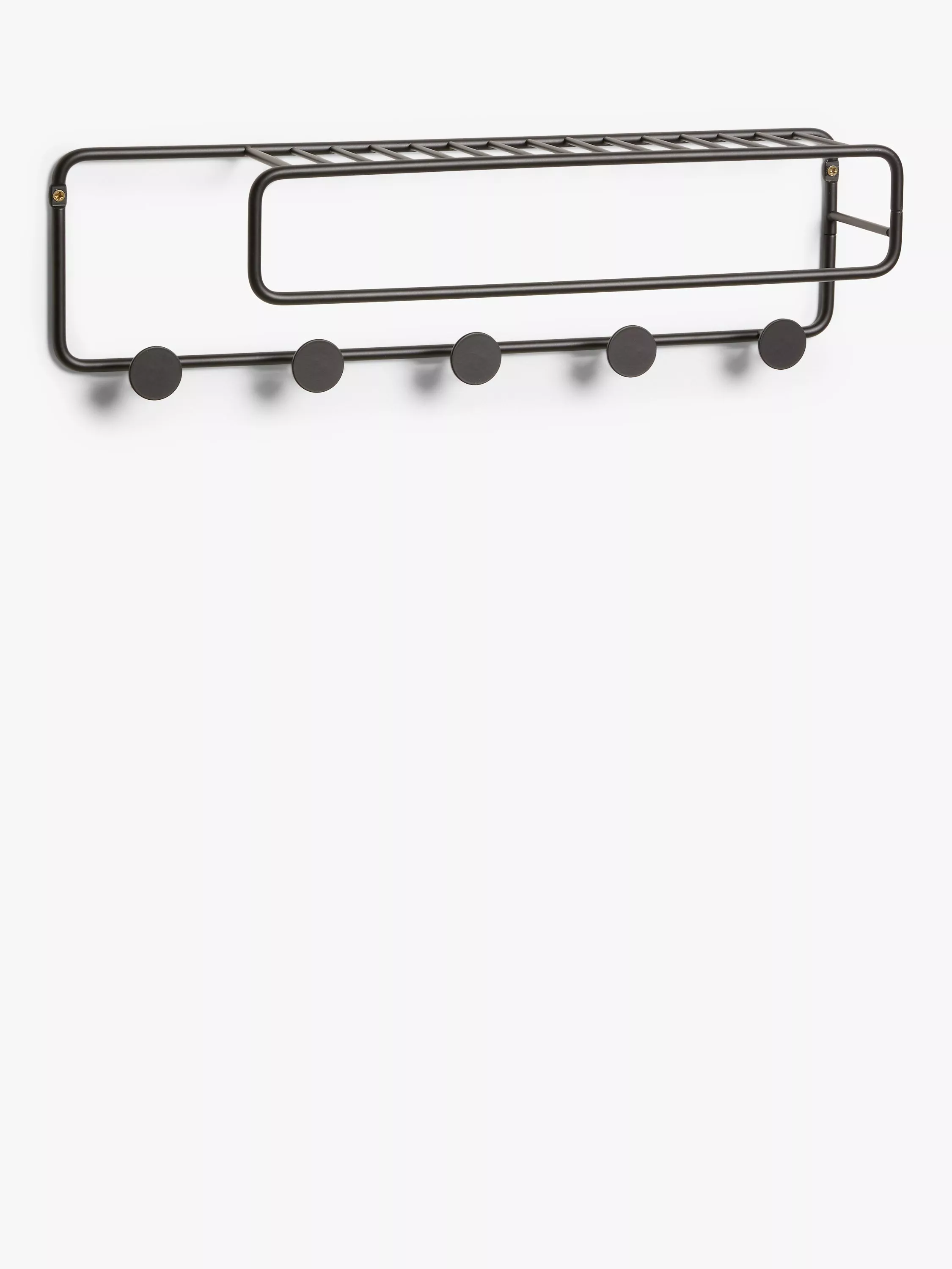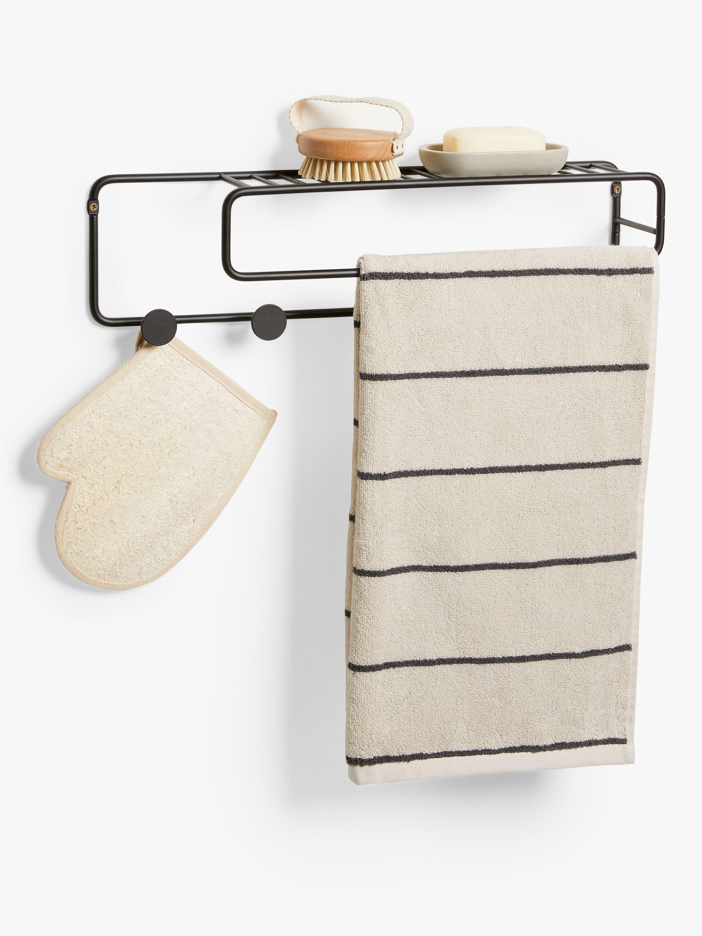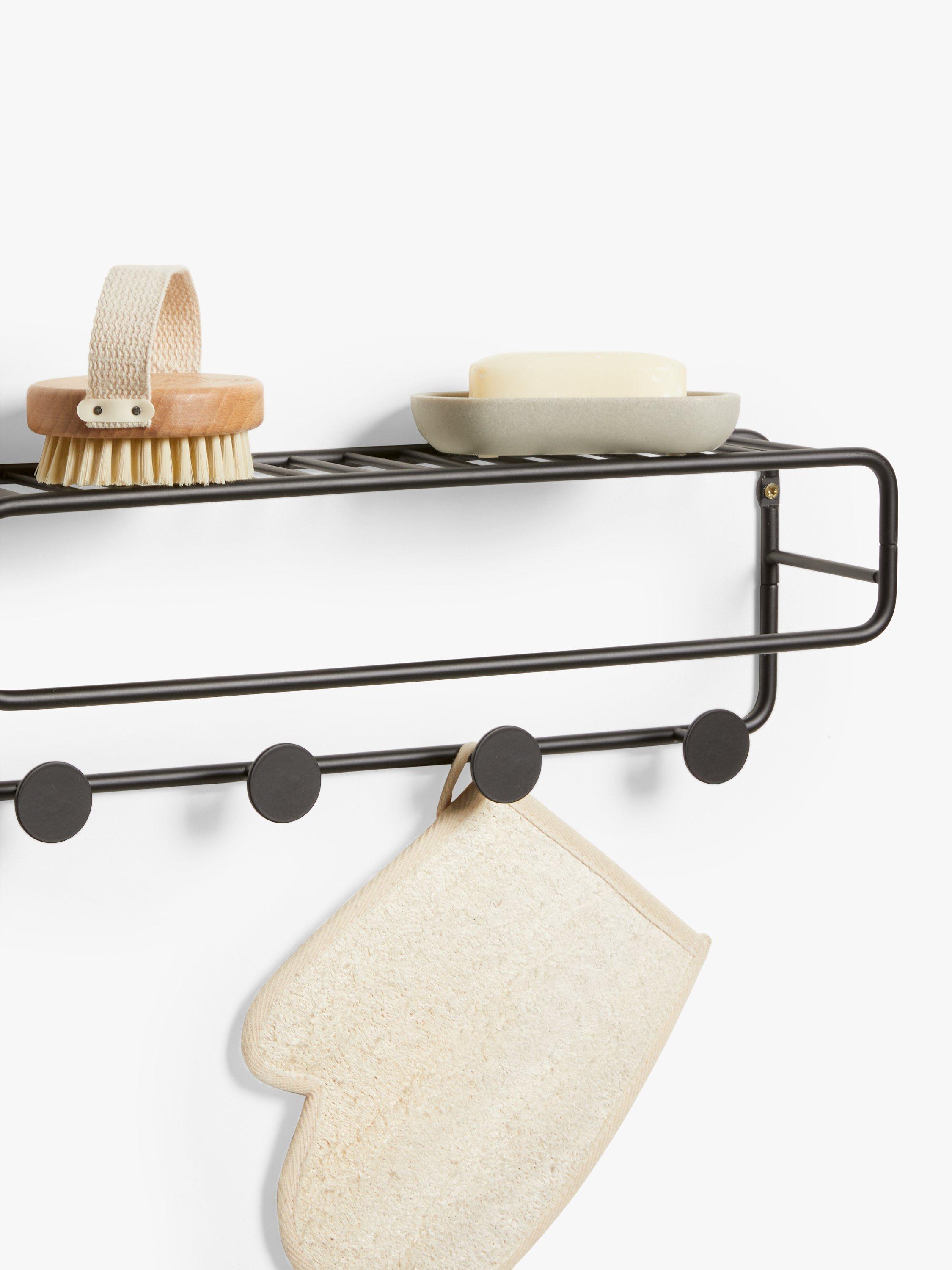This minimalist metal wall unit holds all your bathroom essentials. It combines a shelf with 5 hanging knobs and a rail to hold a towel.