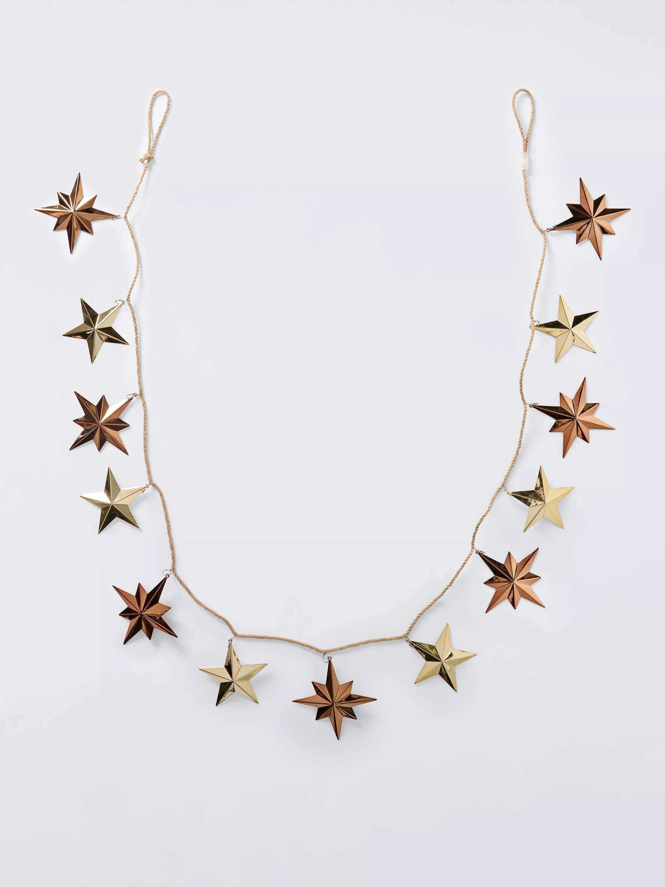 A twisted rope garland hung with shimmering metal stars in gold and rose gold.