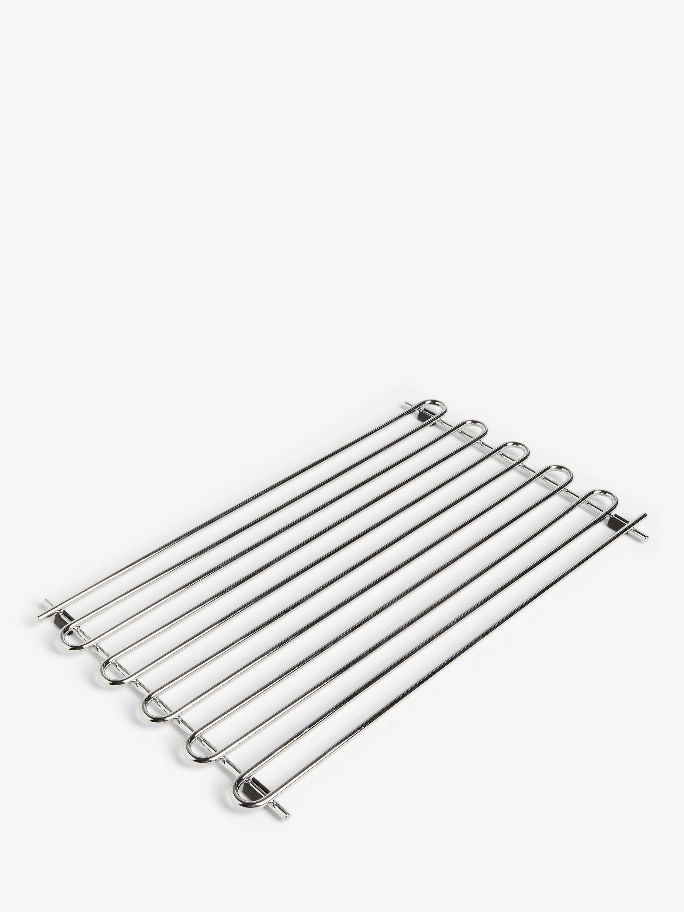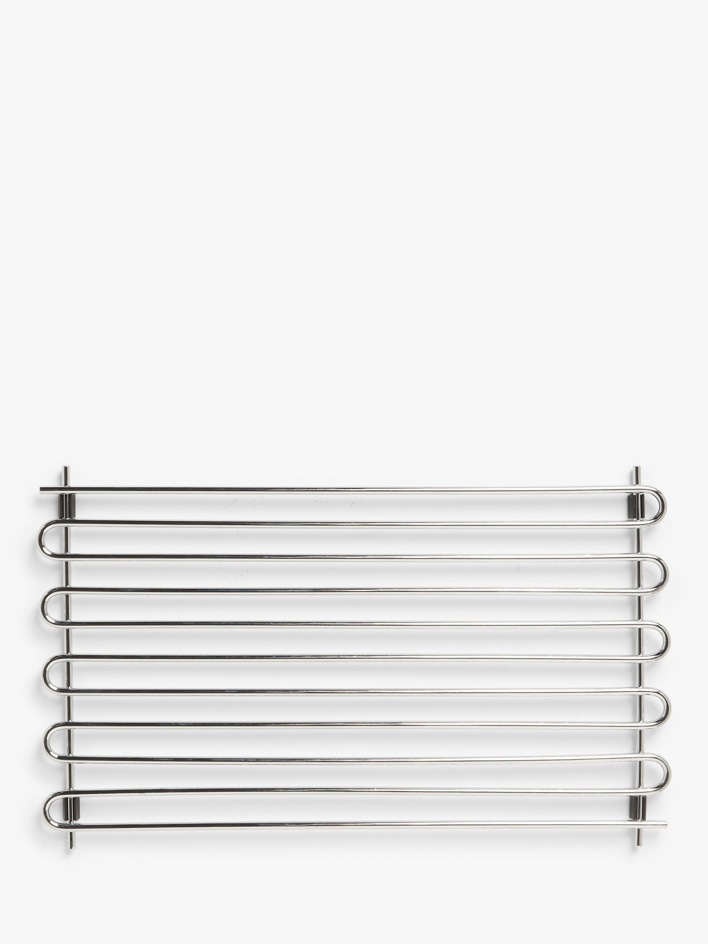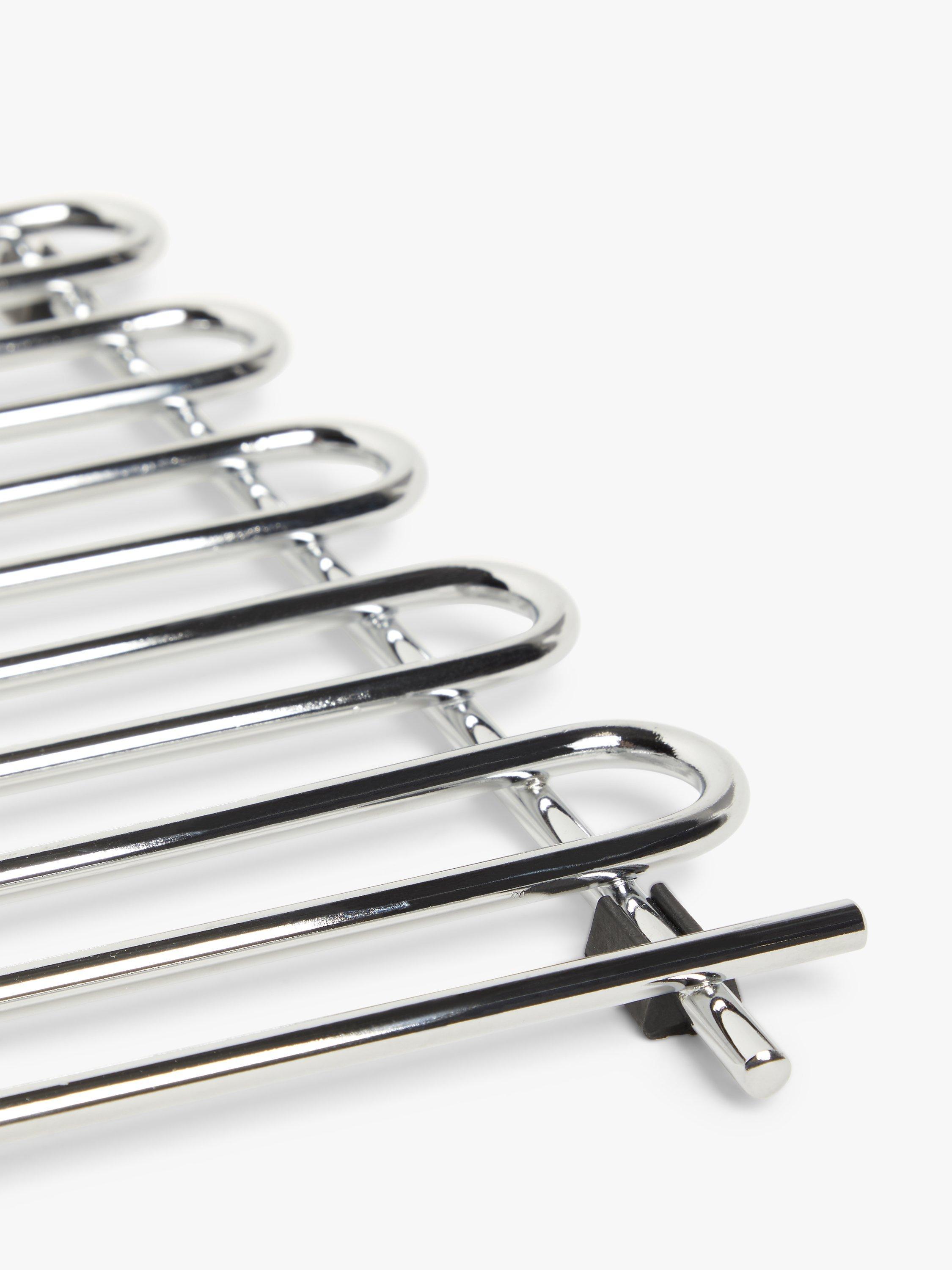 A sturdy trivet is essential for safe food service, both for protecting yourself from hot pots and pans as well as protecting countertops and tables. This robust design is made of iron with a chrome-plated finish and rubber feet that are kind to table surfaces.
