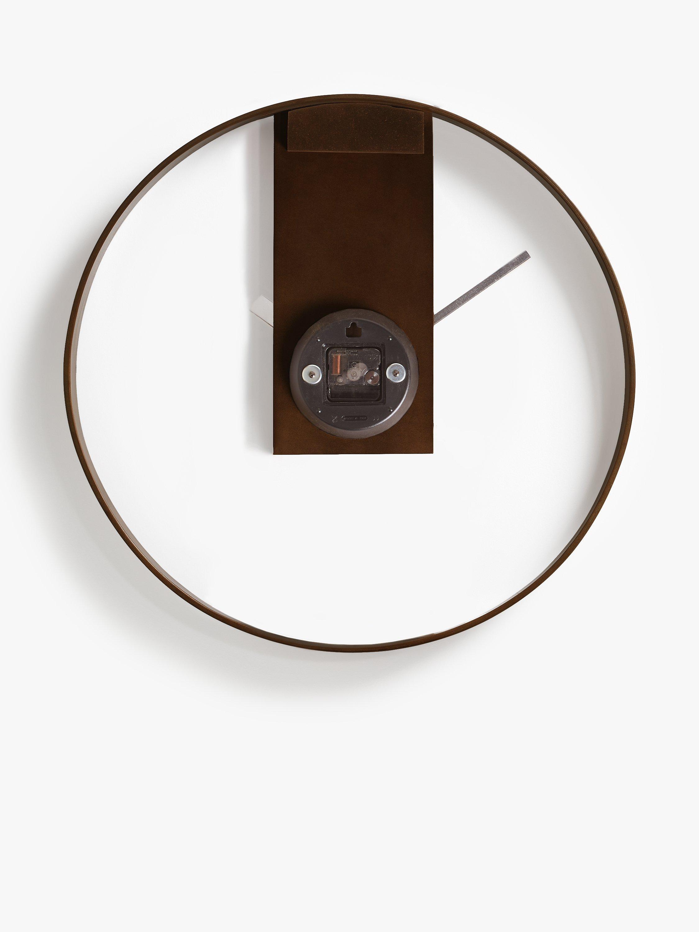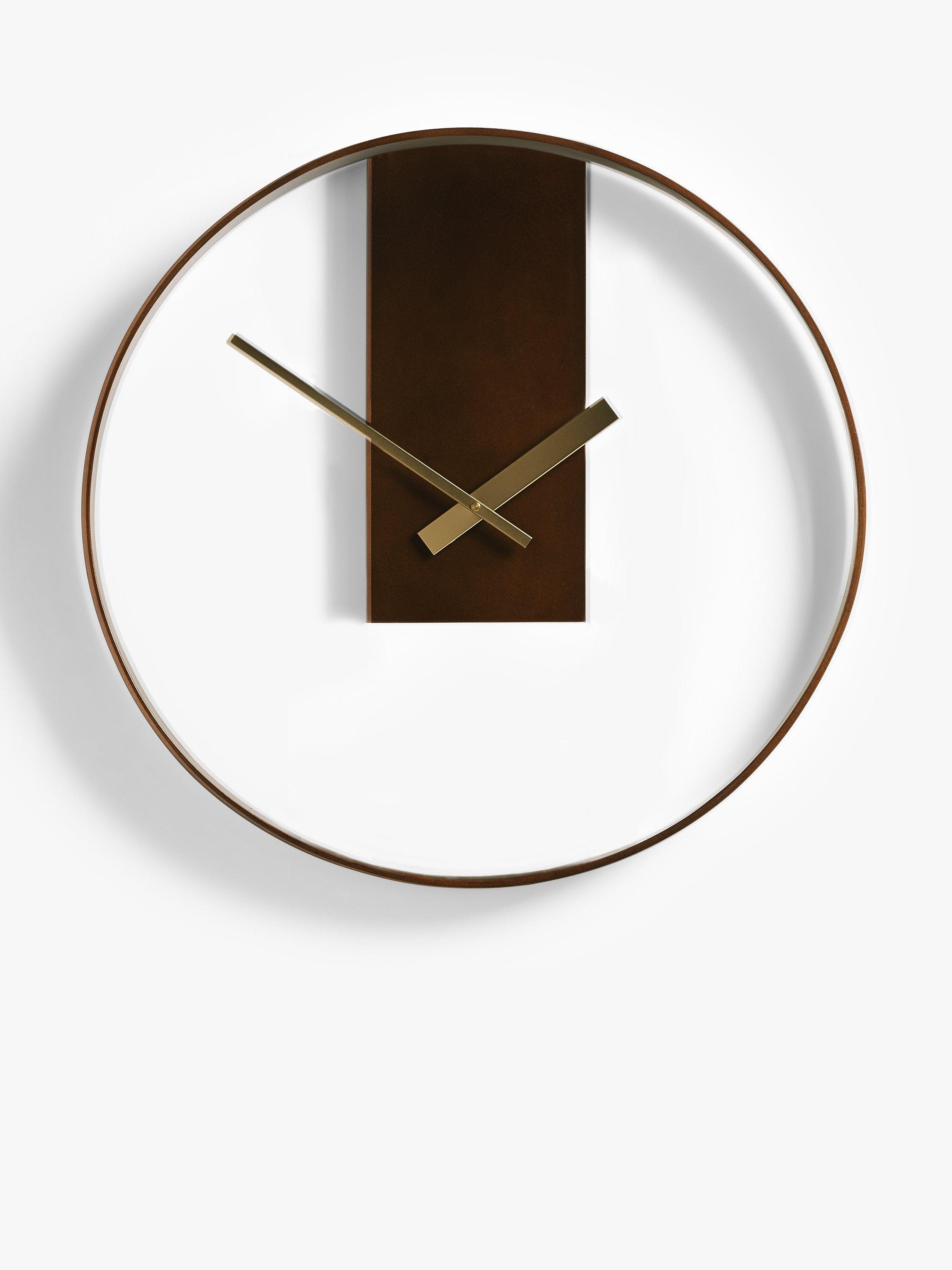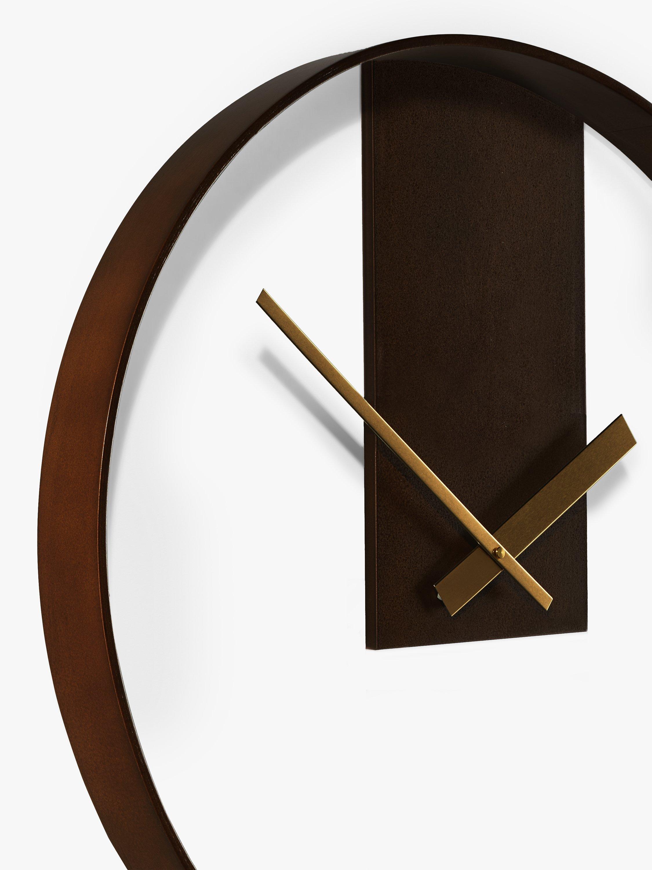 A Mid-century-inspired design, this round wall clock is updated with a modern minimalist look without hour markers. The metal clock hands in a brass finish contrast beautifully with the dark walnut-stained wooden frame.