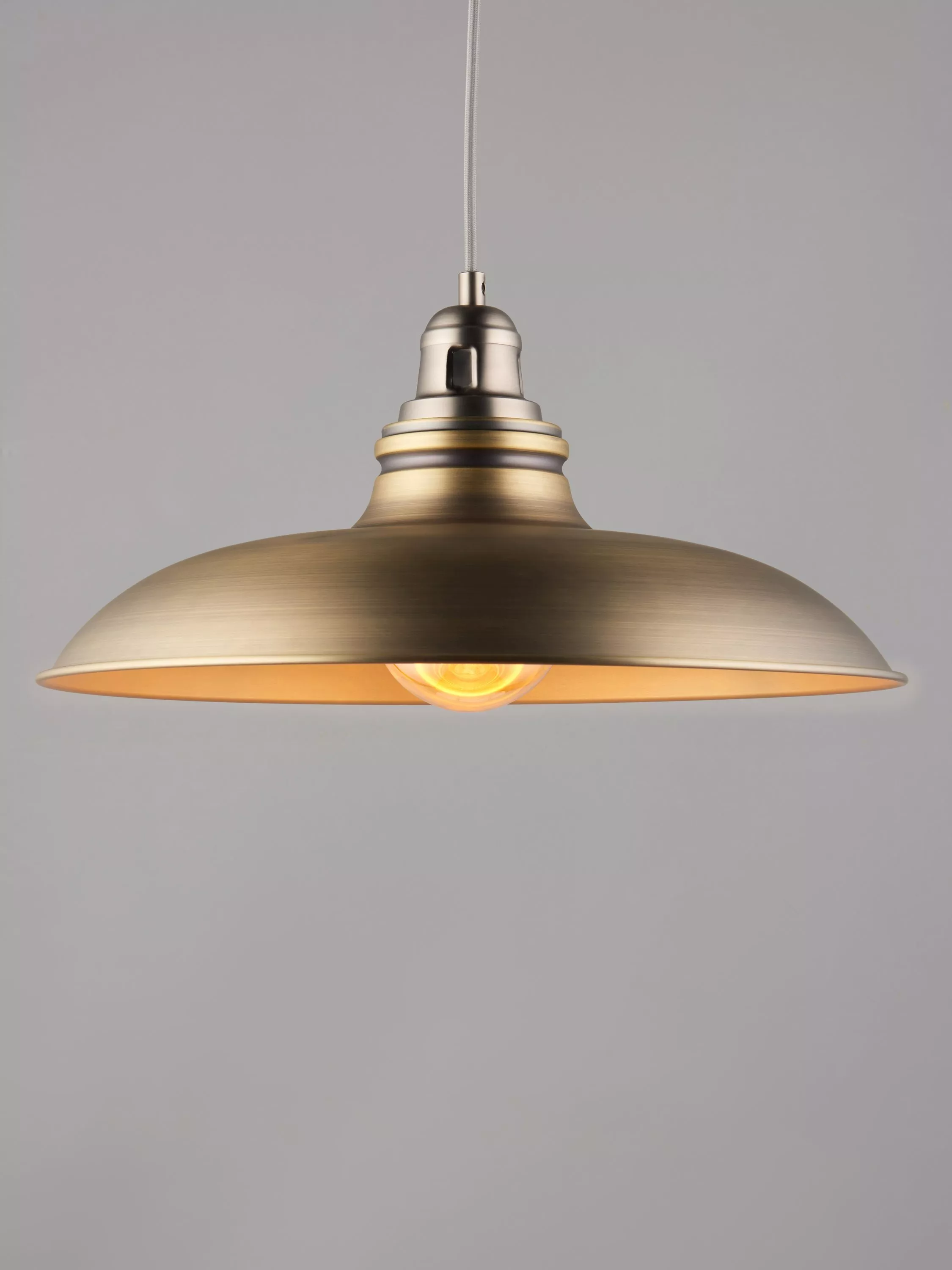 Ideally installed over dining tables or kitchen islands, this industrial-inspired pendant combines antique brass and pewter finishes. Its soft shape and wide shade will enhance a warm and reflective glow of light, especially as the inside is painted in brushed gold. It's suspended from a height adjustable cable.