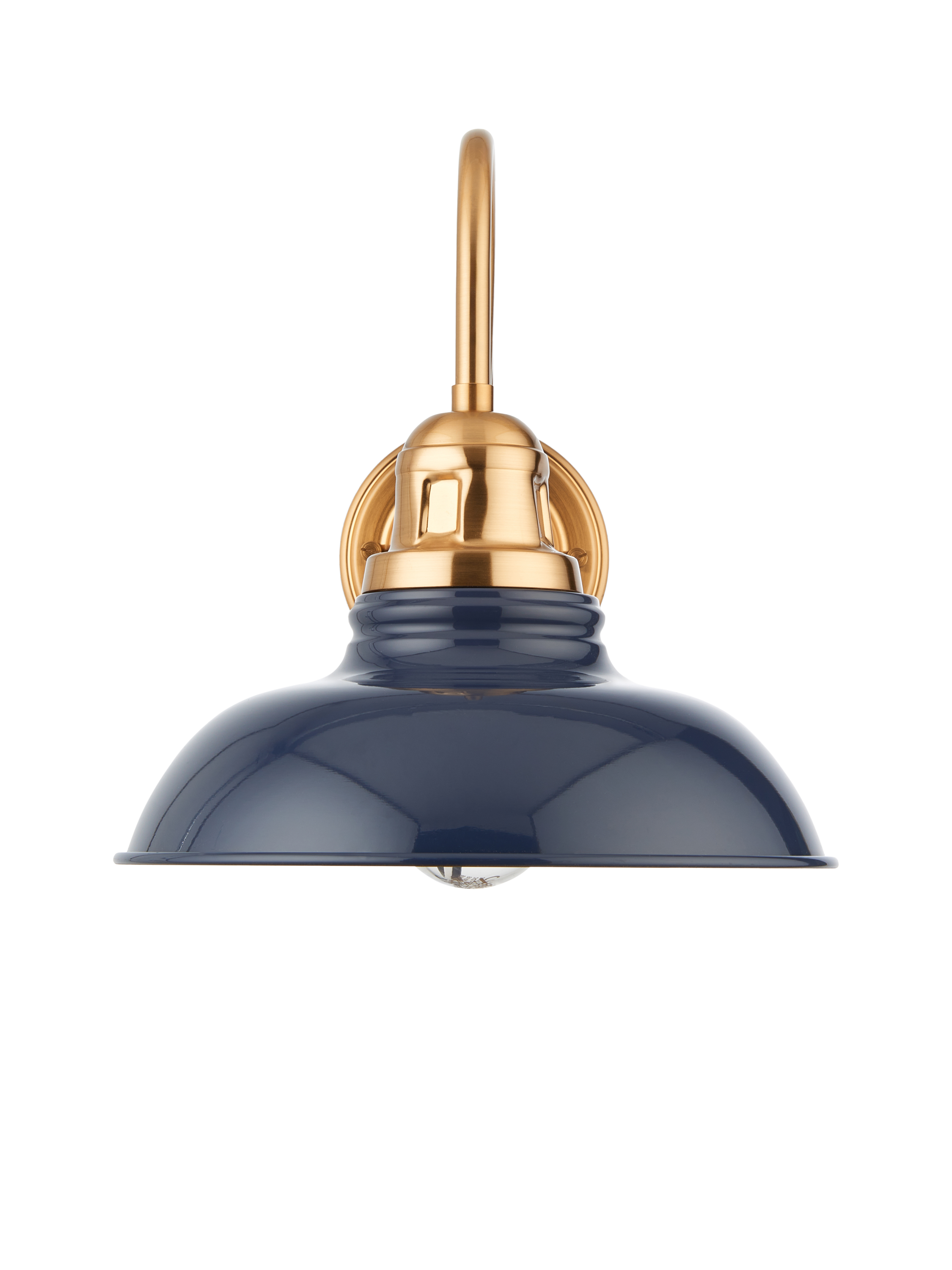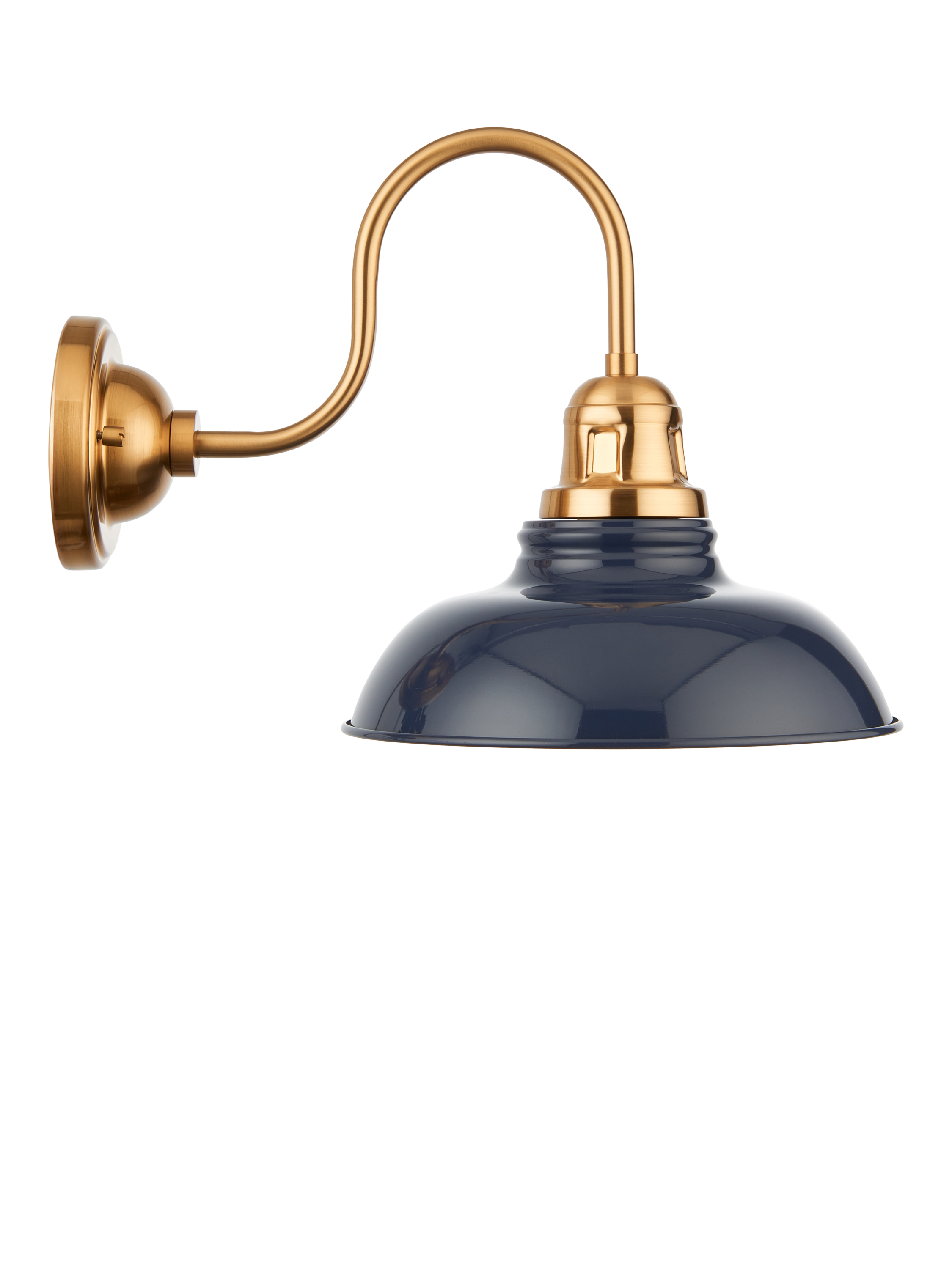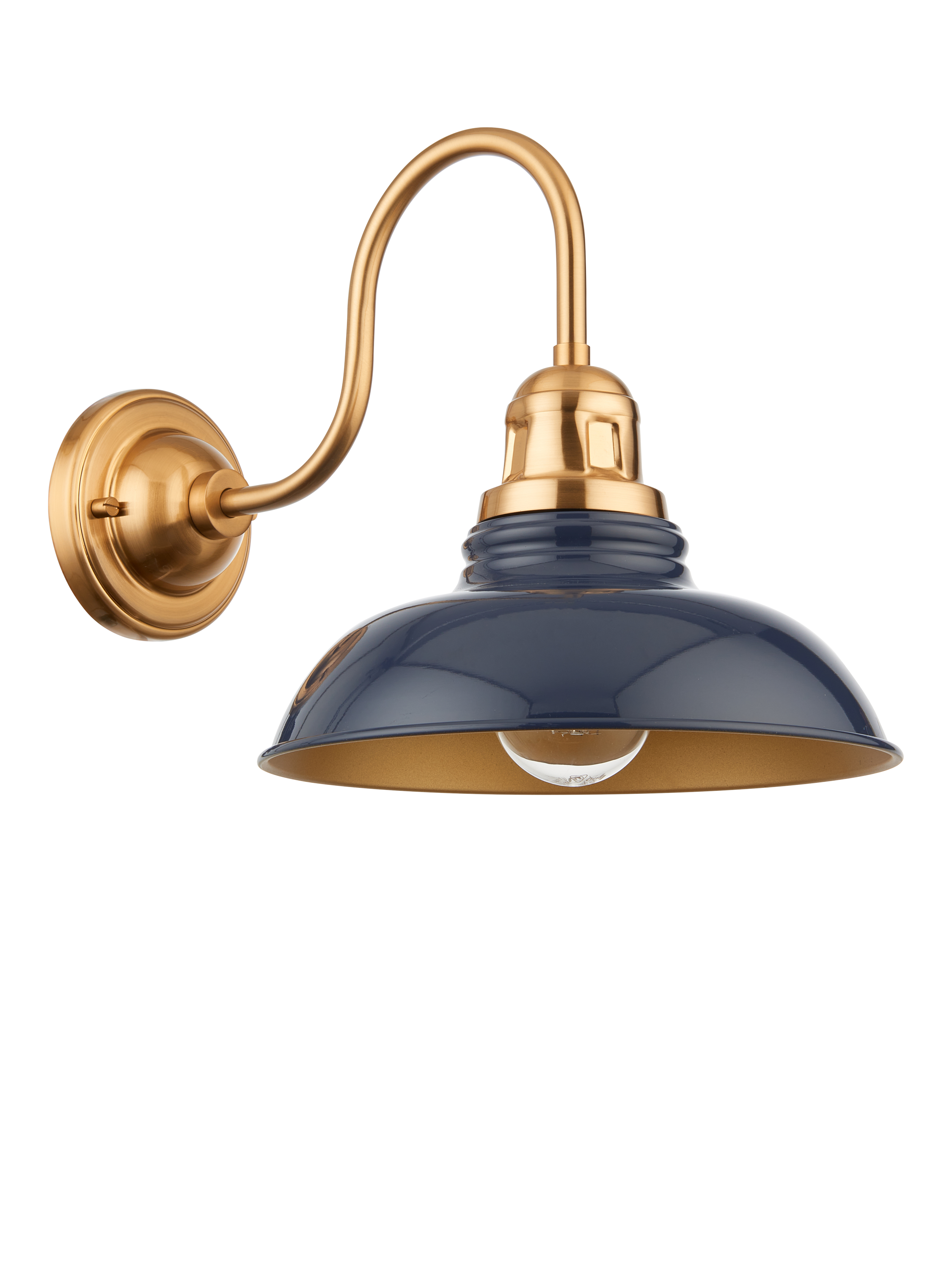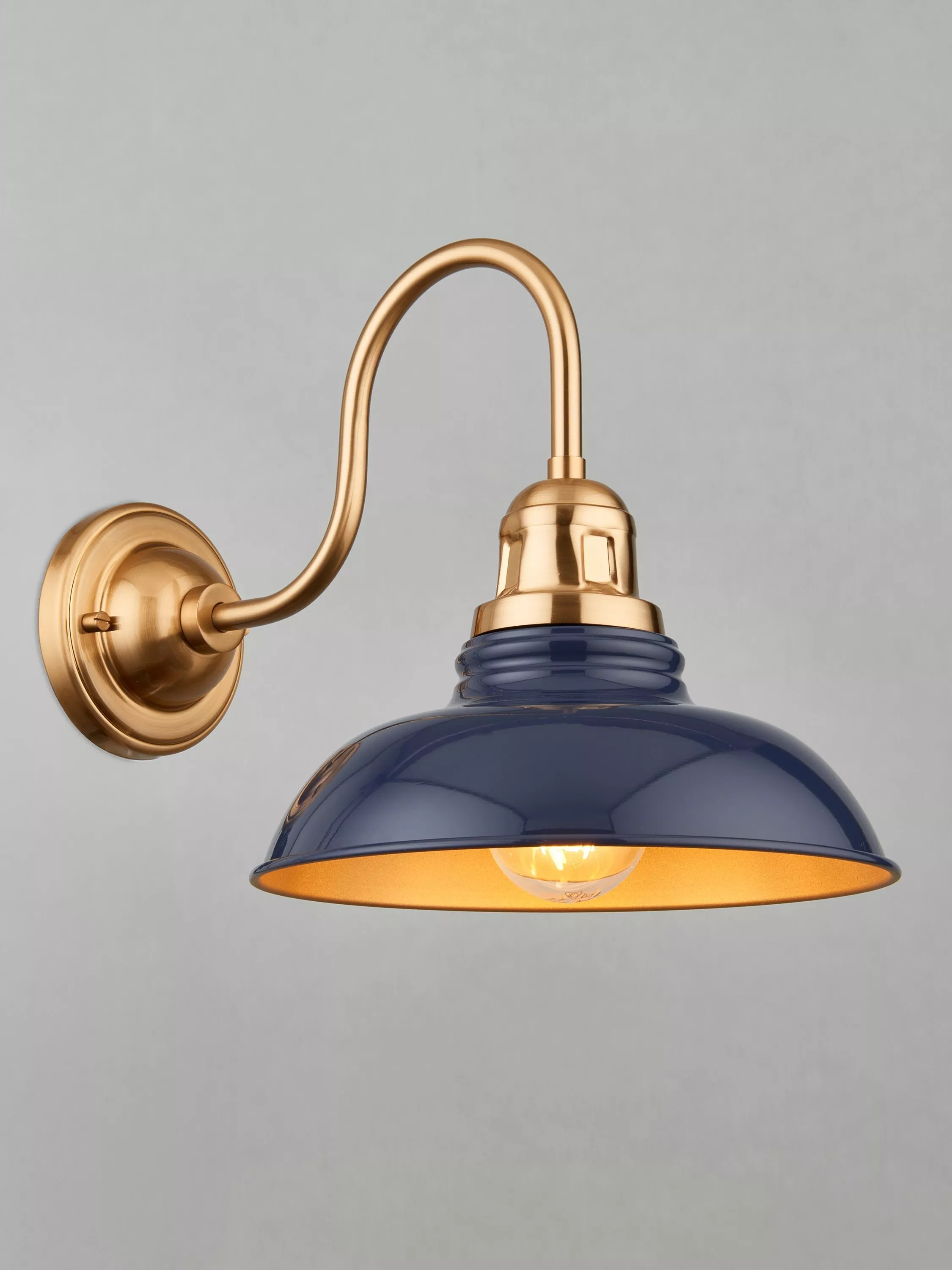 This industrial-style wall light is crafted from steel, enhancing its rugged charm. Its elegant swan neck design gracefully suspends a wide and softly shaped, heritage-inspired shade in a contrasting tone. The effect creates a warm, inviting glow for your room.