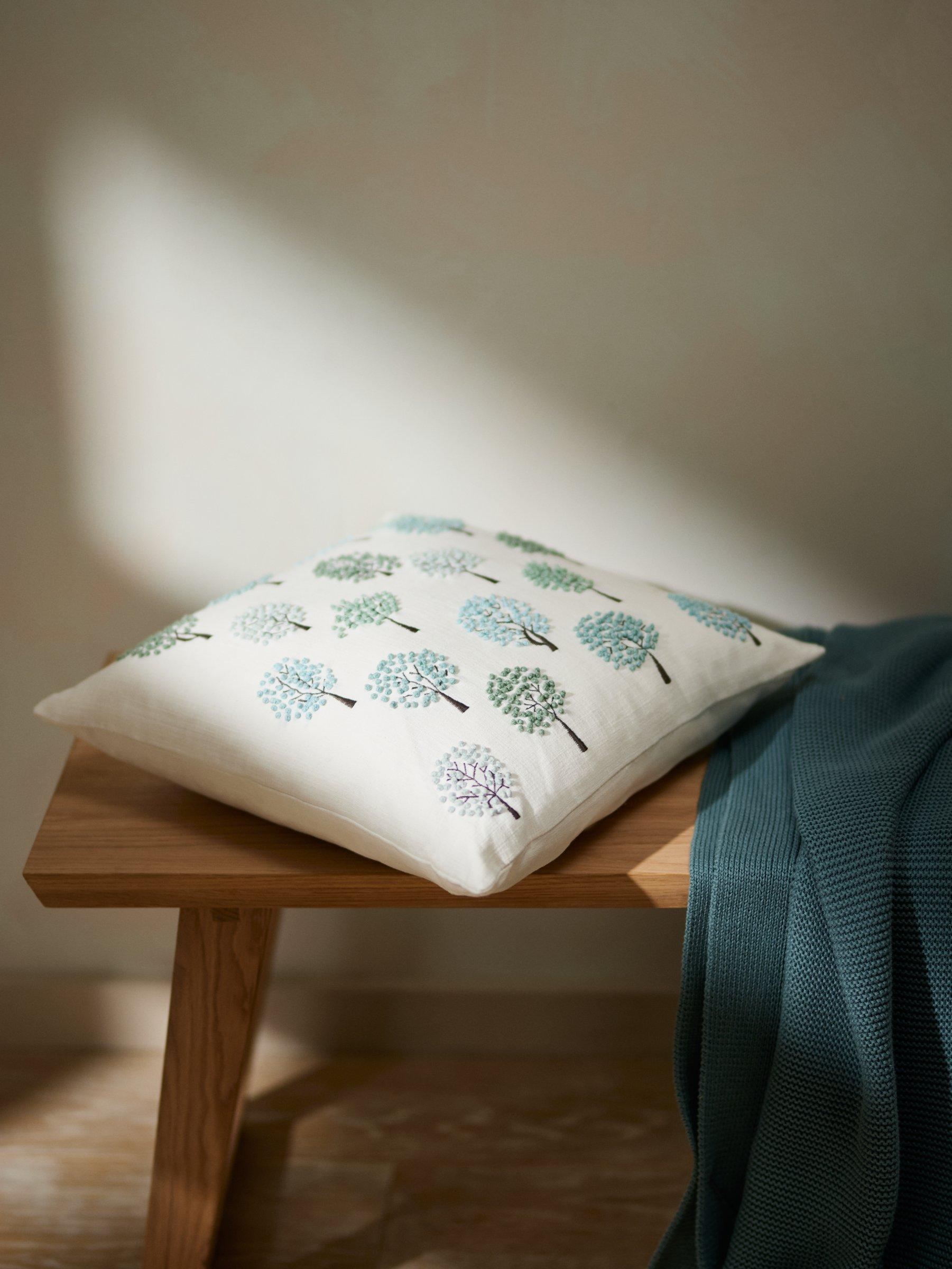 A beautiful cushion, scattered with embroidered trees which give a lovely 3D effect against the cotton background.