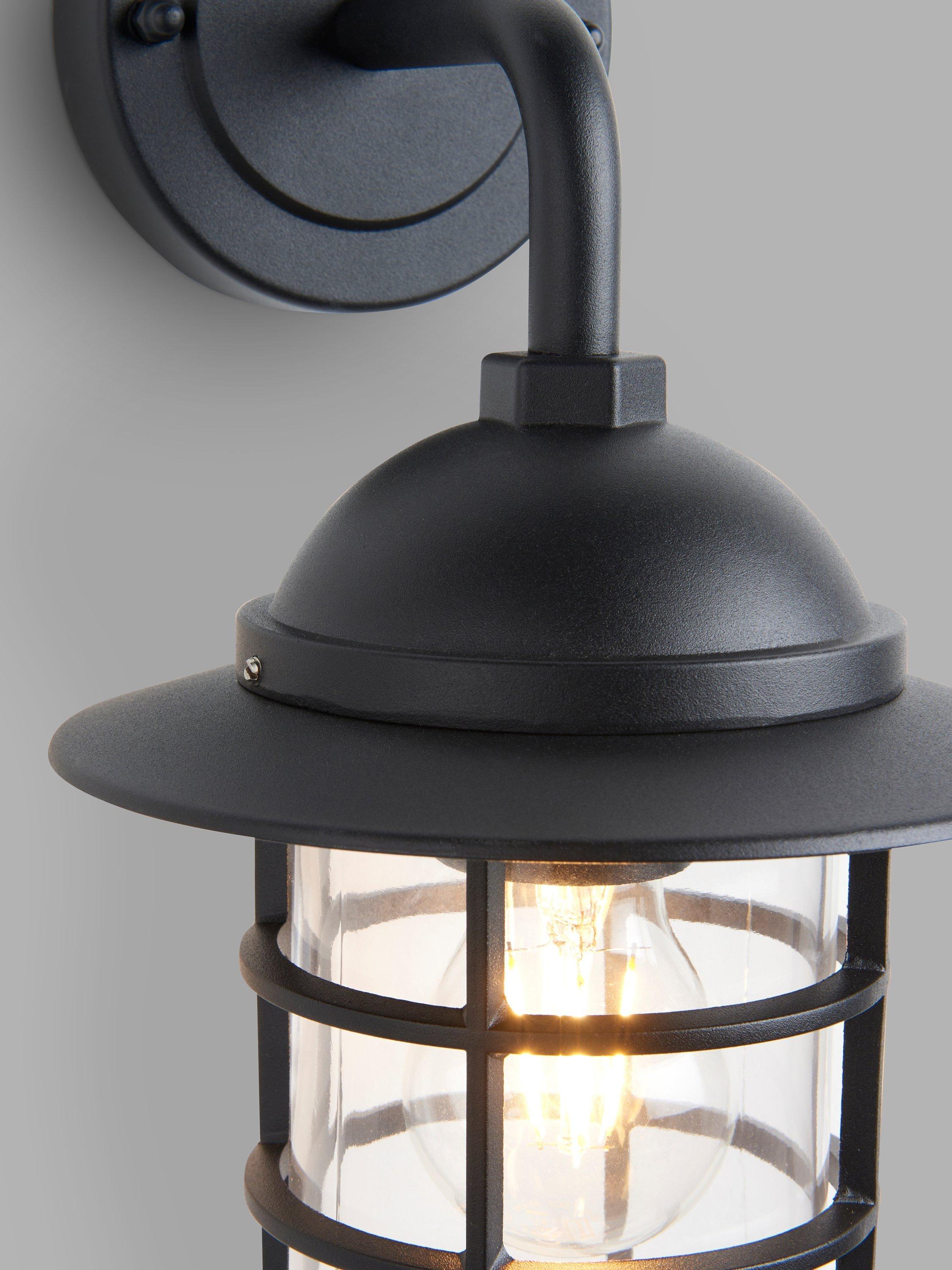 This wall light offers an efficient way to light the outside of your home, thanks to its classic cage and exposed bulb design. IP44 rated and safe to install outside, it's made from hard-wearing metal in a textured, matt finish and has a clear glass shade. Try installing it on either side of your front door or in a line down the garden for a smart lighting look outside. One LED bulb is required.