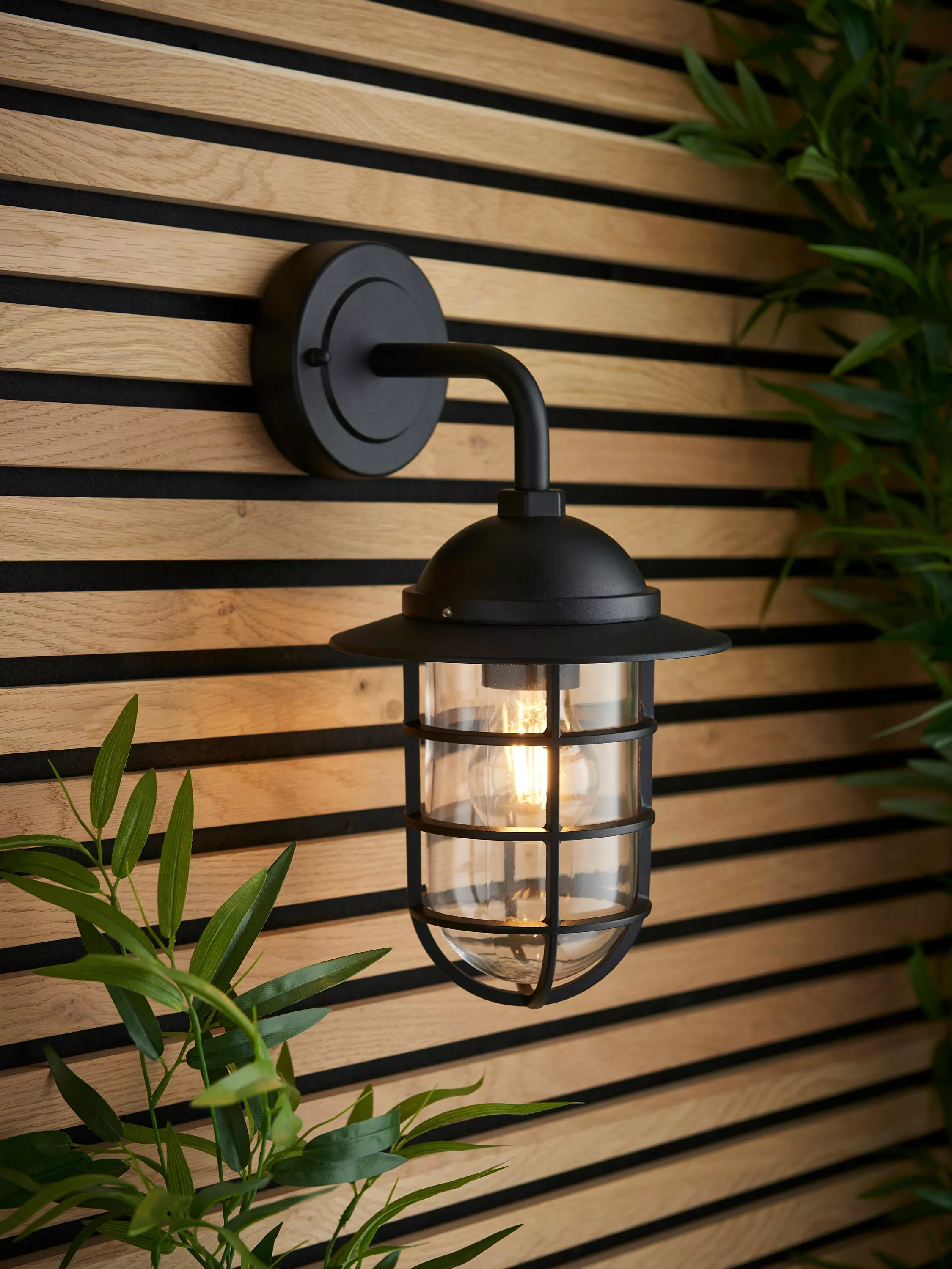 This wall light offers an efficient way to light the outside of your home, thanks to its classic cage and exposed bulb design. IP44 rated and safe to install outside, it's made from hard-wearing metal in a textured, matt finish and has a clear glass shade. Try installing it on either side of your front door or in a line down the garden for a smart lighting look outside. One LED bulb is required.
