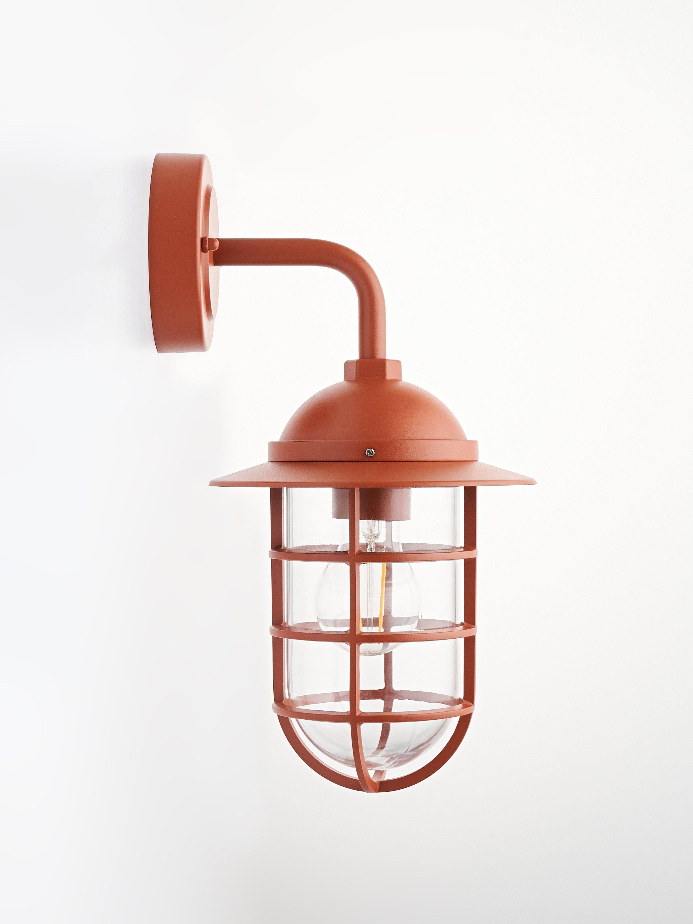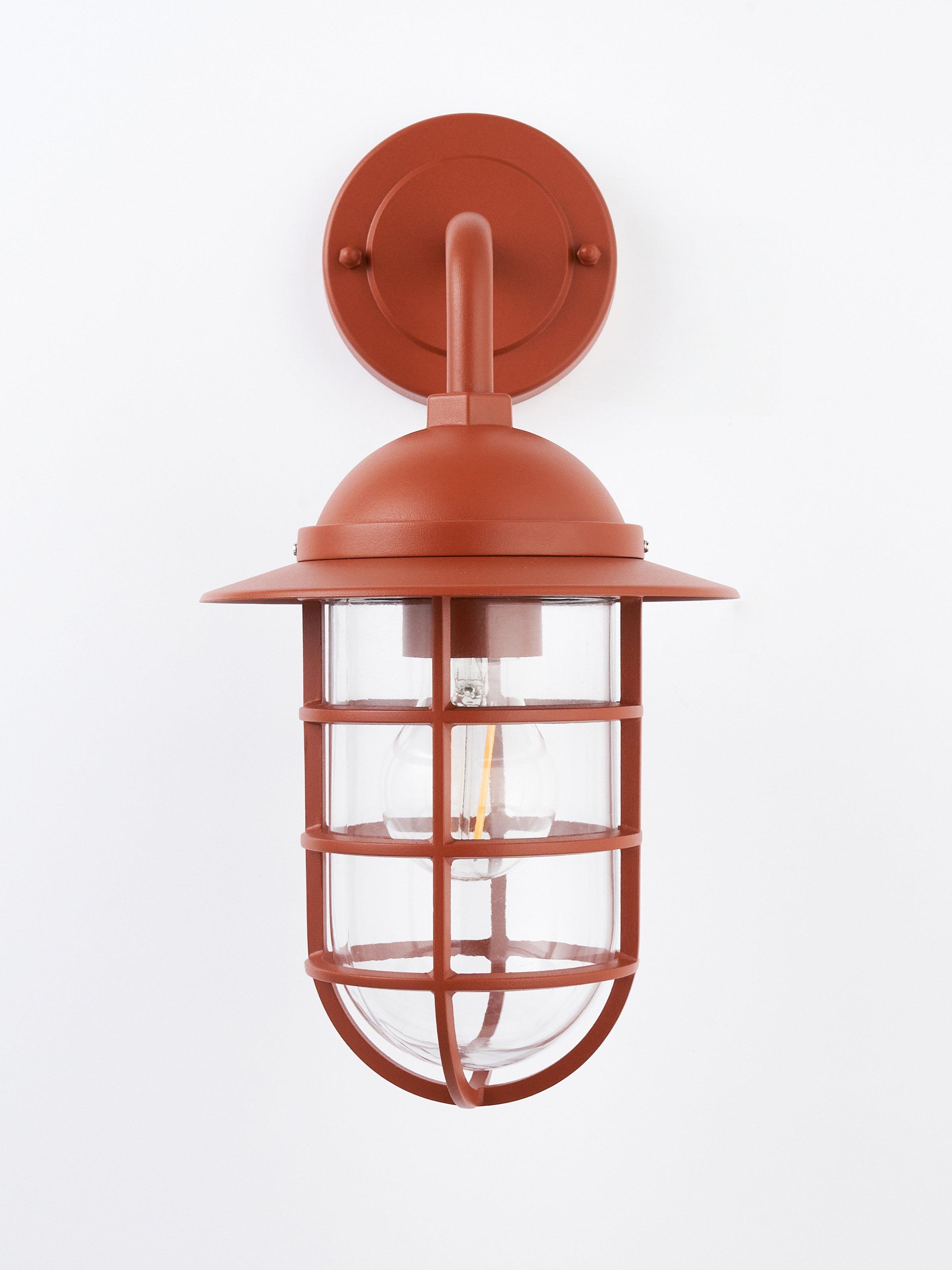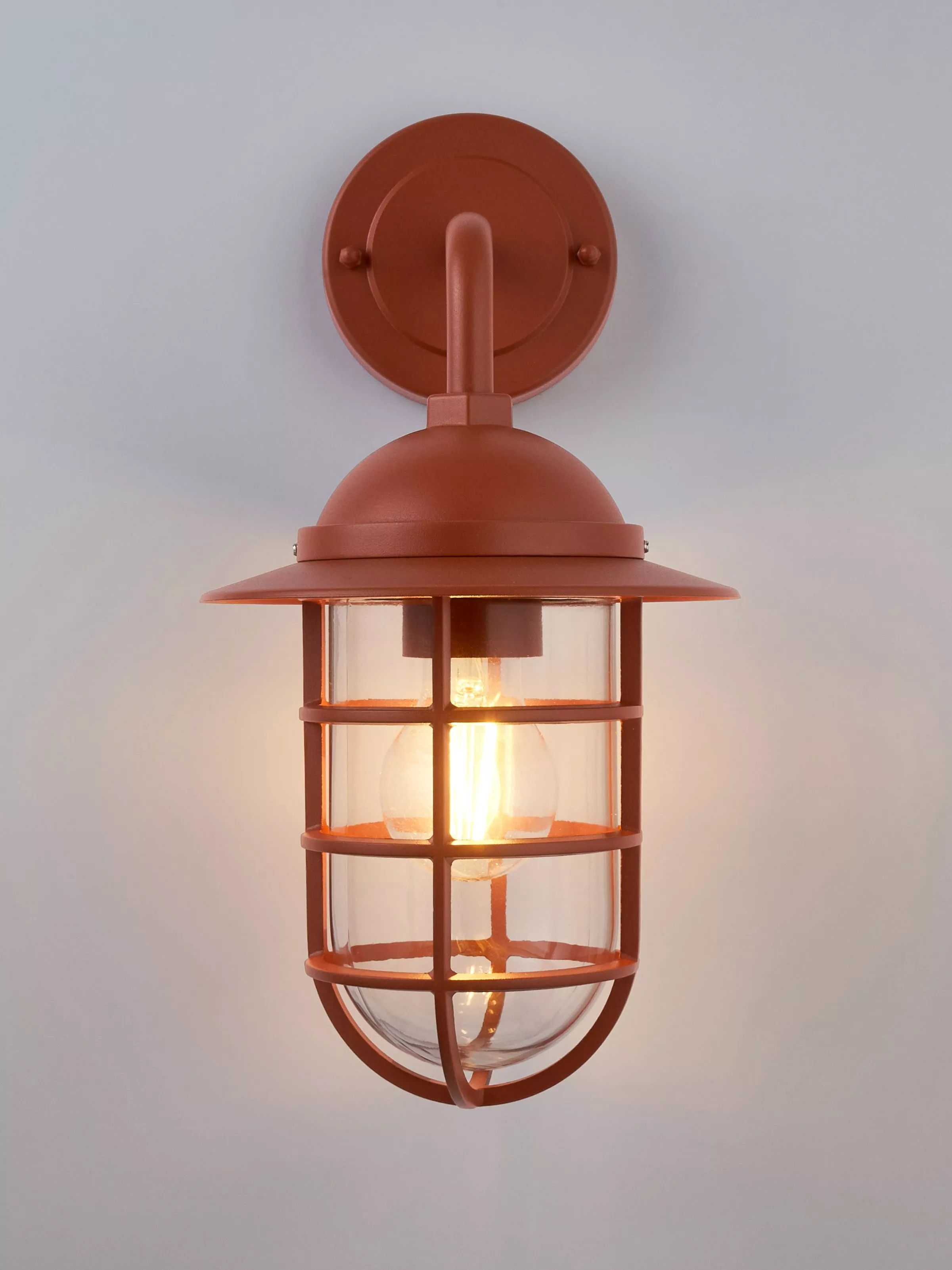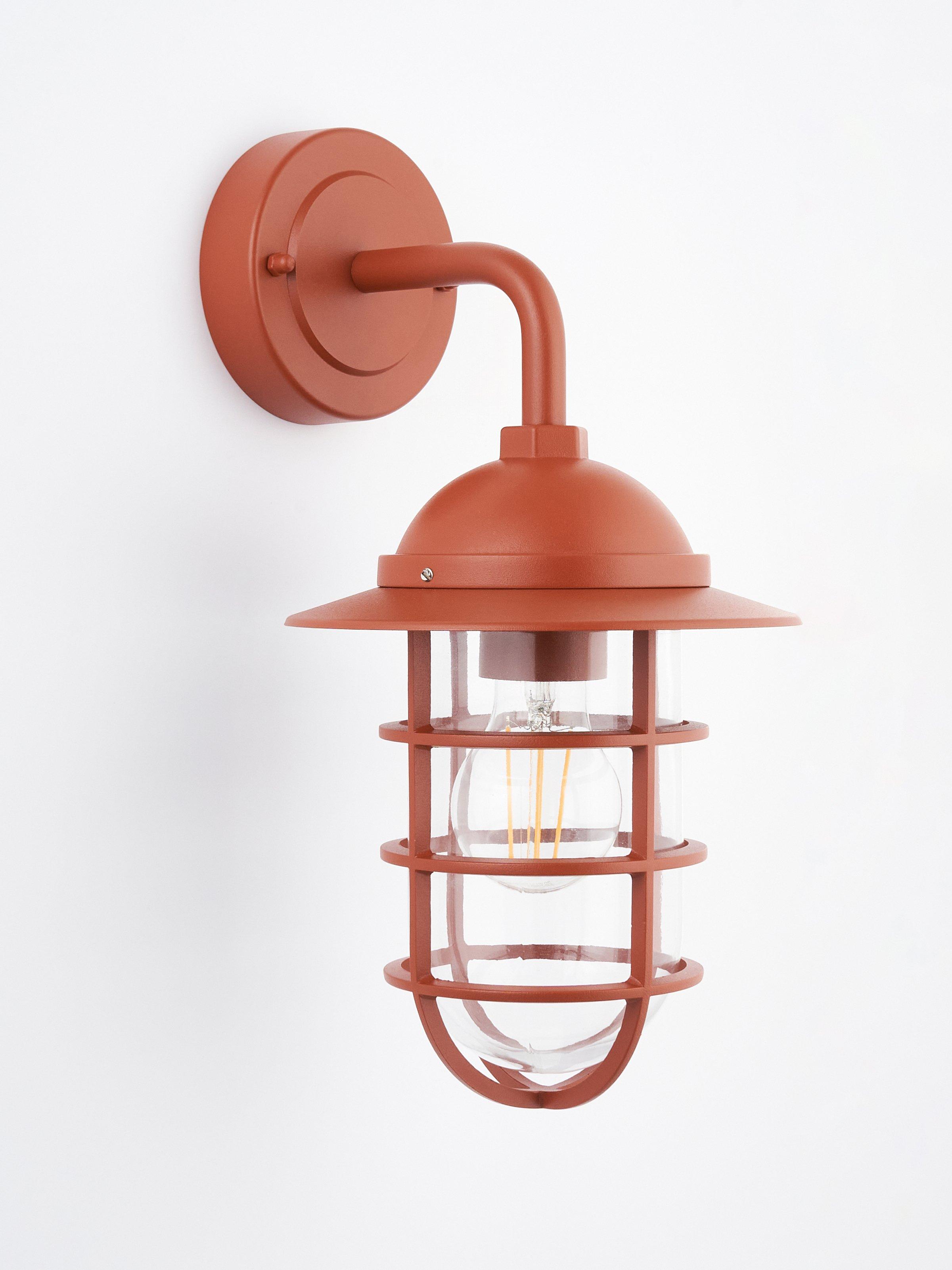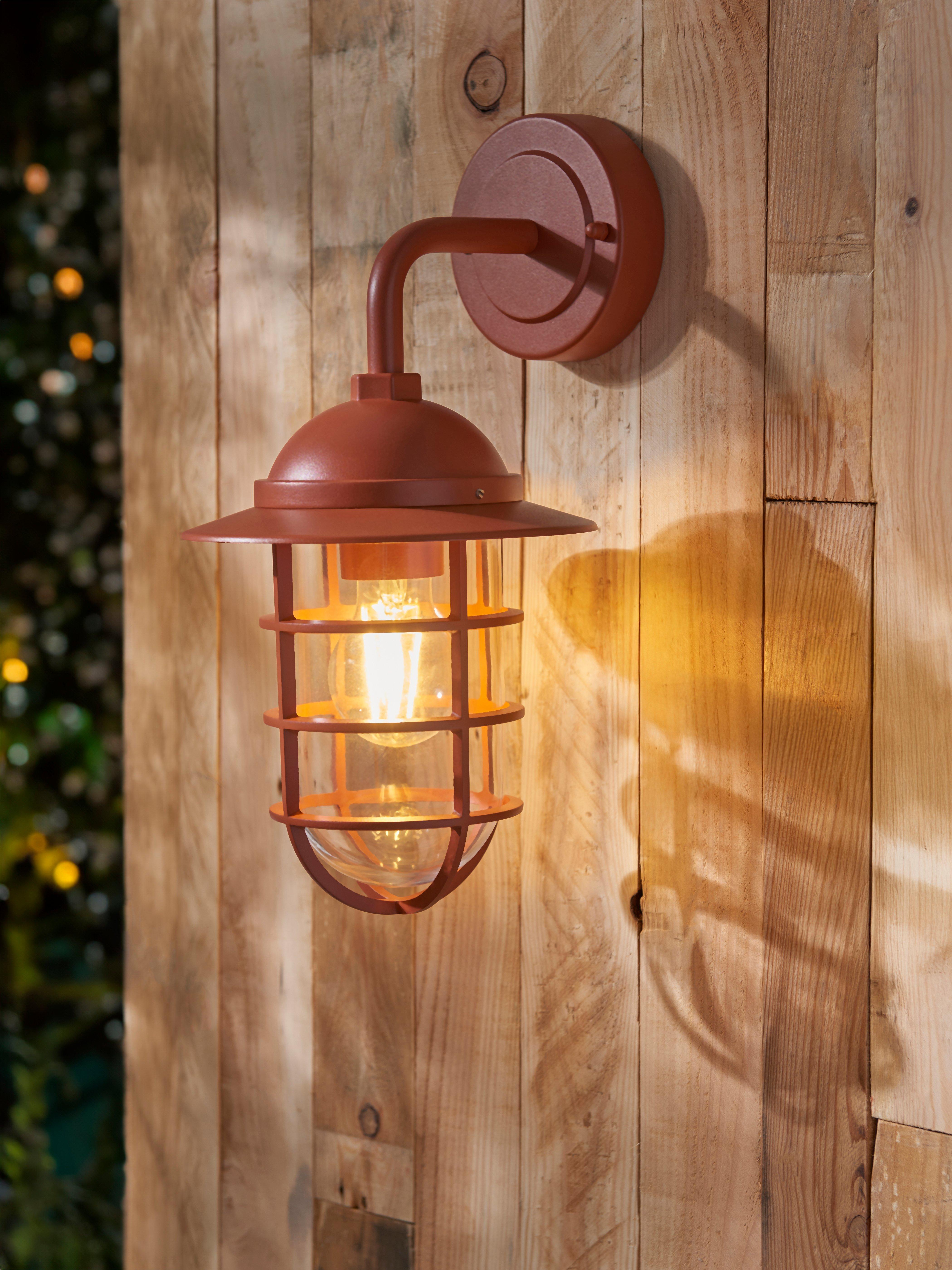An efficient way to light the outside of your home, this wall light has a classic cage and exposed bulb design. IP44-rated and safe to install outside, it's made from hardwearing metal in a robust, textured finish and has a clear glass shade.