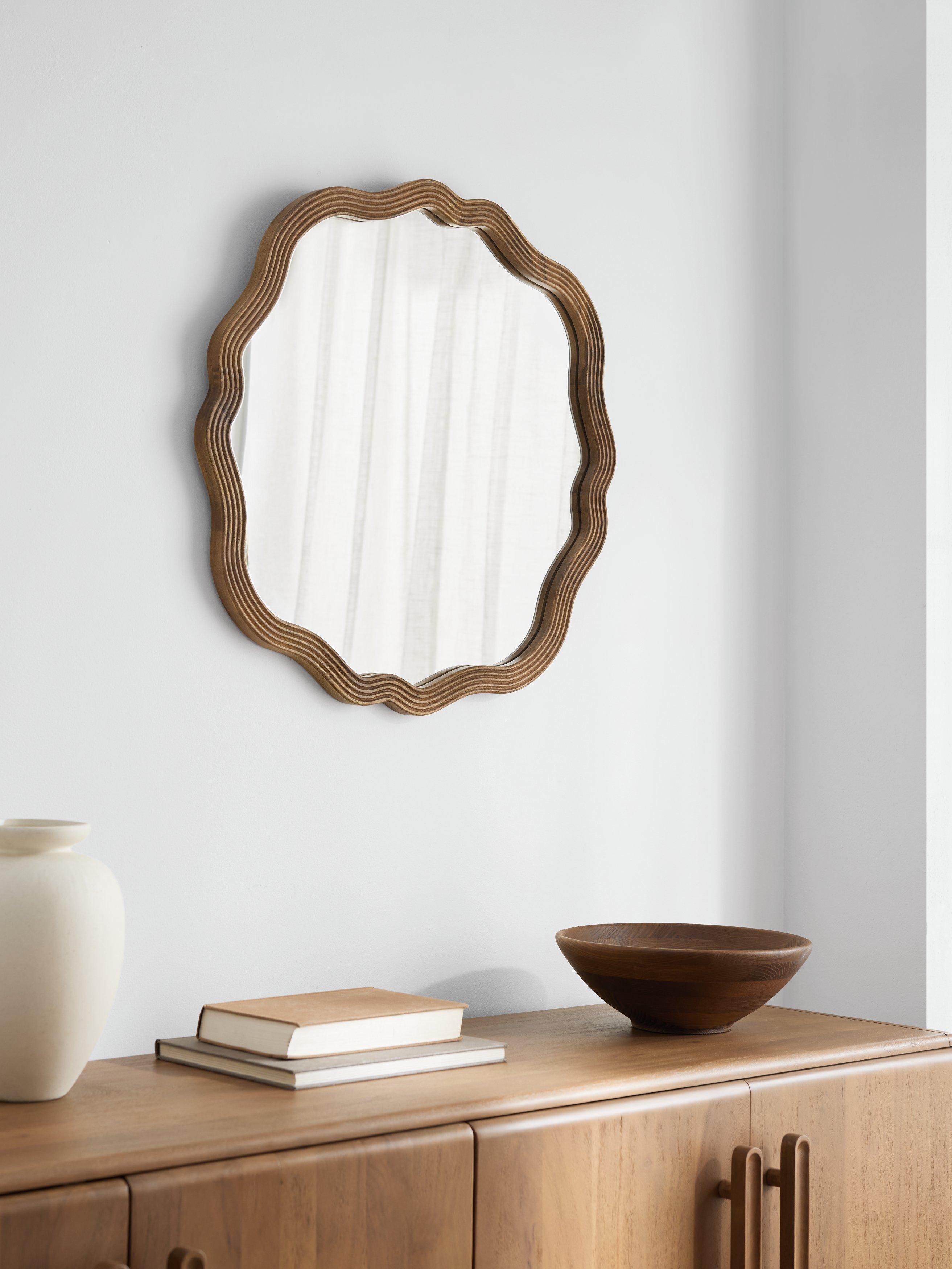By blending artisanal craftsmanship with a playful, modern shape, this mirror offers an easy way to introduce texture and depth to your decor. A refined accent piece that feels as grounded as it does decorative.