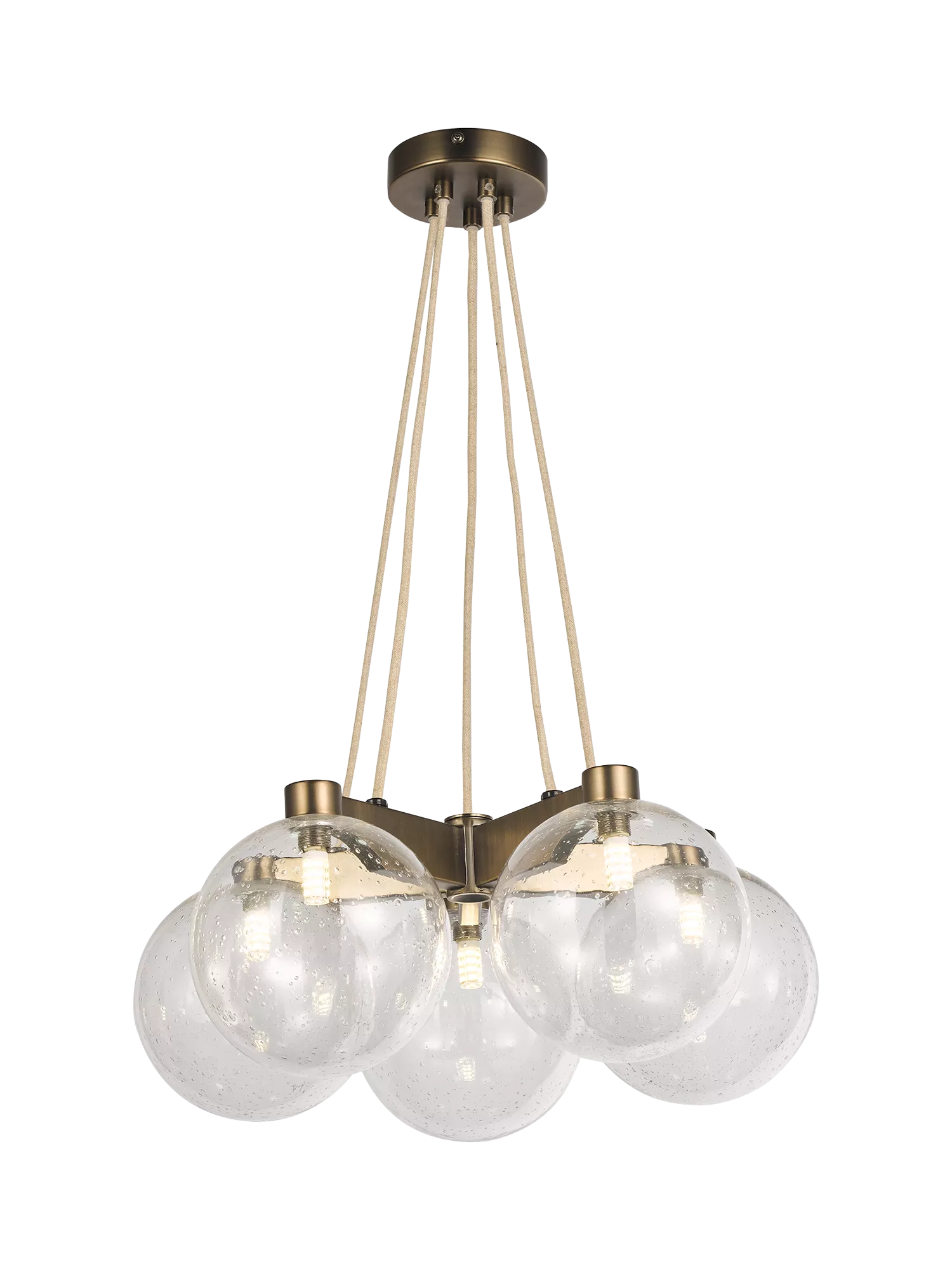 The Modern Lux Bubble 5 pendant ceiling light offers a soft industrial design with wonderful bubble, hand blown glass shades. The architectural metal work is satin finished, with contrasting linen fabric cables that can be height adjusted to suit your space.