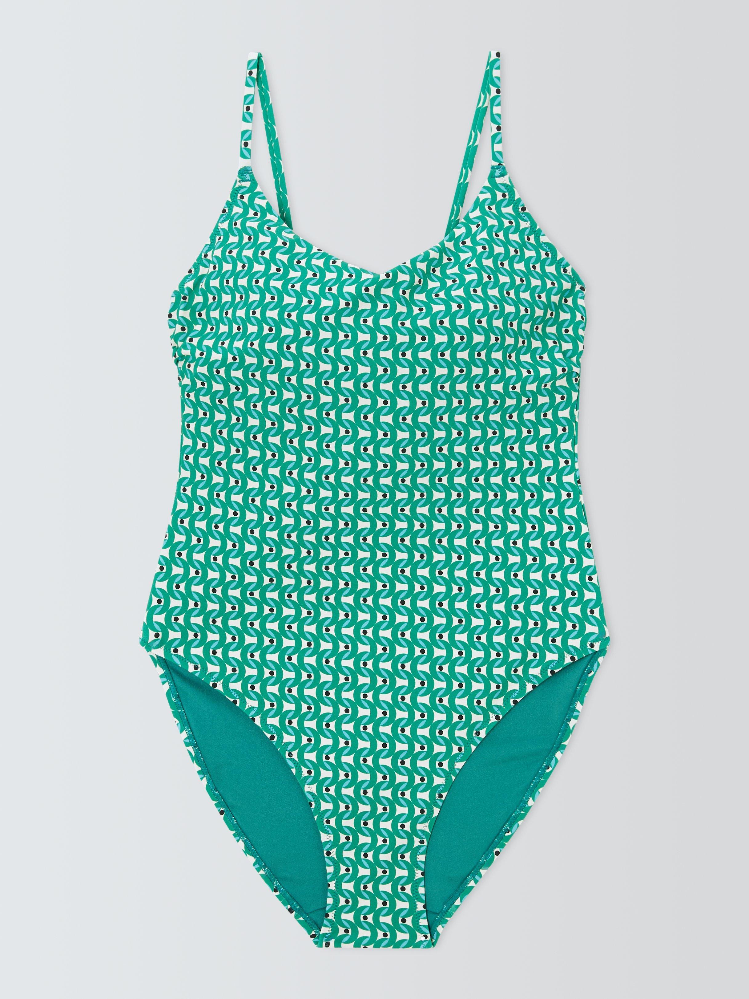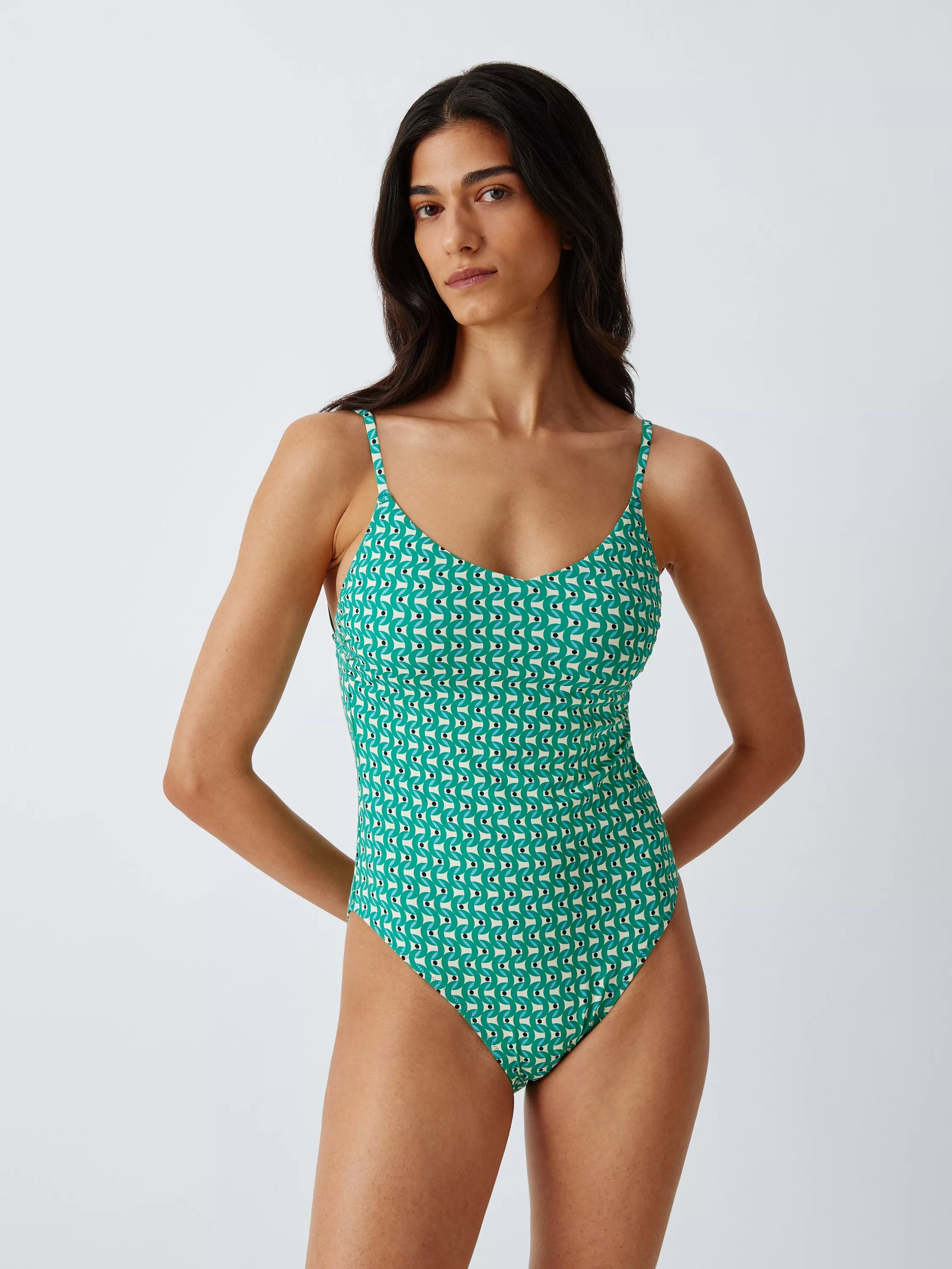 Featuring a bold geometric pattern, this fully lined swimsuit has a classic V-neckline and slender adjustable straps for a customisable fit and elegant support.