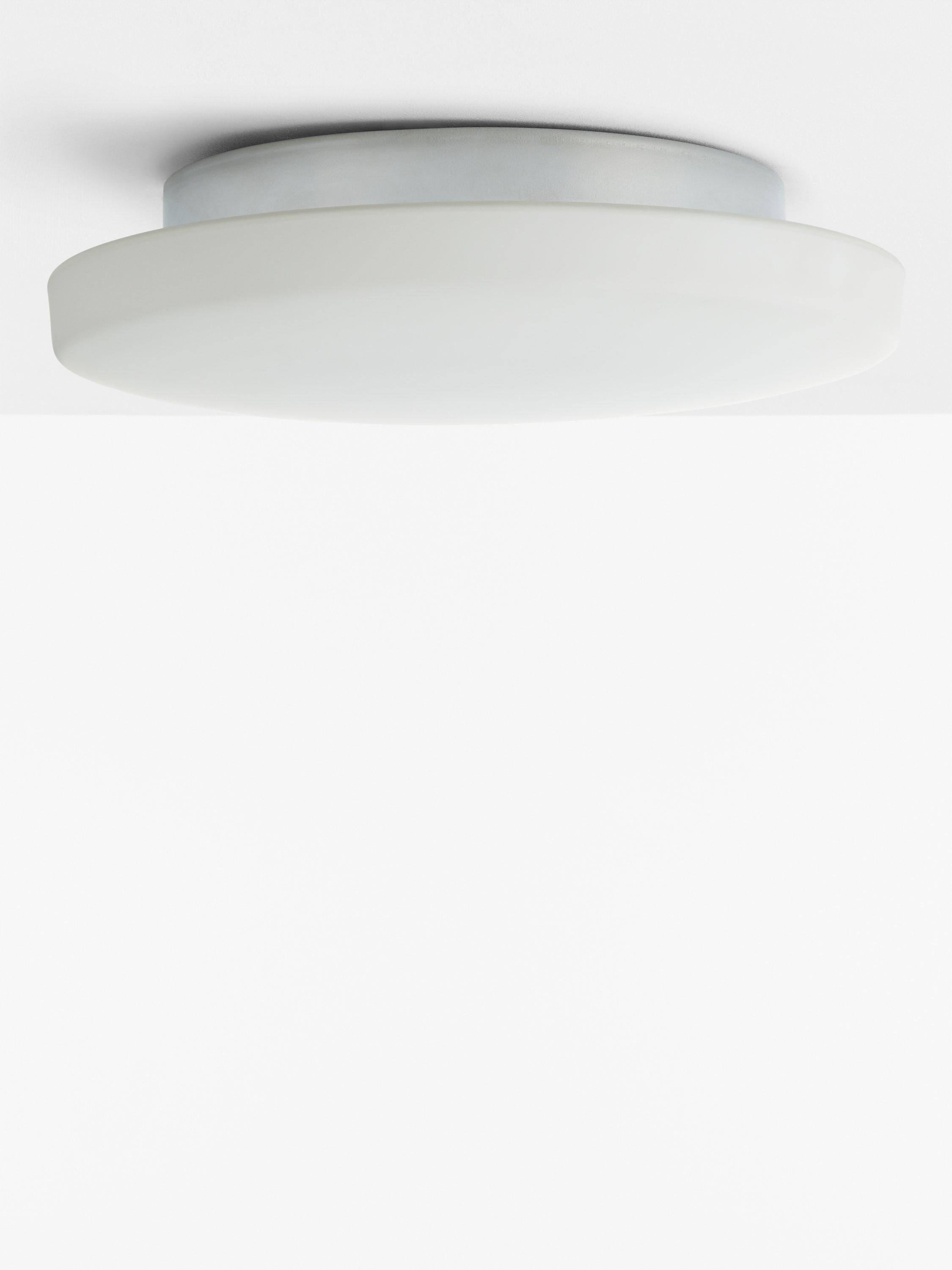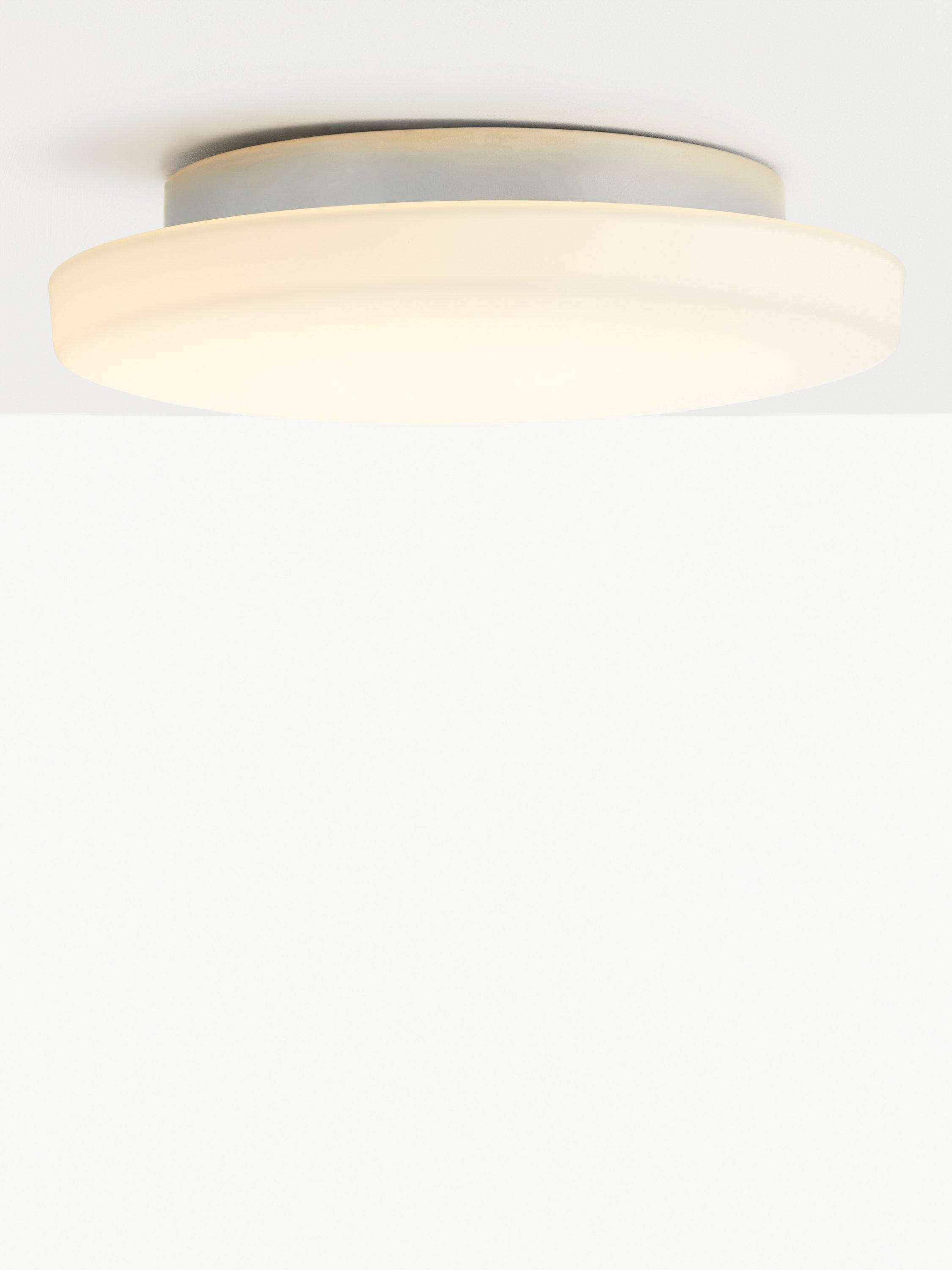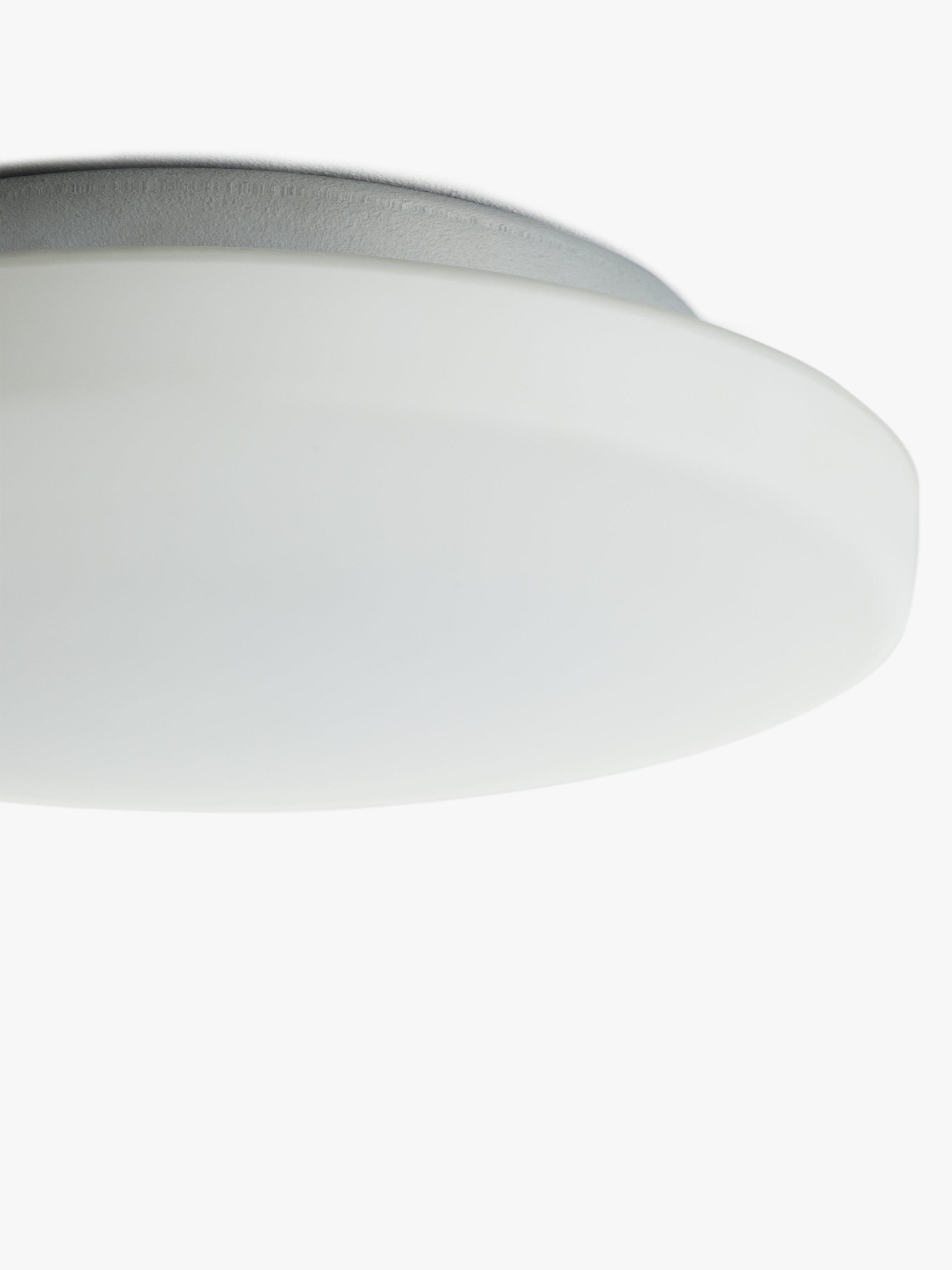 The Moonbeam ceiling light is designed with an integrated LED module that provides a warm and even distribution of light. Its opal glass shade has a diffusing effect and creates a floating aesthetic as the flush ceiling plate is a smaller size. IP44 rated, it is protected against splashing water and suitable for bathroom environments.