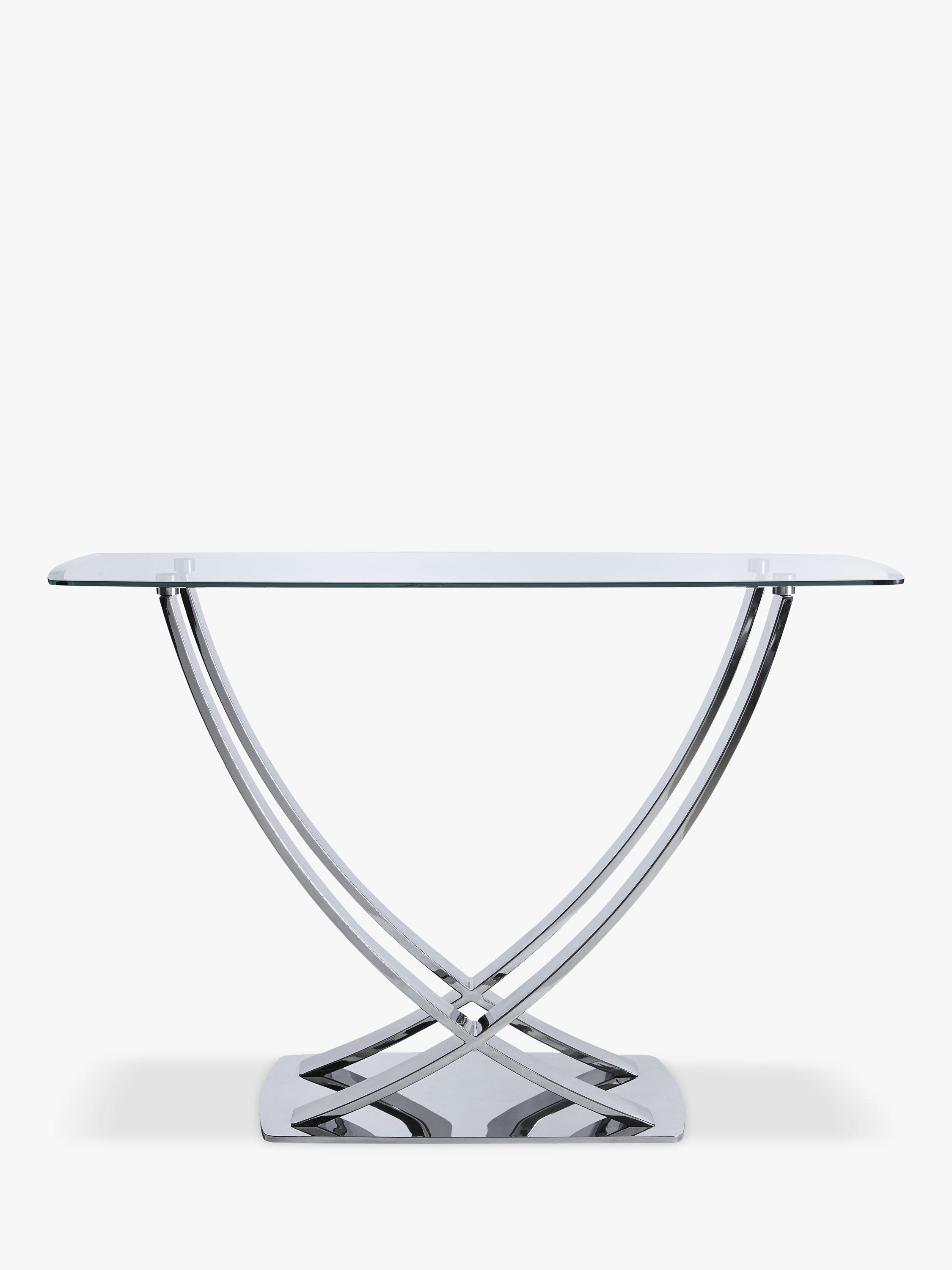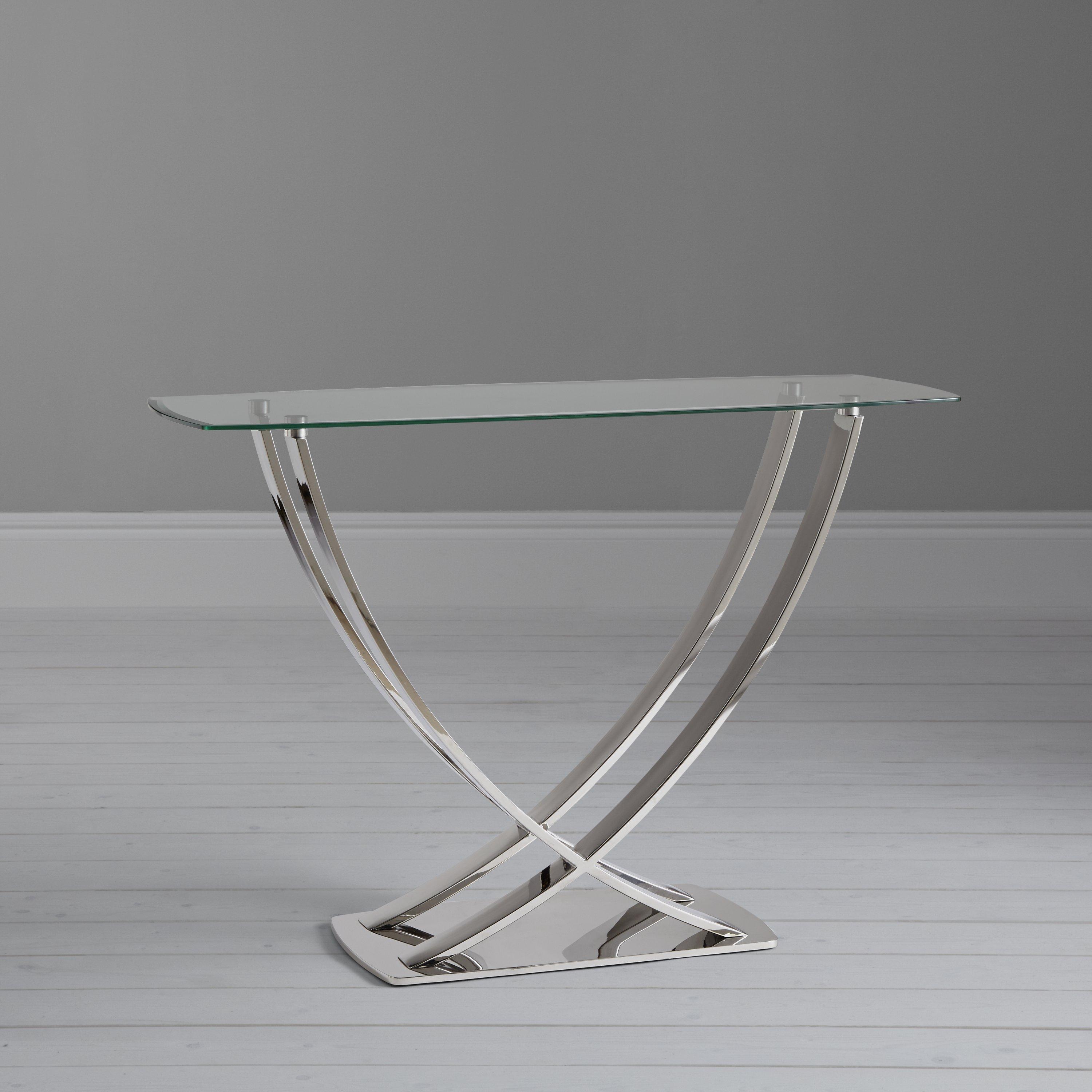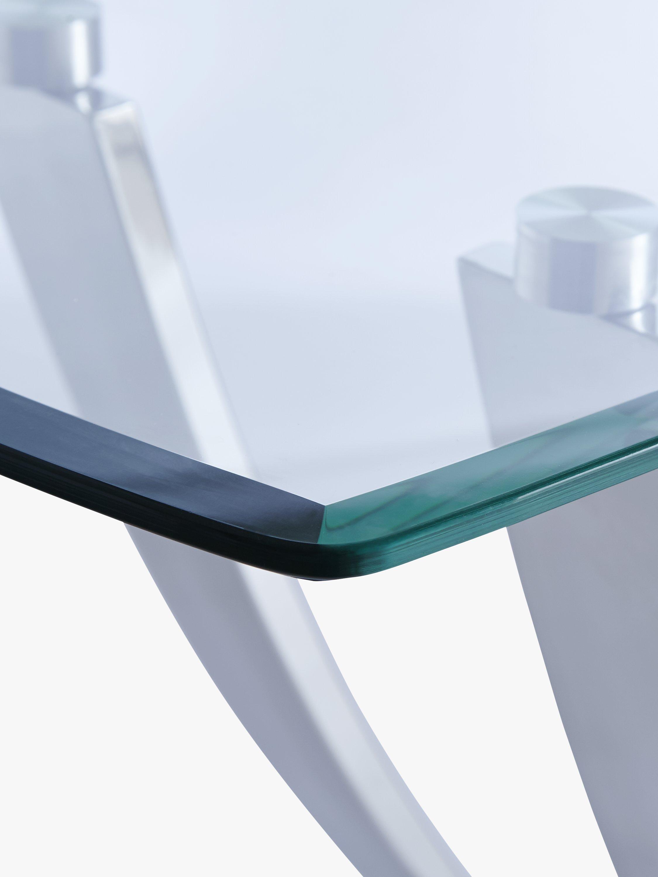 Part of our elegant Hotel theme, the Moritz console table features a tempered glass top with bevelled edges sitting atop a polished stainless steel base. This graceful, lustrous table makes the a perfect standalone table, or a gorgeous complement to other pieces from our Moritz collection